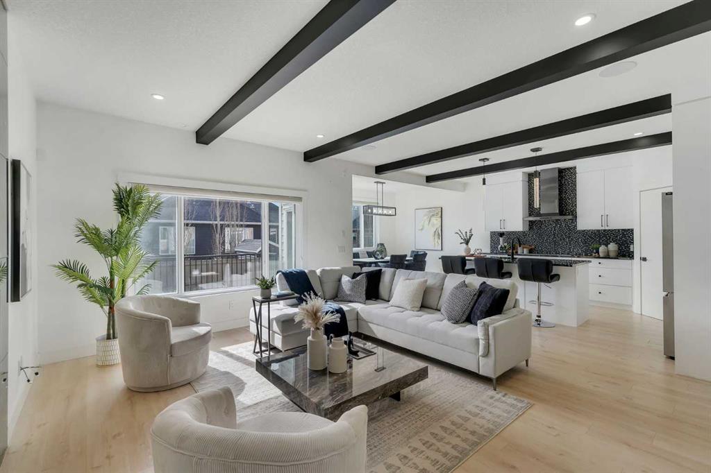 The chef-inspired kitchen is beautifully upgraded with built-in appliances, a chimney-style hood fan, ceiling-height cabinetry, and sleek black hardware throughout. The living room showcases a striking feature fireplace with bold black tile detailing, adding warmth and sophistication. Large windows across the main floor allow for an abundance of natural light, while the elegant spindle railing enhances the overall design.