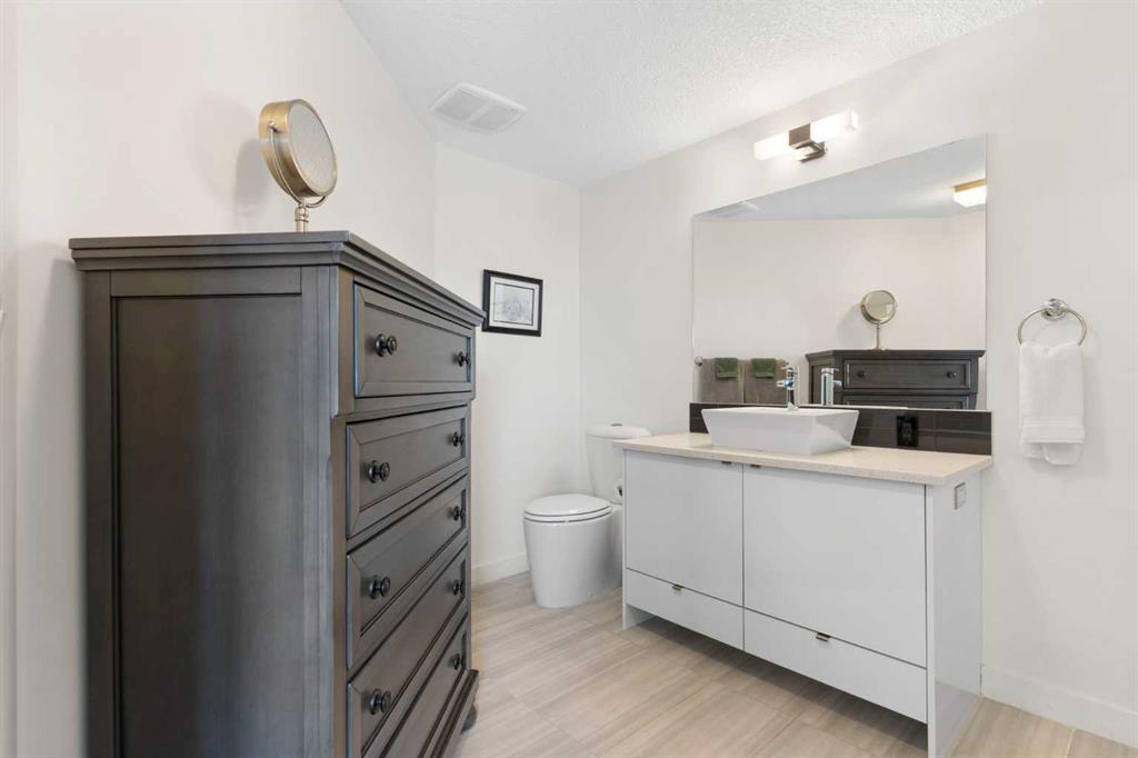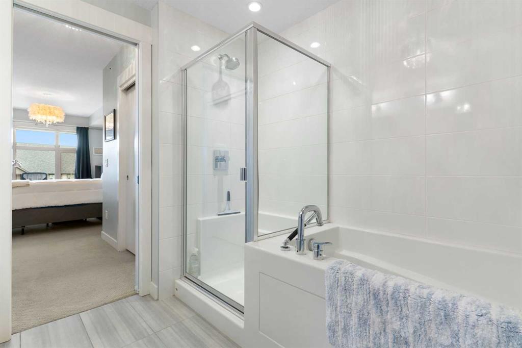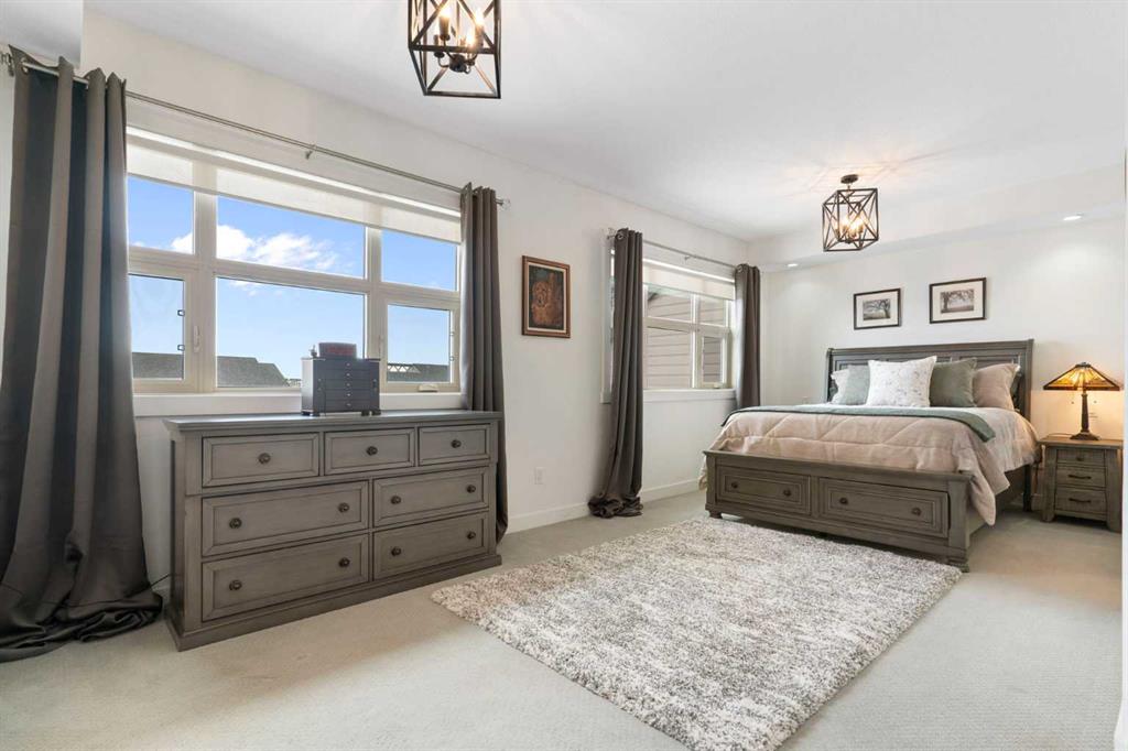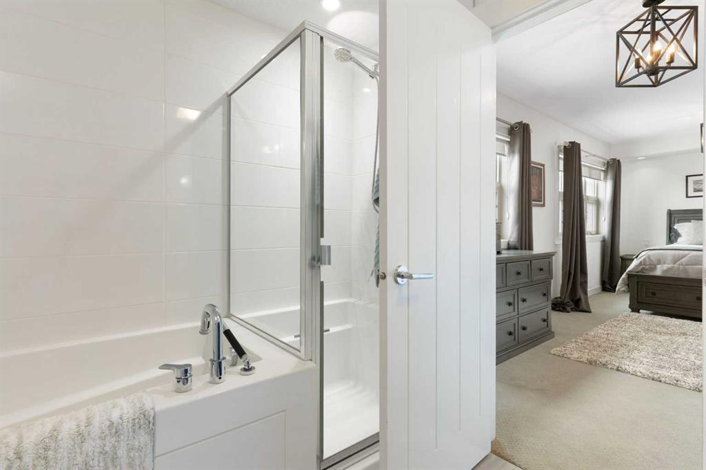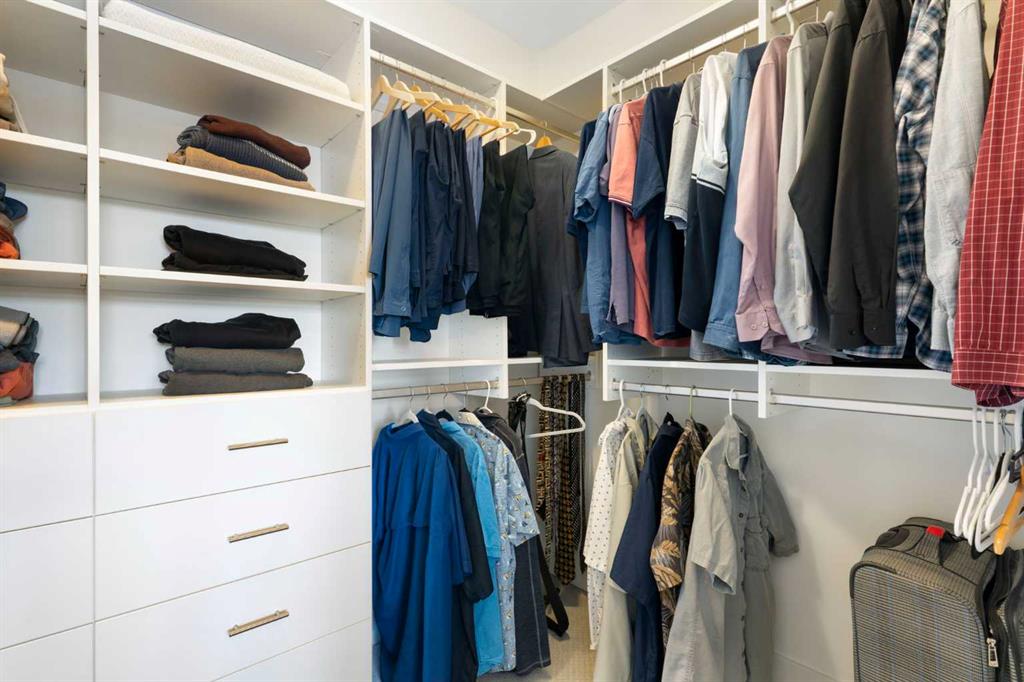 The upper floor is dedicated to a second spacious primary suite, offering added privacy and flexibility. This level includes a large walk-in closet with built-in closet organizers and a well-appointed ensuite featuring a soaker tub and walk-in shower.