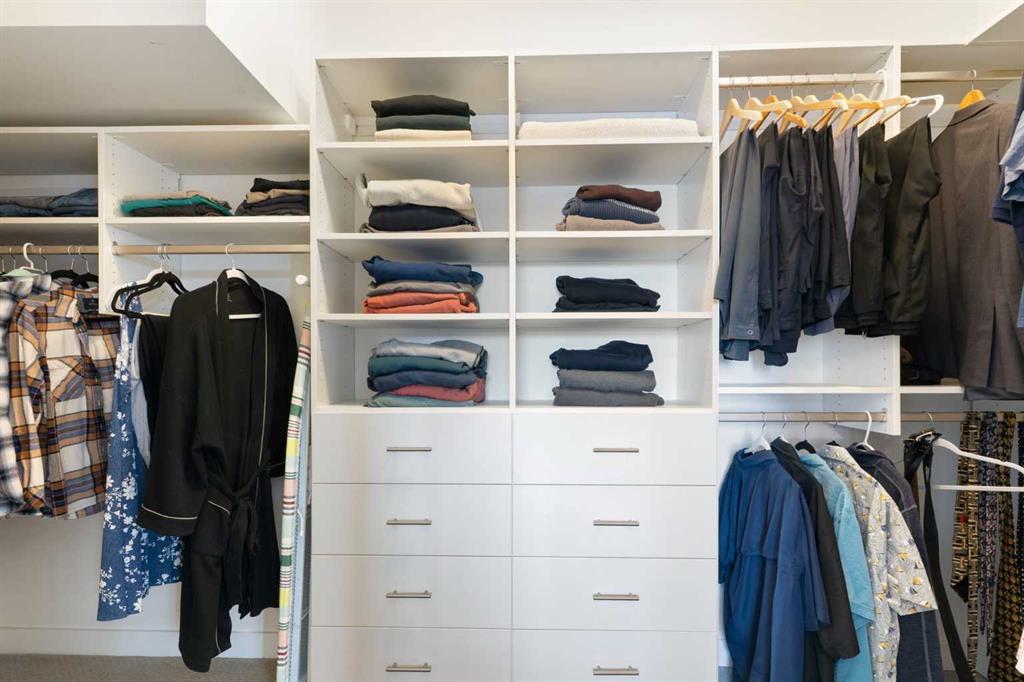 Also on the main floor is the first of two primary bedrooms. This room features a walk-through closet with built-in closet organizers leading to a private ensuite complete with a walk-in shower, soaker tub, and dual vanities. A powder room and a laundry room with additional storage complete the main level.