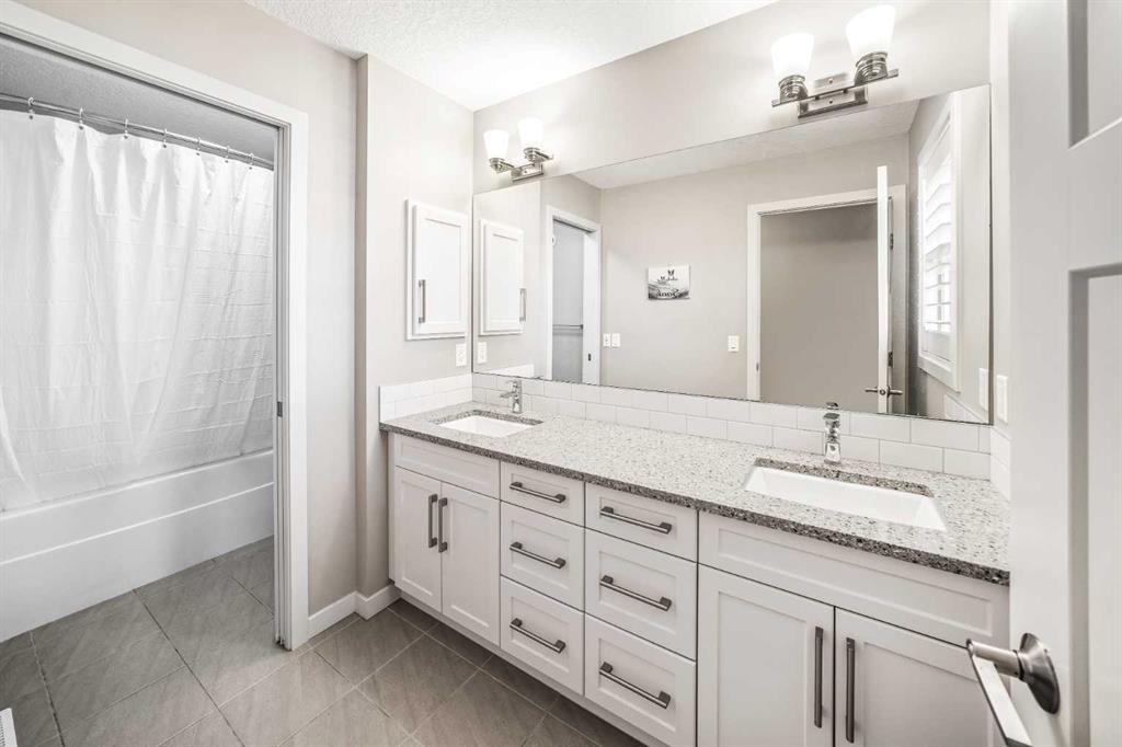 Upstairs, a bright and spacious bonus room provides a versatile retreat for work or play. The primary suite feels like a private sanctuary with dual walk-in closets and a spa-inspired ensuite featuring quartz-topped double vanities and a deep soaker tub. Two additional bedrooms share a beautifully designed bathroom with double sinks and a separate shower and toilet area, offering both function and privacy for family or guests. Upper-level laundry completes the space, ensuring that practicality meets elegance at every turn.
