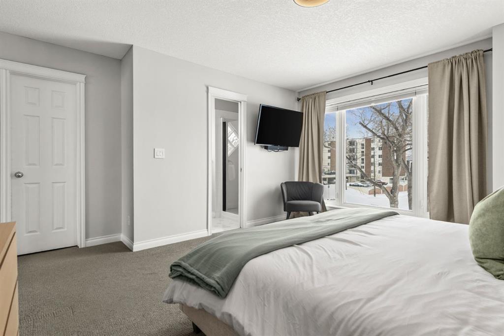 French doors lead to the show-stopping outdoor space — a private patio that wraps around to stairs leading up to the massive rooftop terrace, perfect for entertaining, relaxing, and enjoying the surrounding views. Upstairs you’ll find two well-sized bedrooms, two full bathrooms, and convenient upper-floor laundry. The primary suite is generously sized with large windows overlooking the park, an updated ensuite bathroom, and a walk-in closet.