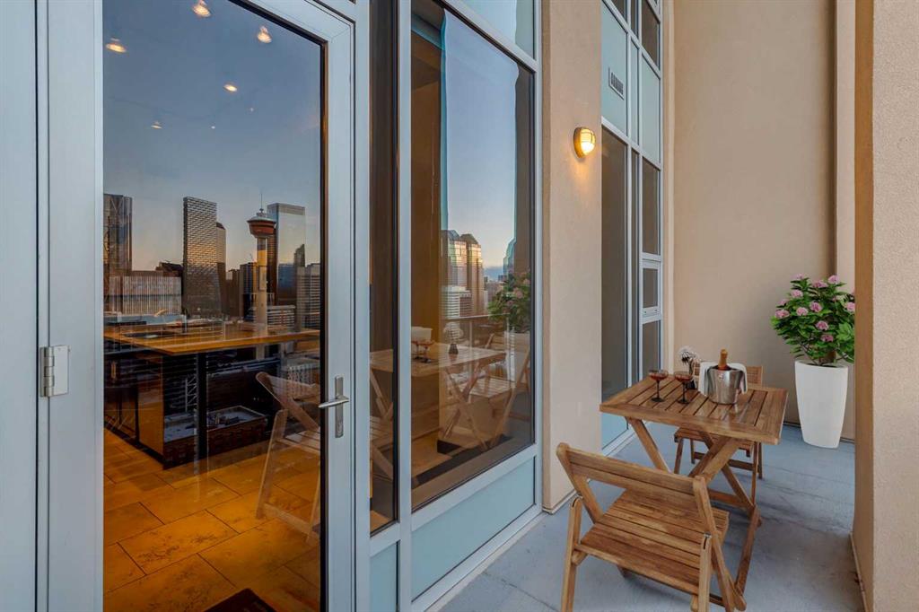 The main level opens with a WELCOMING FOYER, in-suite storage, + a 2 PC BATHROOM, all enhanced by HEATED PORCELAIN TILE FLOORS that elevate both comfort + style. The OPEN-CONCEPT LIVING ROOM is framed by TOWERING NORTH-FACING WINDOWS, while an INTEGRATED WET BAR elevates your ENTERTAINING EXPERIENCE - perfect for hosting Friends + Family. NATURAL LIGHT floods the space, highlighting the SEAMLESS CONNECTION between the living, dining, + kitchen areas. The CHEF-INSPIRED KITCHEN features a BERTAZZONI PROFESSIONAL SERIES GAS RANGE, BOSCH REFRIGERATOR, BOSCH BUILT-IN MICROWAVE, BOSCH DISHWASHER, sleek cabinetry, + a PANTRY WITH WOOD SHELVING for added functionality. Casual dining is easy at the BREAKFAST BAR. OVERSIZED GLASS DOORS open to a 20'10" x 6'5" PRIVATE BALCONY w/ GAS LINE - your front-row seat to PANORAMIC DOWNTOWN VIEWS, glowing sunsets, and Calgary’s iconic skyline.