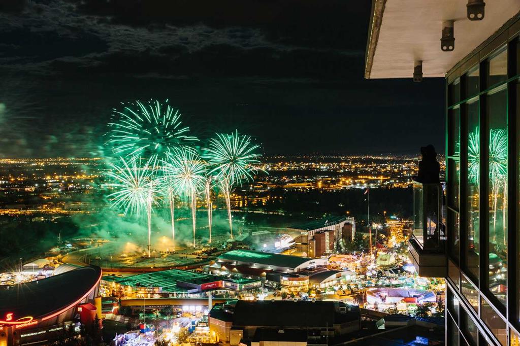 Welcome to this spectacular 2-bedroom, 2-bathroom residence perched on the 31st floor of the prestigious Guardian South Tower. Offering one of the most impressive vantage points in the building, this sky-high home features sweeping, uninterrupted views of the Stampede Grounds, Saddledome, the new BMO Centre, Elbow River, downtown skyline, and Calgary’s future entertainment district. From breathtaking sunrises to the glow of Stampede fireworks, the panorama from this elevation is truly unmatched. Designed to maximize light and livability, the open-concept floor plan is wrapped in floor-to-ceiling windows, creating a bright and airy atmosphere throughout. The modern kitchen features sleek cabinetry, integrated appliances, and quartz countertops, flowing seamlessly into the living and dining areas — perfect for hosting or unwinding with the cityscape as your backdrop. The primary bedroom offers its own private retreat with an ensuite and ample storage, while the second bedroom is ideal for guests, extended family, or a dedicated office. Thoughtful separation between the bedrooms enhances privacy and functionality. A private balcony allows you to take full advantage of the 31st-floor views. Residents enjoy exclusive access to premium building amenities, including a fully equipped fitness centre, resident lounge, workshop, and professional concierge service. A titled underground parking stall is included for your convenience. Set in one of Calgary’s most exciting districts, you are steps from the Central Library, Studio Bell, East Village, Inglewood, Stampede Park, new event facilities, cafés, transit, the river pathways, and the downtown core. This is urban living at its very best. Whether you are seeking a luxurious inner-city home or a strong investment with excellent rental potential — including corporate stays or short-term rental opportunities — this residence delivers unmatched views, refined finishes, and an unbeatable location.