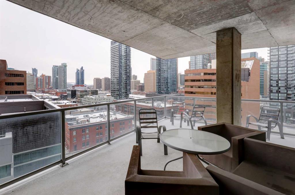Welcome to this beautiful, modern 2 bedroom, 2 bathroom Premium Beltline condo featuring panoramic views to the north & west and titled parking stall and storage unit. Spanning 1,116 sqft, the sophisticated corner layout is framed by floor-to-ceiling windows capturing sweeping sunset, mountain and city skyline views. A huge, almost 300 sqft patio, is an entertainer’s dream, ideal for summer barbeques, morning coffee or evening cocktails under Calgary’s glowing skies. Inside we have a sleek open-floorplan with luxury vinyl plank and tile flooring throughout, quartz kitchen countertops, 9 ft ceilings, stainless steel appliances, a wine fridge and convenient office/study corner with built-in desk and cabinets. The kitchen overlooks the living area with spacious countertop and cabinet space, pantry and stainless steel appliances. The serene primary suite features a generous walk-in closet and spa-inspired ensuite with dual sinks, while the second bedroom offers ideal flexibility for guests, roommates or a home office with its own access to a full bathroom. In-suite laundry and central A/C are an added bonus. Castello is one of Calgary’s premier executive buildings, offering residents a fitness centre, guest suite, concierge services, car wash, bike rack area and pets are welcome (with restrictions). Perfectly located in the heart of the Beltline, you’re steps from 17th Ave and 4th Street restaurants, shops and vibrant nightlife.