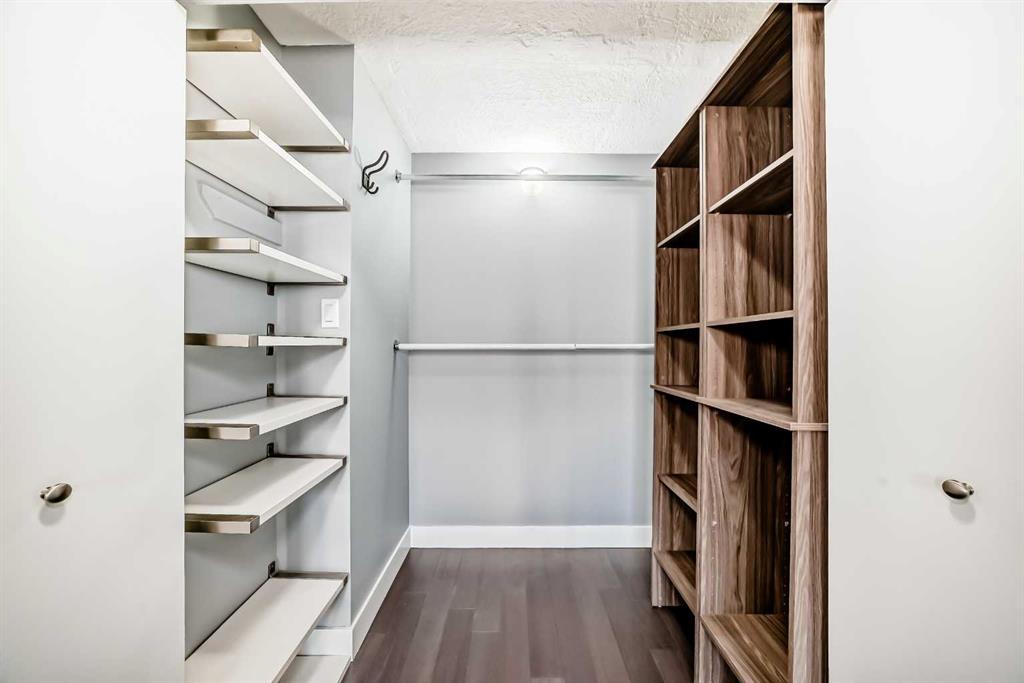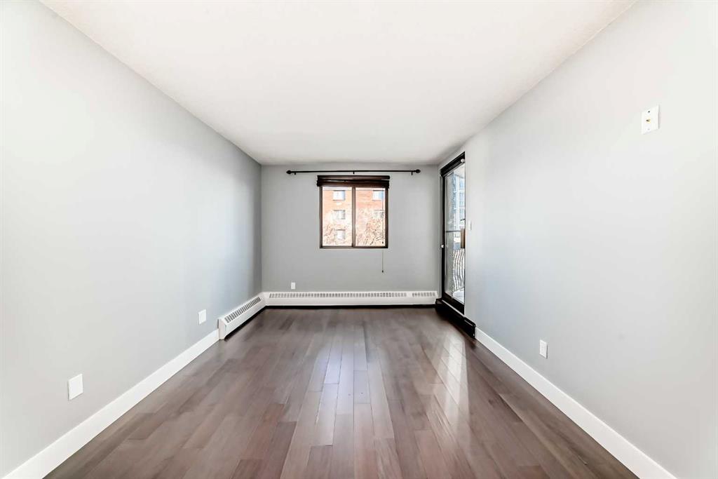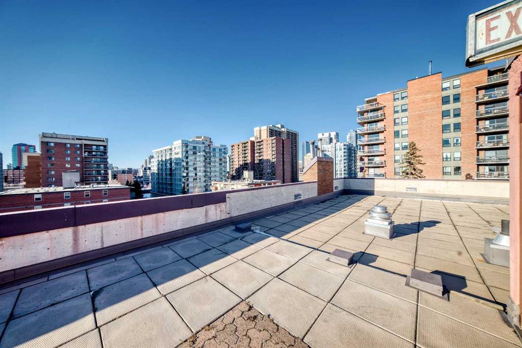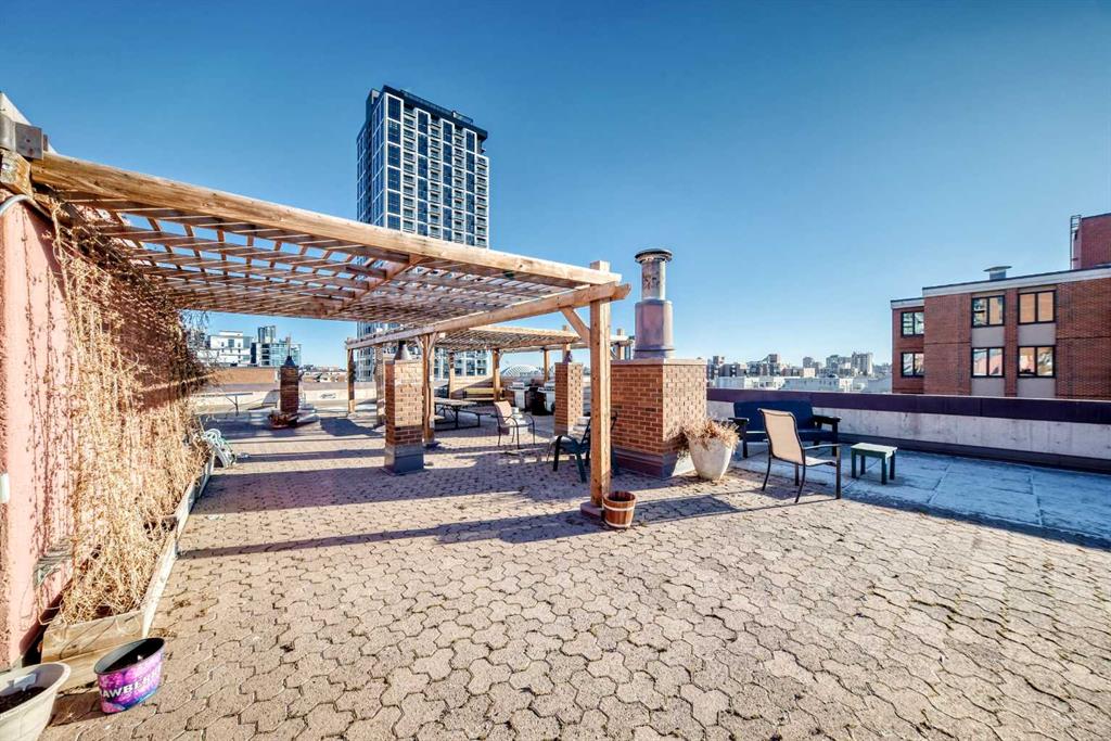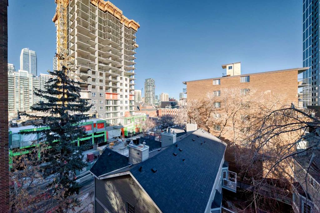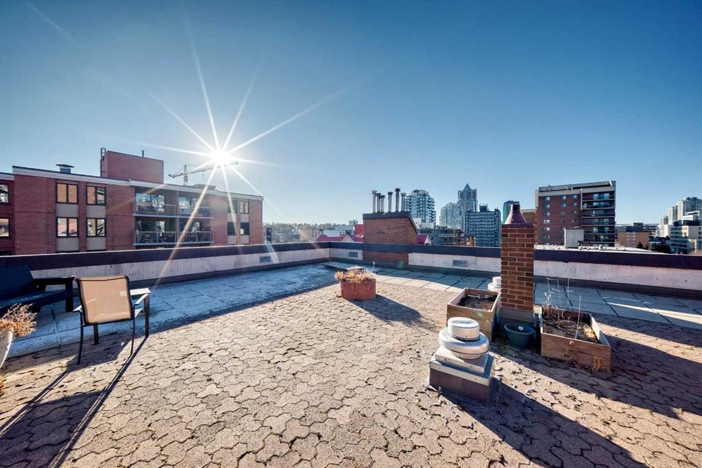 Experience inner-city living at its finest in this beautifully renovated condo offering breathtaking city views. Thoughtfully updated with the urban executive in mind, this residence showcases a sleek, modern design throughout. The kitchen is a standout, featuring quartz countertops, upgraded stainless steel appliances, a stylish upgraded faucet, and newer cabinetry that seamlessly flows into a spacious dining area—perfect for hosting. The generously sized living room is warm and inviting, highlighted by hardwood flooring, a natural gas fireplace, and patio doors that open to the outdoors, creating an ideal space for both relaxing and entertaining. This home offers two large bedrooms, including a spacious primary retreat complete with a walk-in closet featuring custom built-ins and direct access to the impressive 22-foot oversized balcony. The fully renovated four-piece bathroom is finished with a contemporary vanity and modern touches. Additional conveniences include a large in-suite storage room with washer and dryer, knockdown ceilings, updated lighting, and fresh paint throughout. Residents also enjoy access to a spectacular rooftop patio with panoramic 360-degree city views. The parking stall is exceptionally well-located as an end space, offering ample clearance and accommodating oversized vehicles. Lovingly maintained and move-in ready, this exceptional condo is truly a rare find. Need additional parking? Possibility to rent additional stalls. Call today to book your private viewing of this inner-city gem. This is a pet friendly building, both cats and dogs welcome!