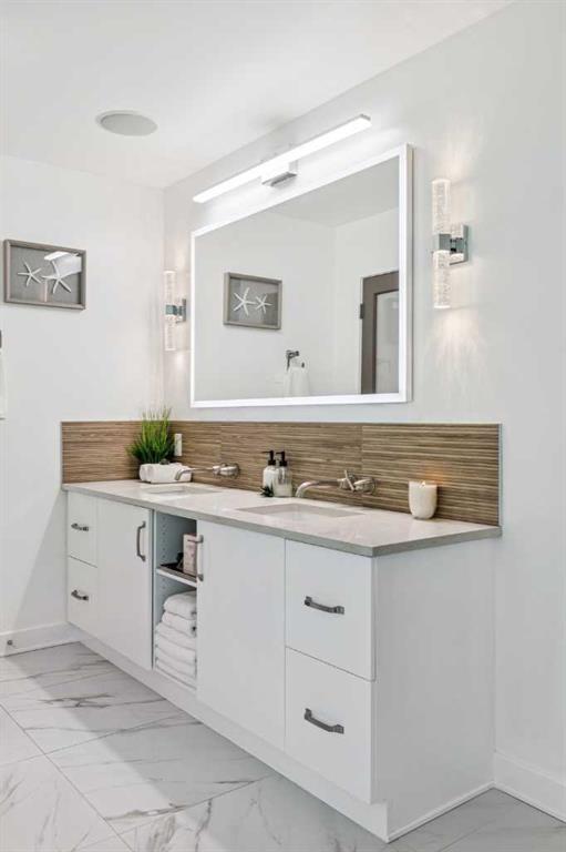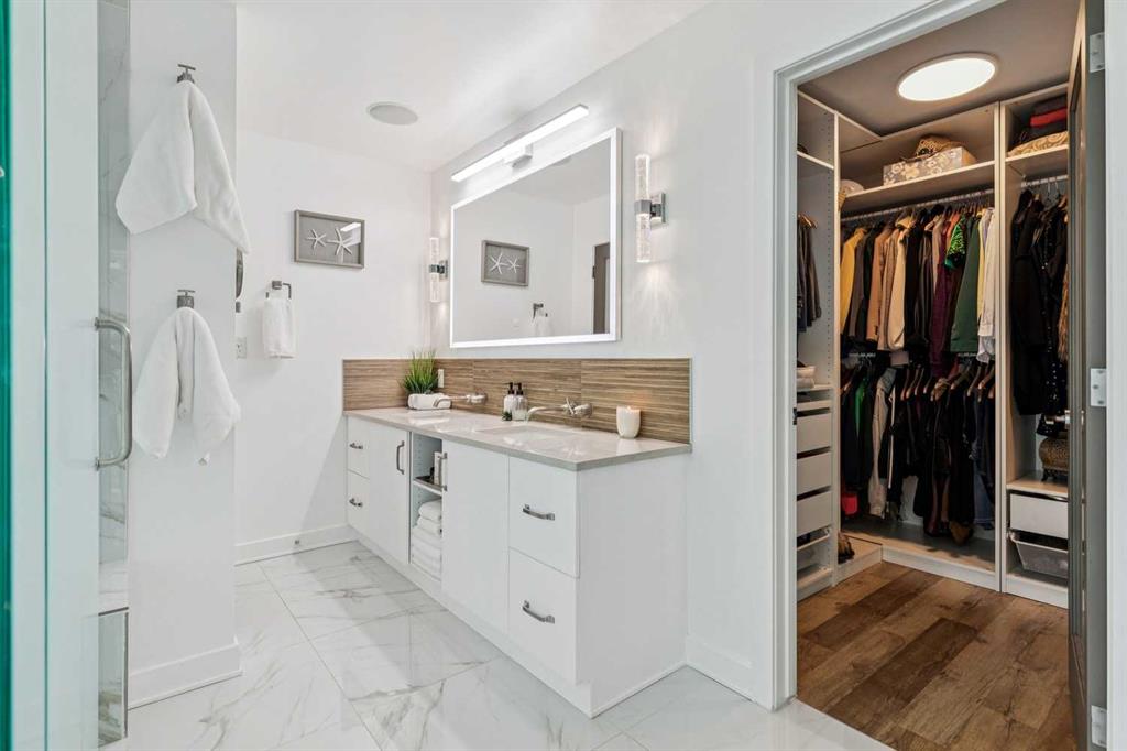 The generously sized master bedroom offers a luxurious 4-piece ensuite with all-new lighting, mirror, tile floors and backsplash, painted cabinetry with fresh hardware, and a beautifully tiled shower with updated fixtures. A large walk-in closet features smart organization systems for added convenience. The second bedroom is equally spacious, complete with new lighting and zebra blinds.