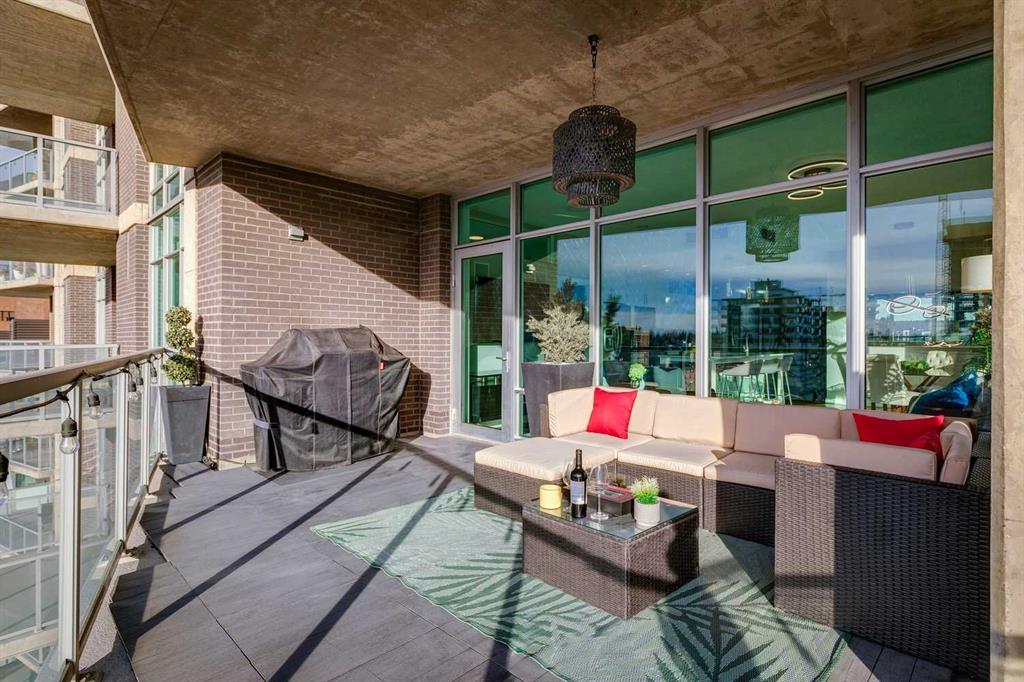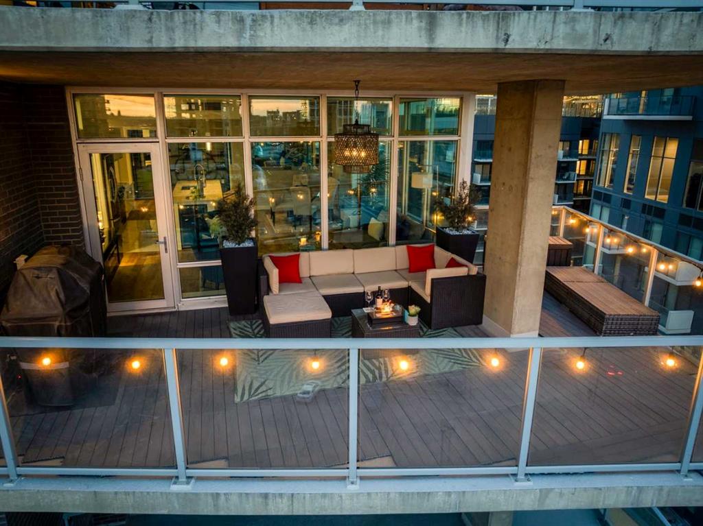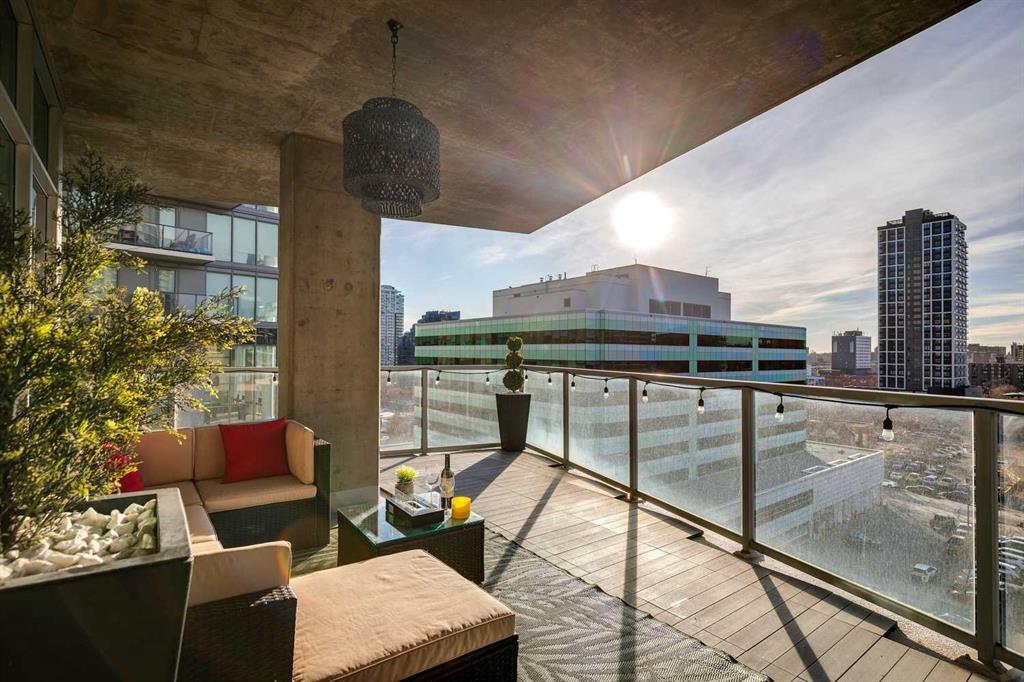 The spacious living room showcases floor-to-ceiling windows with brand new motorized zebra blinds and direct access to a massive covered wraparound patio (almost 300 square feet) perfectly extending your living space for entertaining or relaxing while enjoying stunning south facing Beltline views.