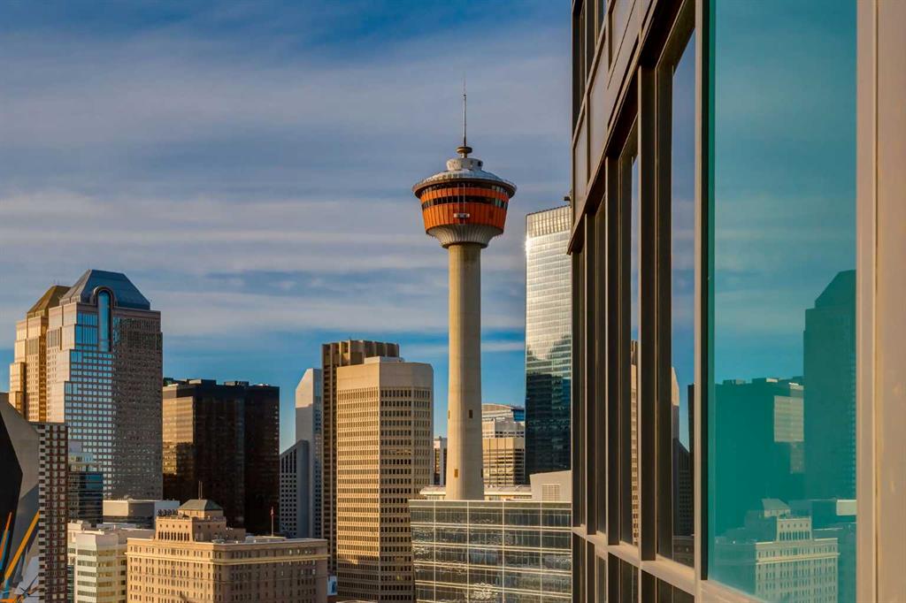 Enjoy unobstructed, panoramic views from this one bedroom, one bathroom residence perched on the 25th floor of Keynote Two. This bright, air conditioned home features 9 foot ceilings, hardwood flooring, stone countertops, stainless steel appliances, and convenient in suite laundry. Floor to ceiling windows frame spectacular views of the Saddledome, downtown skyline, and the Rocky Mountains beyond.