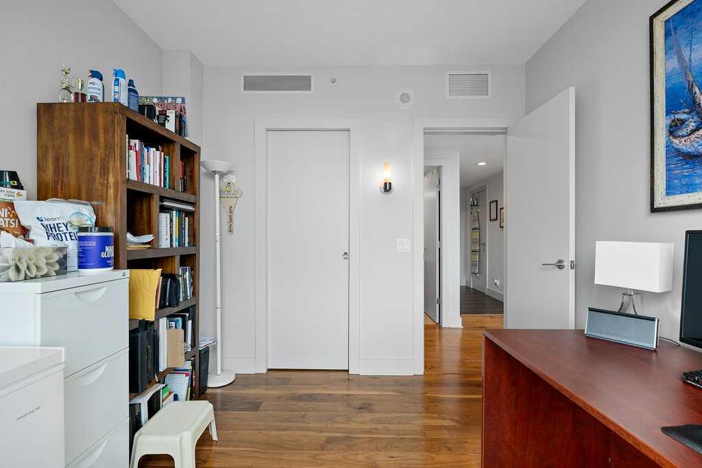 Hardwood flooring runs throughout, and central air conditioning ensures year-round comfort. The bright south-facing primary suite offers sweeping views, a walk-in closet, and a stylish 4-piece ensuite. A second bedroom with its own walk-in closet and oversized windows is thoughtfully located on the opposite side of the unit next to the second full bathroom—perfect for guests, roommates, or a home office setup.