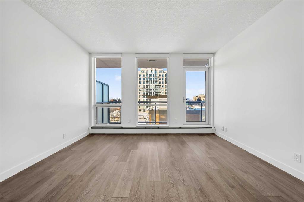 Inside, the bright and thoughtfully designed open-concept layout is enhanced by soaring 9-foot ceilings and sleek custom laminate flooring throughout. The contemporary kitchen is both functional and elegant, featuring pristine quartz countertops, high-end stainless steel appliances (a new dishwasher was recently installed), and ample space for cooking and entertaining. The living area flows seamlessly to an expansive southwest-facing balcony—perfect for soaking up Calgary’s sunshine and enjoying warm evenings with city views.