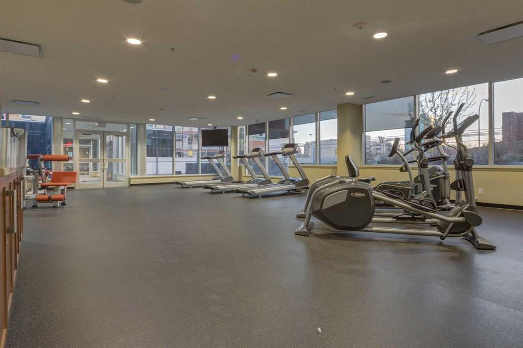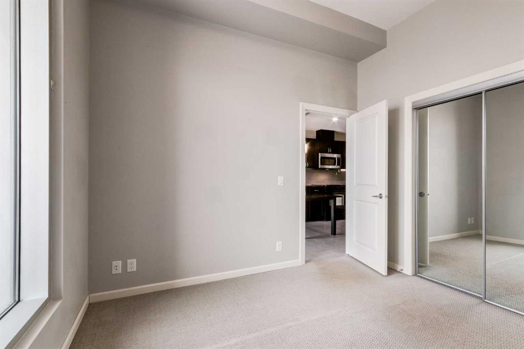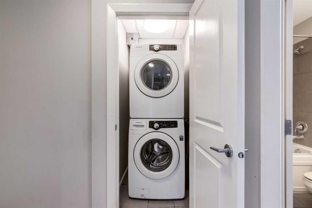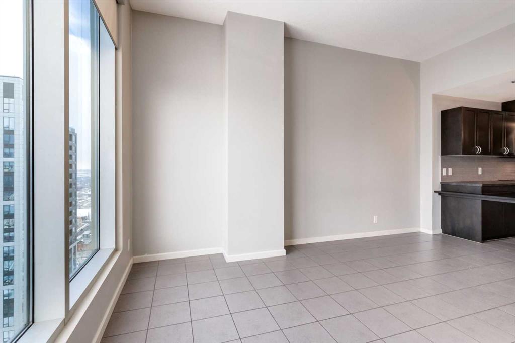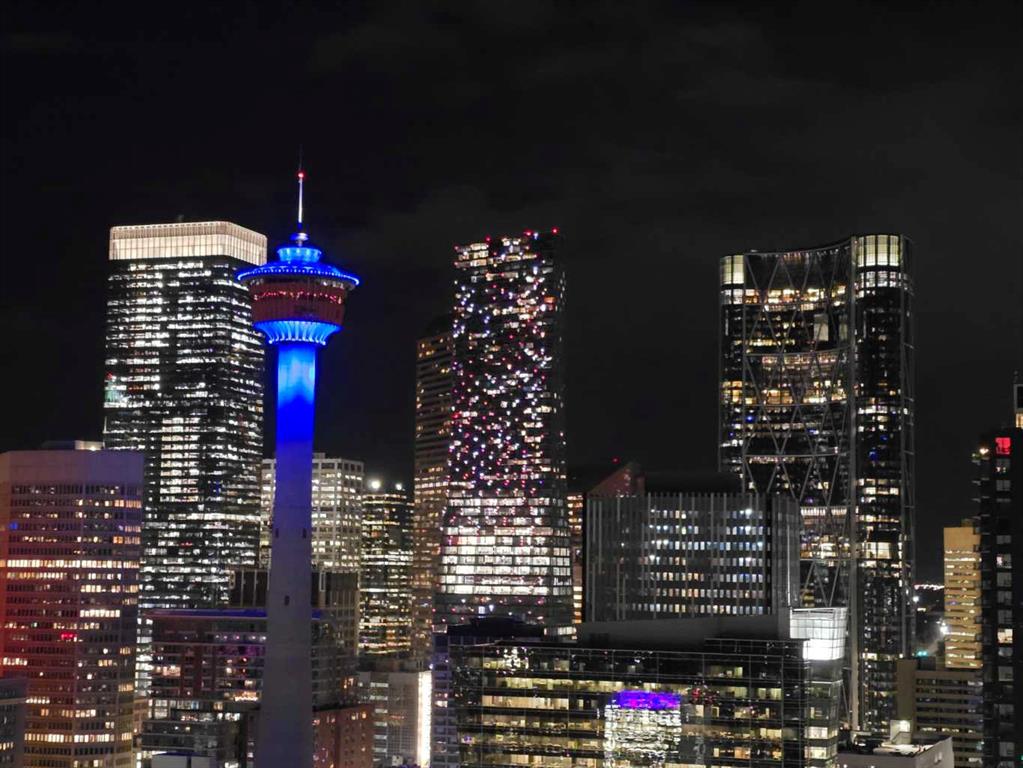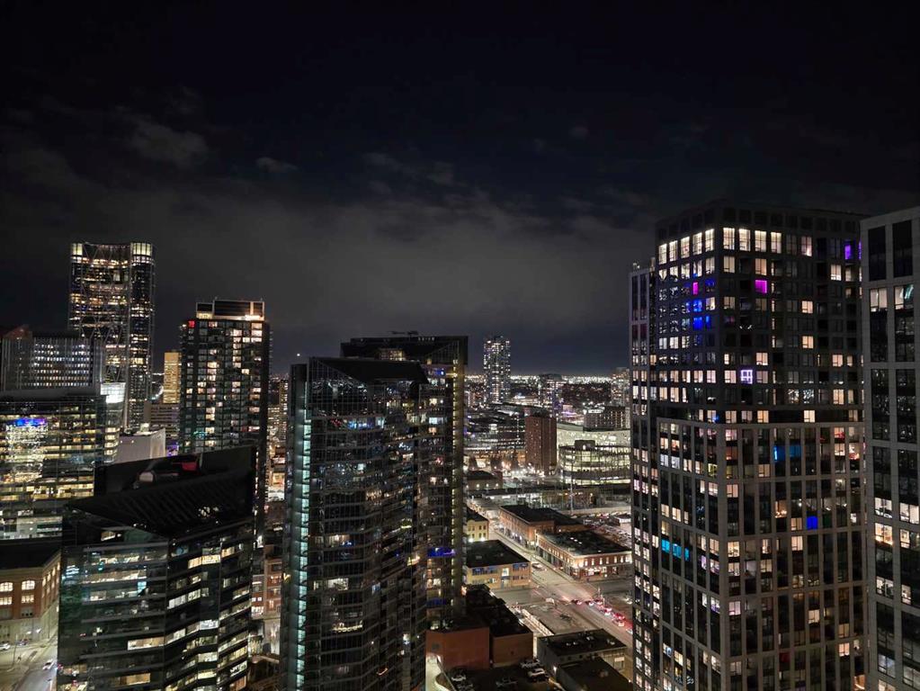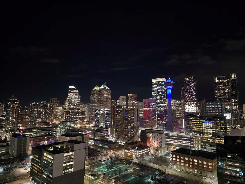 Spectacular Downtown Skyline Views from the 27th Floor! Welcome to this stylish 1-bedroom, 1-bathroom condo offering 589 sq. ft. of modern living space in the desirable Nuera building. Perched on the 27th floor, this home showcases breathtaking 180-degree downtown skyline views, including the Calgary Tower, through stunning floor-to-ceiling windows. The open-concept layout is bright and functional, seamlessly connecting the living and dining areas. The contemporary kitchen features mocha-stained maple cabinetry, mosaic tile backsplash, under-cabinet lighting, and built-in dining table that doubles as a workspace. Step onto your private balcony to enjoy the vibrant city views, or wake up to the skyline from the spacious primary bedroom. Additional highlights include in-suite laundry, a storage locker, and a titled heated underground parking stall. Nuera offers a fully equipped fitness centre and smart HVAC air circulation technology. Ideally located steps from downtown, the BMO Centre, LRT, and the shops and restaurants of 17th Avenue, this home delivers the ultimate inner-city lifestyle.
