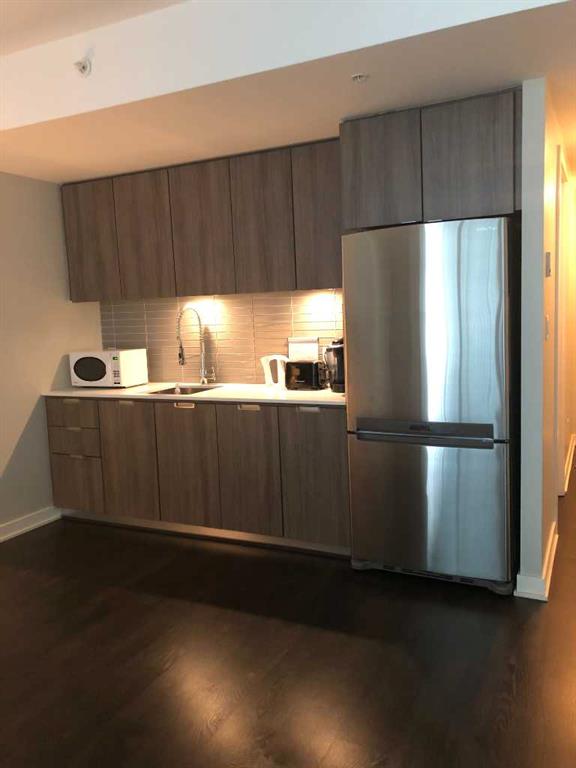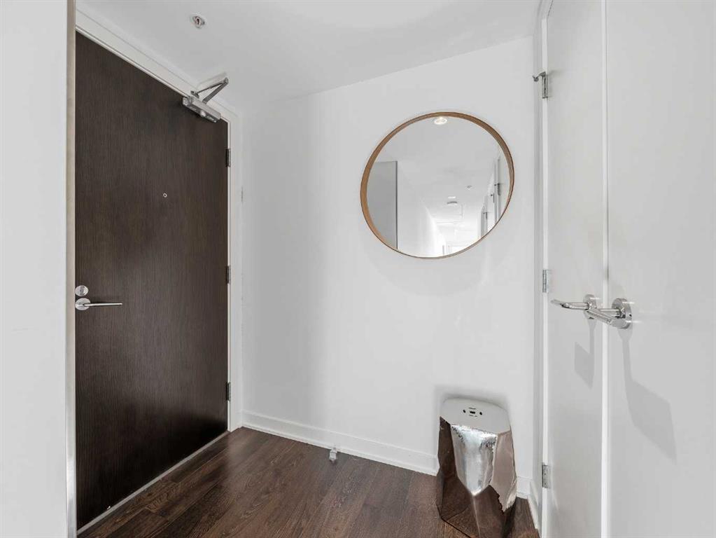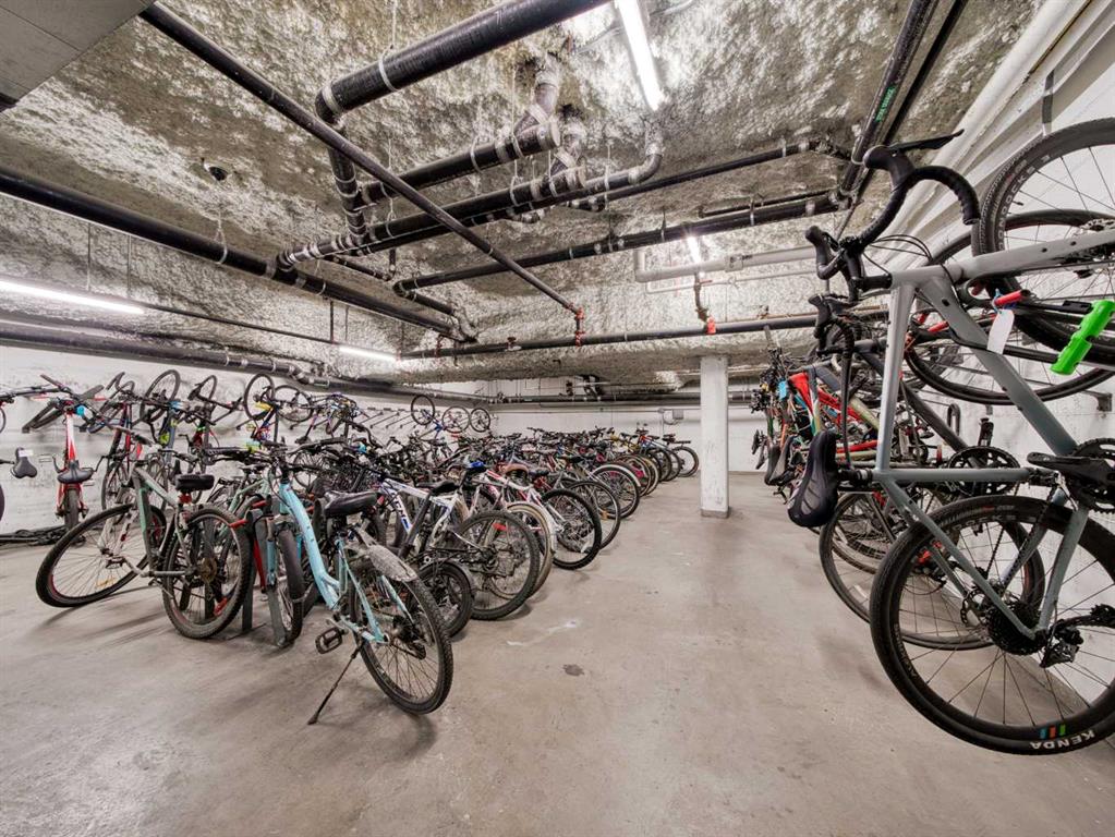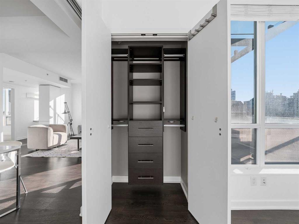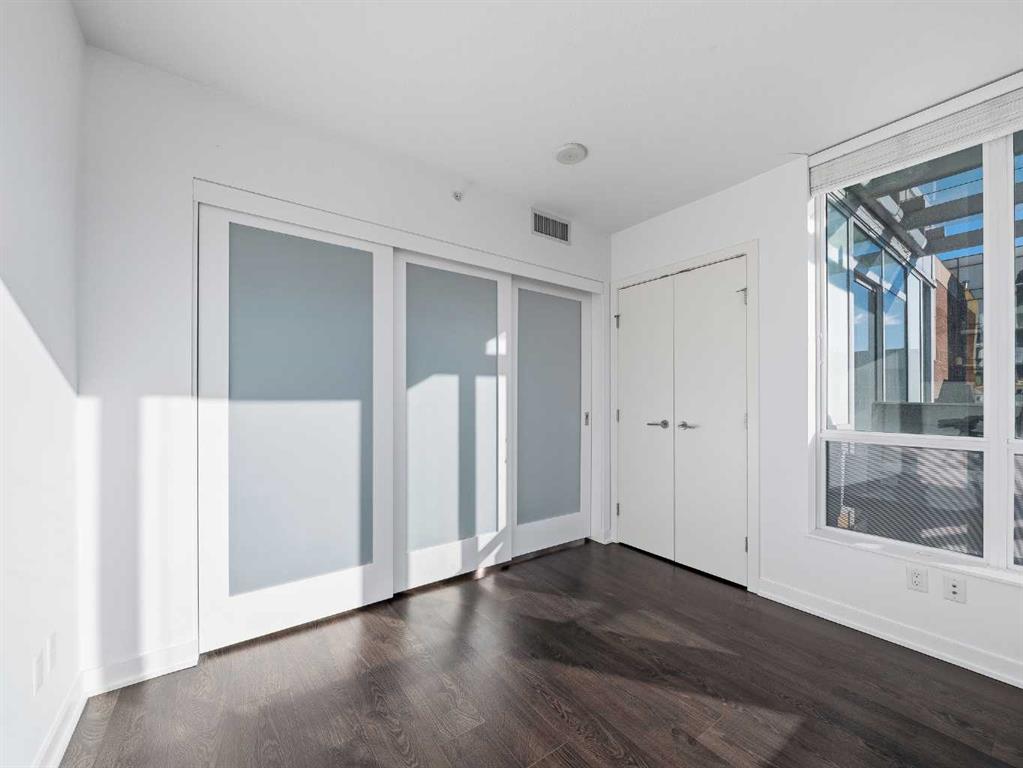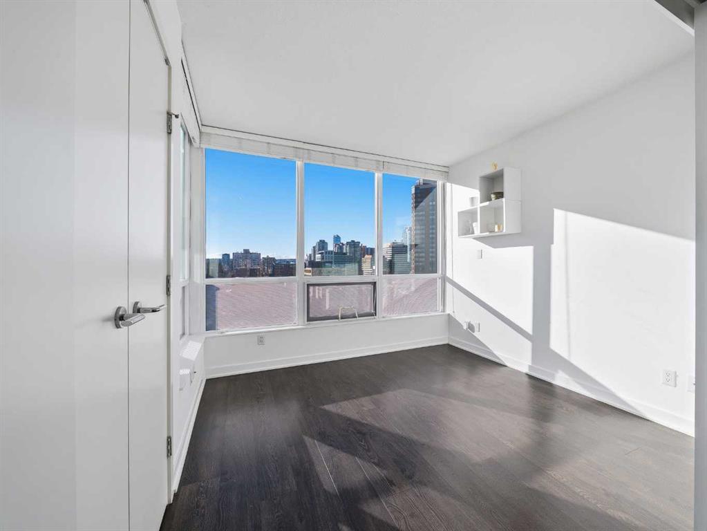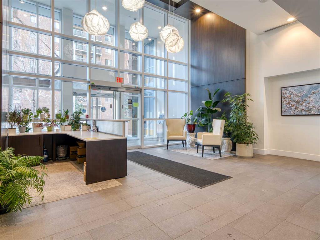 The second bedroom features floor-to-ceiling windows and can serve as a guest room or office. Flooring includes laminate throughout, carpet in the primary bedroom, and tile in both bathrooms.The balcony offers excellent city views and enough space for a patio set, with barbecues permitted. Additional features include in-unit storage near the entrance, a same-floor storage locker, and a titled heated underground parking stall. The building also provides heated visitor parking and bicycle storage, with convenient 2-hour street parking out front. Building amenities include a fitness centre, yoga studio, guest suite (available for $75/night), and concierge from Tuesday through Saturday for deliveries and added security and convenience. A well-designed, quiet, and spacious unit in one of downtown Calgary’s most desirable buildings.