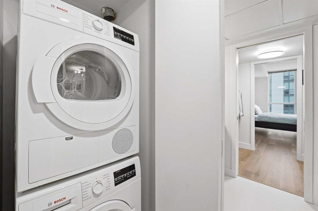 This beautiful WELL-MAINTAINED condo offers a stylish OPEN - CONCEPT layout designed for both everyday living and entertaining. The kitchen features granite countertops and an oversized eating bar that flows seamlessly into the dining nook and living area. ENGINEERED HARDWOOD flooring throughout the main living spaces adds a modern yet HOMEY finish. Step outside to your covered balcony with solid sides — a PRIVATE outdoor space you can truly enjoy year-round. Inside the bedroom, LARGE WINDOWS showcase downtown city lights, while the WALK-THROUGH CLOSET leads to the cheater ensuite. This unit includes a NEW UPGRADED BOSCH IN-SUITE washer/dryer set, AIR CONDITIONING, a UNDERGROUND TITLED PARKING STALL, and a STORAGE LOCKER located in the heated underground parkade. The building is exceptionally WELL RUN and offers a full suite of amenities, including 24-HOUR CONCIERGE ensuring security, a fully equipped GYM, party room, large BIKE STORAGE AREA, guest suites, and underground VISITOR parking. Located in one of Calgary’s most vibrant inner-city neighbourhoods, you’re surrounded by some of the city’s best restaurants, cafés, and nightlife, with trendy 17th Avenue just steps away. CO-OP is only ONE BLOCK OVER for everyday convenience and groceries, while nearby parks and the Bow River pathway system make it easy to enjoy an active, outdoor lifestyle. It also has excellent access to transit and major routes — including Bow Trail for quick escapes west to the mountains. This is a well-maintained condo in a prime inner-city location, offering lifestyle, convenience, and long-term value.