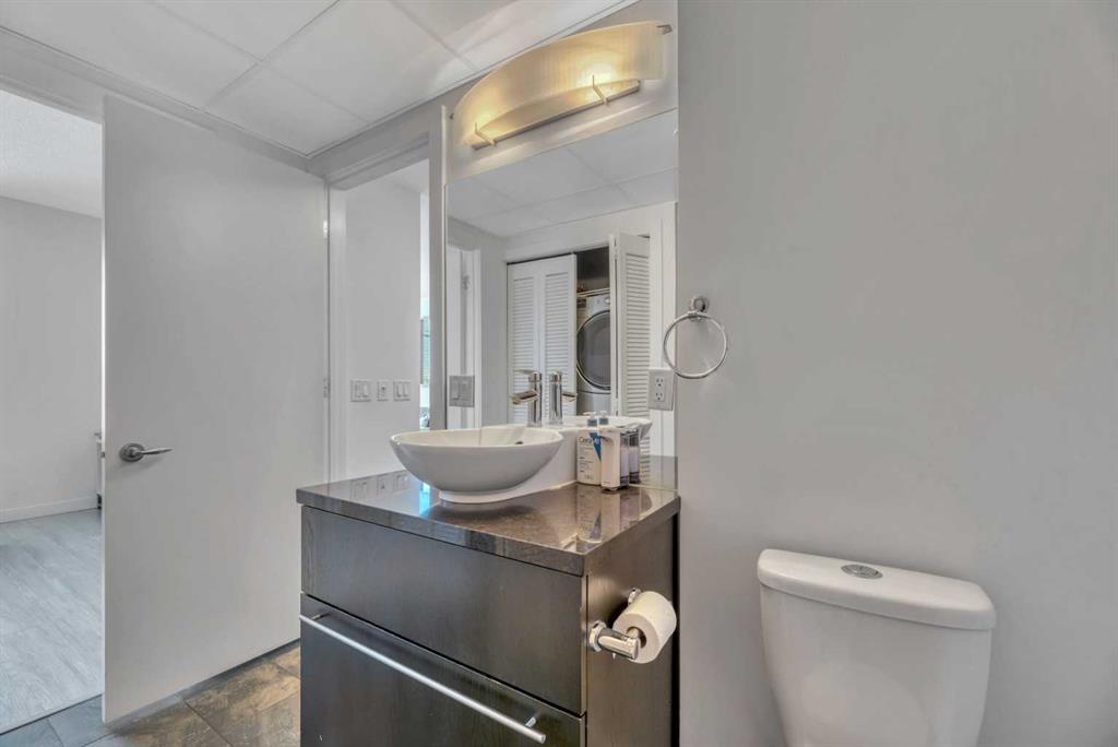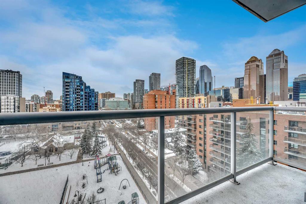 DESIRABLE NW CORNER 2 BEDROOM, 2 BATH UNIT, FLOOR TO CEILING WINDOWS with 9 foot CEILINGS. Enjoy the 270 degree views spanning the downtown skyline, Haultian Park and the mountains. Very desirable location with the west views directly overlooking the park-enjoy an evening beverage from the covered balcony or BBQ using the convenient gas line. The bedrooms are separated by the living room, at opposite ends of the condo, for added privacy Excellent finishing inside the unit with granite counters, eating bar area, glass backsplash and SS appliances(fridge less than 2 years old). Enjoy warm summer nights with comfortable central AC, and park conveniently in the heated underground parkade, with additional storage. Classy corner, primary bedroom with an enormous walk in shower. The second bedroom is a wonderful option as a bedroom or a home office with a view. Laminate and tile floors are easy to clean and durable. In suite laundry in a closet as part of the main bath is both functional and practical. Ideal location with only a 15 minute walk to the downtown core, steps away from restaurants, shops, C-train and Stampede Park venues. All this and a park, playground, updated tennis courts right out your door makes inner city living at UNION SQUARE feel like home.