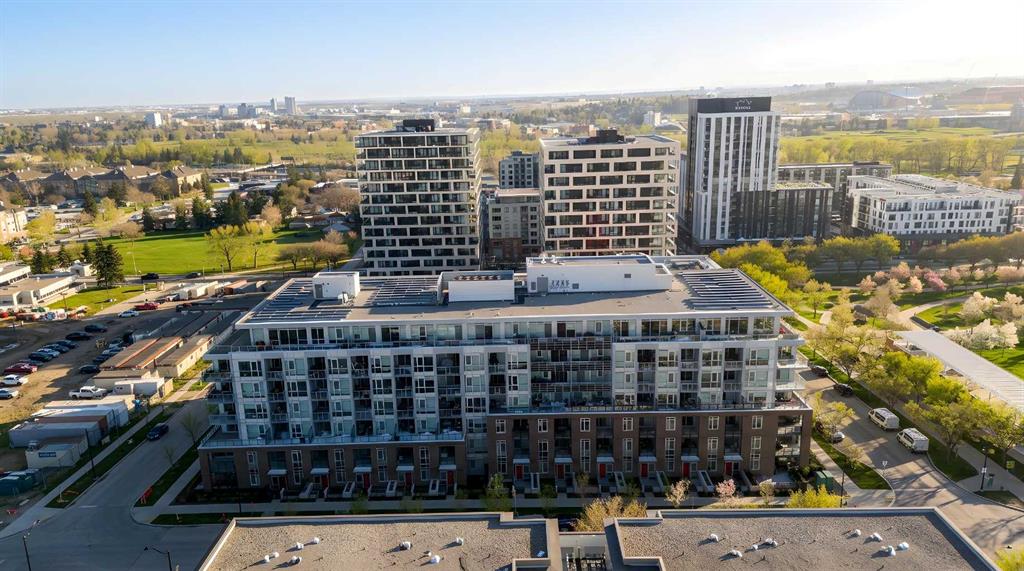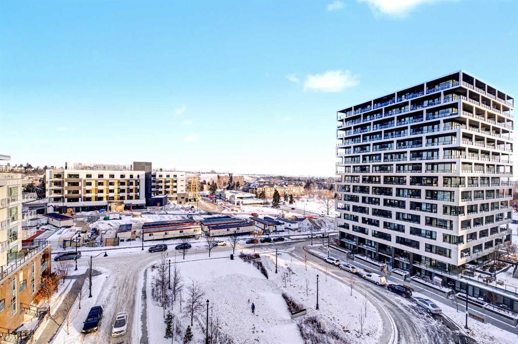 The interior is shaped by light, efficient geometry and has central AC. Concrete construction ensures a quiet environment, while floor to ceiling windows and high ceilings create a sense of volume that belies the square footage. The kitchen is anchored by a Bosch GAS RANGE and a Fisher & Paykel refrigerator, finished with beautiful quartz countertops. The layout transitions seamlessly into the living area, where a built-in Murphy bed offers clever flexibility for guests or a home office setup. The primary suite is a private retreat, highlighted by a modern, spa inspired ensuite featuring a double vanity with quartz countertops, sleek wood cabinetry, and a glass enclosed shower with marble style tile. Beyond the unit, the building prioritizes convenience; storage is located just down the hall on the same floor, and the LEED Platinum certification reflects a high standard for air quality and energy efficiency. Residents of Radius Bridgeland by Bucci enjoy a wide range of thoughtfully designed amenities throughout the building. The 7th floor features a rooftop patio with impressive views, while the 5th floor includes storage units, and the Spin Bike Room. The 4th floor offers a dedicated yoga room, and the 2nd floor includes the convenient Spud Room for parcel deliveries. On the main floor, residents have access to a fully equipped fitness centre and a concierge.