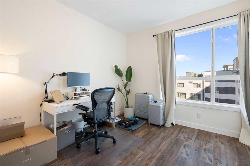 Top-floor end unit with unobstructed downtown views in the heart of Bridgeland. This quiet and secure 2 bedroom, 2 bathroom plus den condo offers the perfect blend of style, function, and location. With no one living above you, enjoy added privacy and natural light throughout the bright, open floor plan. Hardwood floors run through the main living spaces, while the kitchen features granite countertops, ample cabinetry, a breakfast bar, pantry, and stainless steel appliances including a new dishwasher. The den with French doors provides an ideal home office or flexible bonus space. The open concept living and dining room includes a cozy corner gas fireplace and a west-facing balcony with stunning city views. The two spacious bedrooms are located on opposite sides of the unit, ideal for privacy. The generous primary suite features a walk-through closet and 4-piece ensuite, while the second bedroom sits conveniently beside the main 4-piece bath. Additional features include in-suite laundry with full-size washer and dryer, assigned parking and storage locker in the secure heated parkade, and pet-friendly bylaws with board approval. Located steps to Bridgeland’s best restaurants, cafes, shops, the C-Train, river pathways, and more, this home offers the ultimate inner-city lifestyle.