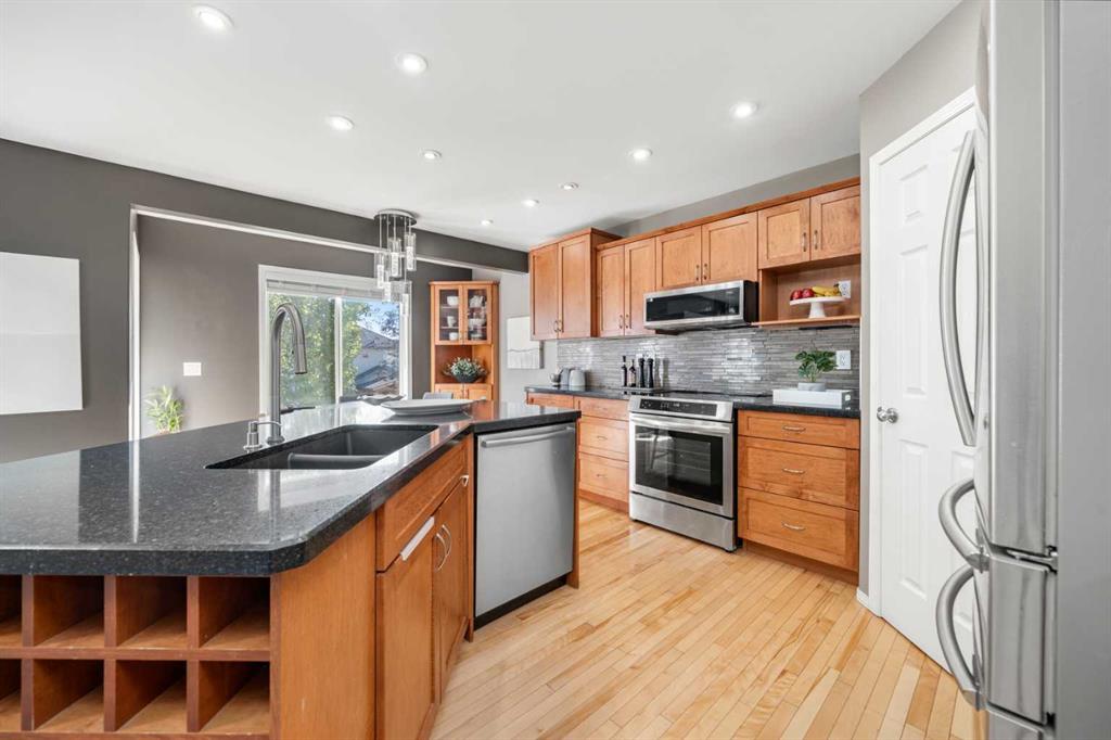***OPEN HOUSE SATURDAY OCTOBER 18th 12-2pm*** IMPECCABLY MAINTAINED and EXTENSIVELY UPGRADED, this exceptional WALKOUT HOME stands head and shoulders above others in BRIDLEWOOD, combining a functional family layout with outdoor spaces designed for entertaining. A welcoming OPEN-TO-ABOVE FOYER creates a sense of volume and privacy as you step inside. The main level flows seamlessly through the LIVING ROOM, DINING AREA, and CHEF’S KITCHEN, where extended WOOD CABINETRY, QUARTZ COUNTERTOPS, a GRANITE SIL SINK, and STAINLESS STEEL APPLIANCES with an INDUCTION STOVE set the stage for everyday cooking and weekend gatherings. A CORNER PANTRY with upgraded shelving provides practical storage, while a GARBAGE PULLOUT and HUTCH enhance function. The inviting LIVING ROOM centers around a GAS FIREPLACE with a built-in BLOWER FAN for cozy ambiance and added warmth. The main floor is completed by a well-designed MUDROOM with LAUNDRY on PEDESTALS, generous storage, and a stylish 2-PIECE POWDER ROOM. Upstairs, the thoughtful family layout continues with three bedrooms, including a bright BONUS ROOM converted to a bedroom, complete with an ELECTRIC FIREPLACE, WOOD CLOSET ORGANIZER, and included TV beneath CATHEDRAL CEILINGS. The 4-PIECE MAIN BATHROOM features EPOXY COUNTERS and WATERPROOF LAMINATE FLOORING for easy care. The PRIMARY SUITE is a true retreat with a WALK-IN CLOSET by CALIFORNIA CLOSETS and a beautifully updated 4-PIECE ENSUITE with matching finishes. The FULLY FINISHED WALKOUT BASEMENT expands the living space with CORK FLOORING laid over a SUBFLOOR for warmth, OVERSIZED WINDOWS that fill the space with light, and a STONE FEATURE WALL prewired for 9.2 SURROUND SOUND. This level includes a RECREATION ROOM, 4TH BEDROOM, 3-PIECE BATHROOM with STAND-UP SHOWER, and excellent STORAGE. Walls and ceilings are sound-dampened with ROXUL SAFE AND SOUND INSULATION, creating an ideal environment for movie nights or guests. Outside, the landscaped yard becomes an ENTERTAINER’S PARADISE with MATURE TREES, raised FLOWER BEDS, a wide DURADEK UPPER DECK with stairs to the ground, and a COVERED SEATING AREA below featuring an EATING BAR, TV MOUNT, and WIRING FOR 5.1 SURROUND SOUND. The lower patio and GEMSTONE LIGHTING on the front, back, and under the deck—complete with multi-color holiday and mood options—create a stunning evening atmosphere. Every upgrade was thoughtfully chosen and fully permitted, including FLAT-PAINTED CEILINGS, upgraded HAIL-RESISTANT SHINGLES (2022) with enhanced ventilation, LED LIGHTING throughout, HOT WATER ON DEMAND, CENTRAL AIR CONDITIONING, a WATER SOFTENER, and a HIGH-EFFICIENCY FURNACE. The insulated DOUBLE ATTACHED GARAGE is finished with 5-LB FOAM INSULATION, EPOXY FLOORS, GAS HEATER, POT LIGHTS, and an ULTRA-QUIET OPENER, while a widened driveway provides additional parking. This home perfectly combines family function with luxurious comfort—ideal for those who love to gather, entertain, and enjoy every space inside and out.