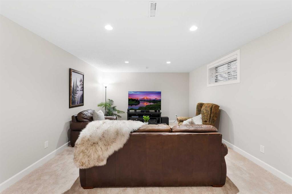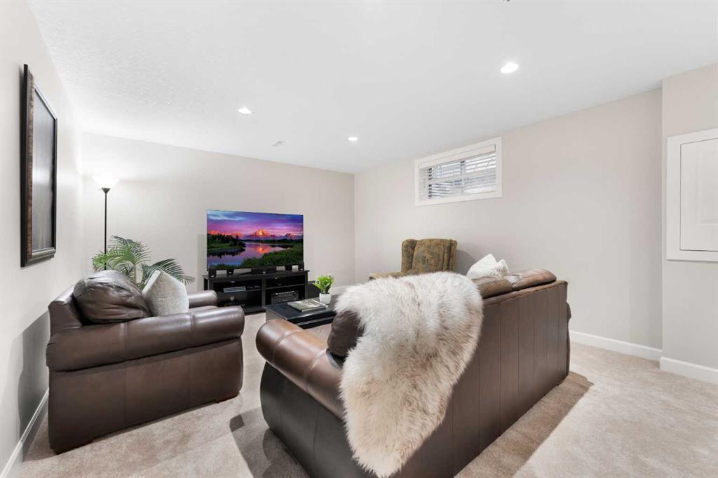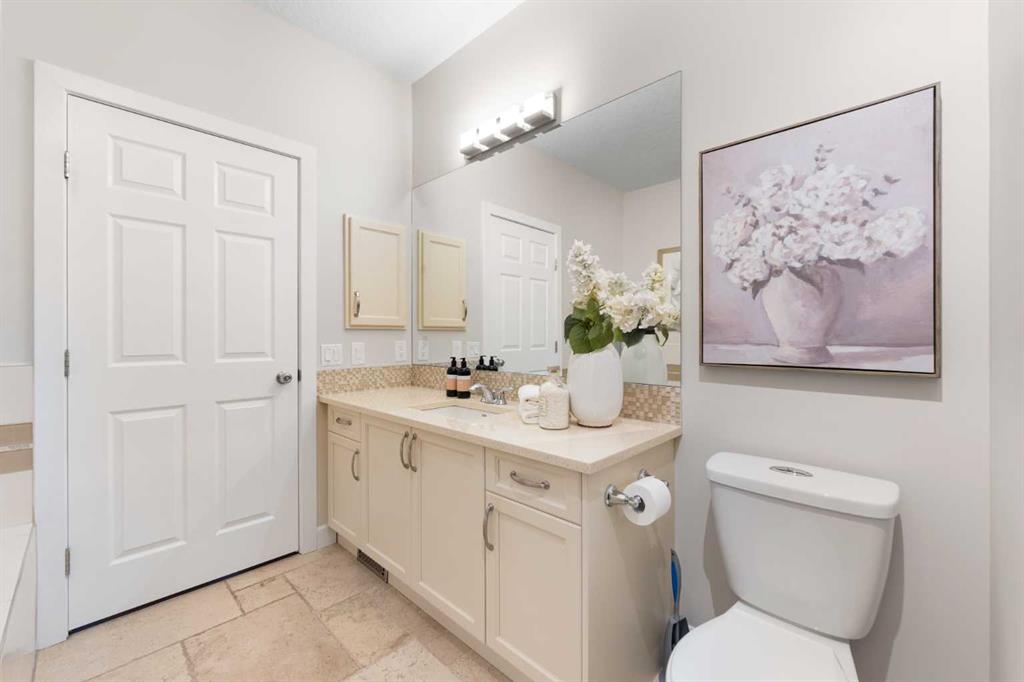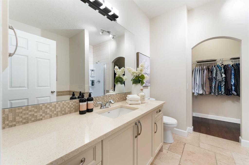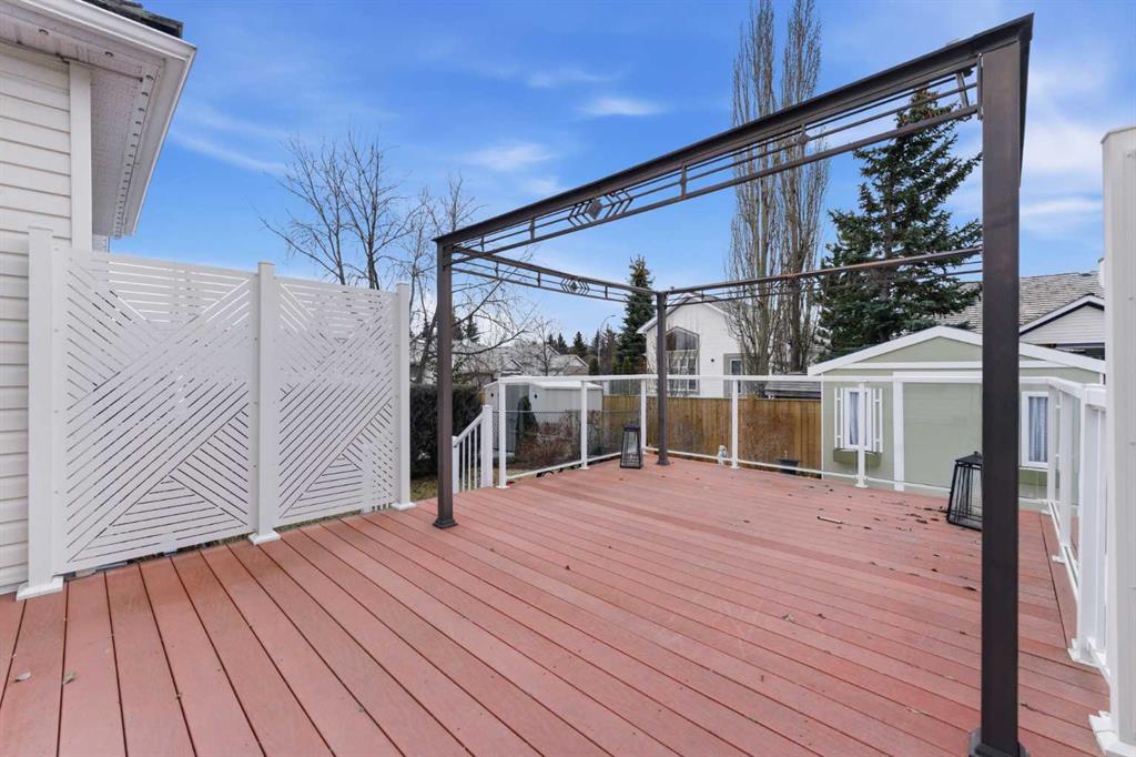 Welcome to this impeccable bungalow villa in the sought-after lake community of Lake Chaparral—where comfort, quality, and effortless living come together. Thoughtfully designed with a timeless aesthetic, this home offers approximately 2,300+ sq. ft. of developed living space, ideal for those seeking a more relaxed, low-maintenance lifestyle without compromising on space or style. The main floor is enhanced by vaulted ceilings and rich hardwood flooring, creating an open, airy feel throughout. The beautifully updated kitchen features a skylight that fills the space with natural light, while a striking three-sided fireplace elegantly separates the living and dining areas—adding warmth and character. The primary suite serves as a peaceful retreat with a full ensuite, while a versatile den provides the perfect space for a home office or quiet reading room. A convenient main floor powder room and laundry further enhance everyday ease. The fully finished lower level expands your living space with a generous family room, a second bedroom, full bathroom, hobby room, and ample storage—ideal for guests or extended stays. Step outside to enjoy the sunny south-facing backyard, complete with a private deck and pergola—perfect for morning coffee or relaxing summer evenings. Permanent gemstone exterior lighting adds beauty and year-round curb appeal. Additional highlights include central air conditioning, cedar shake shingles, and a double attached garage. Immaculate and move-in ready, this home also offers year-round lake privileges—enjoy walking paths, paddle boarding, skating, and a vibrant community atmosphere in every season. A rare opportunity to enjoy refined bungalow living in an exceptional community that’s close to everything that matters. Welcome home.