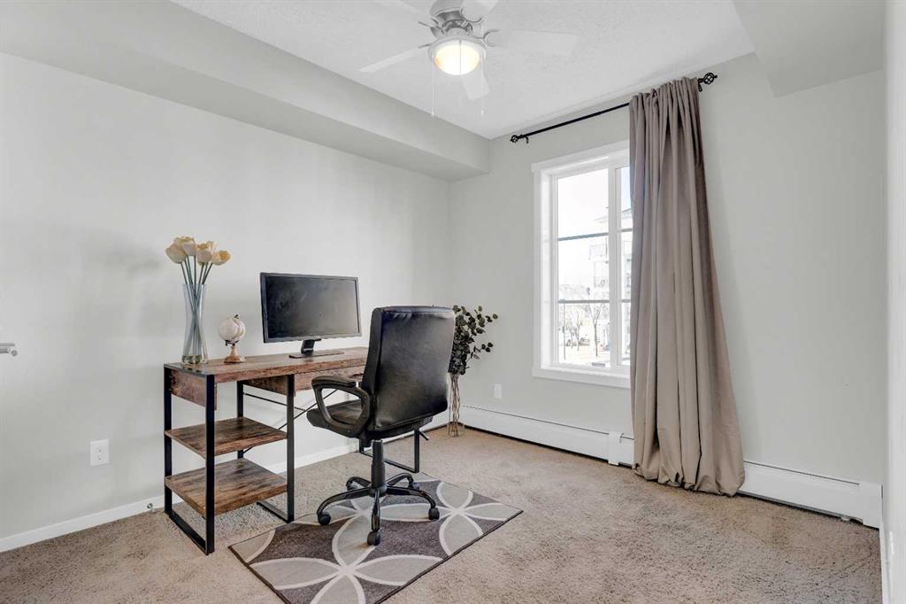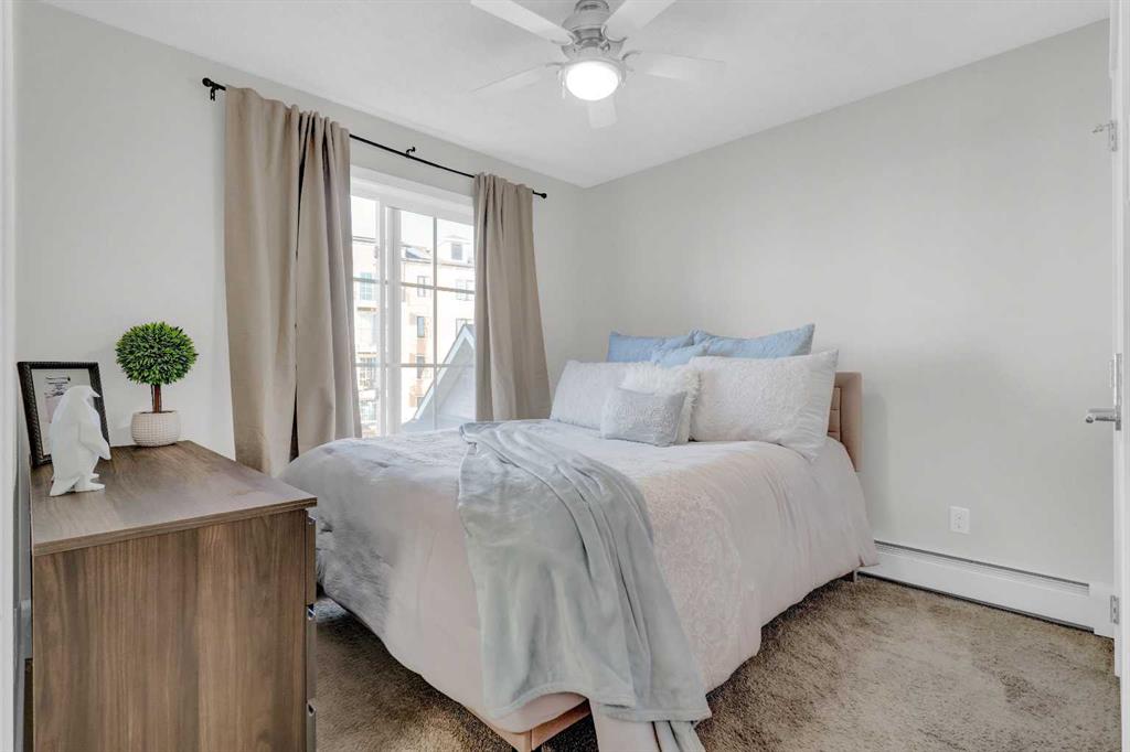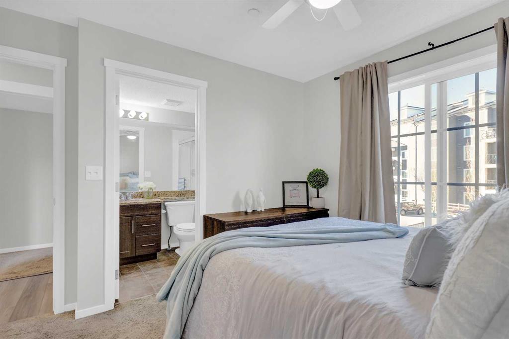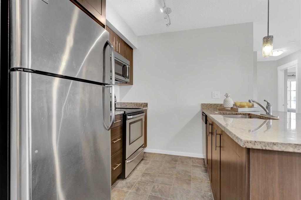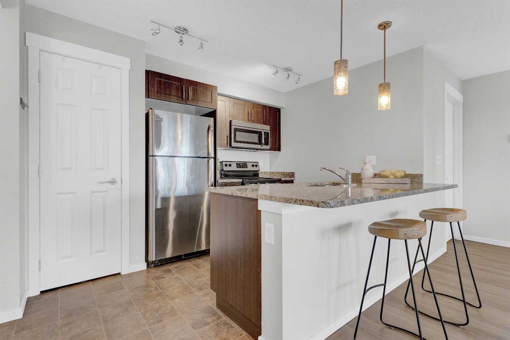 CORNER UNIT | 2 BEDROOMS | 2 BATHROOMS | 2 TITLED PARKING STALLS. Welcome to Copperfield Park II offering exceptional value in a beautifully maintained end-unit suite that combines comfort, convenience, and style. This bright and airy unit features an open concept layout with abundant natural light streaming through large windows, creating a warm and inviting atmosphere throughout the living and dining areas. The kitchen is equipped with stainless steel appliances, granite countertops, a pantry, and a breakfast bar perfect for everyday living and entertaining. Enjoy your morning coffee or evening unwind on the balcony overlooking the quiet courtyard. The spacious primary bedroom includes a private ensuite with a stand-up shower, while the second bedroom and full bathroom are thoughtfully positioned for privacy and functionality. Additional highlights include in-suite laundry with a full-size stacked washer and dryer, an assigned storage locker, and two titled parking stalls — one underground heated and one surface. Pet-friendly (with board approval) and ideally located close to schools, parks, walking paths, and public transportation. Just minutes from major shopping, restaurants, and easy access to Stoney Trail & Deerfoot— this home offers the perfect blend of value, comfort and convenience!