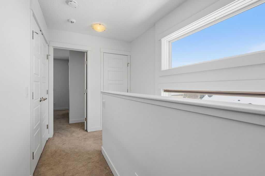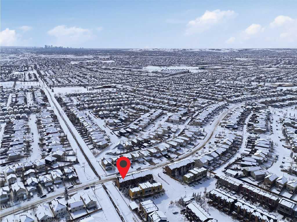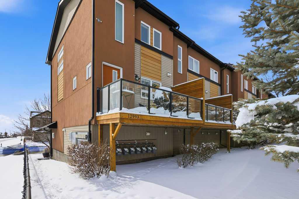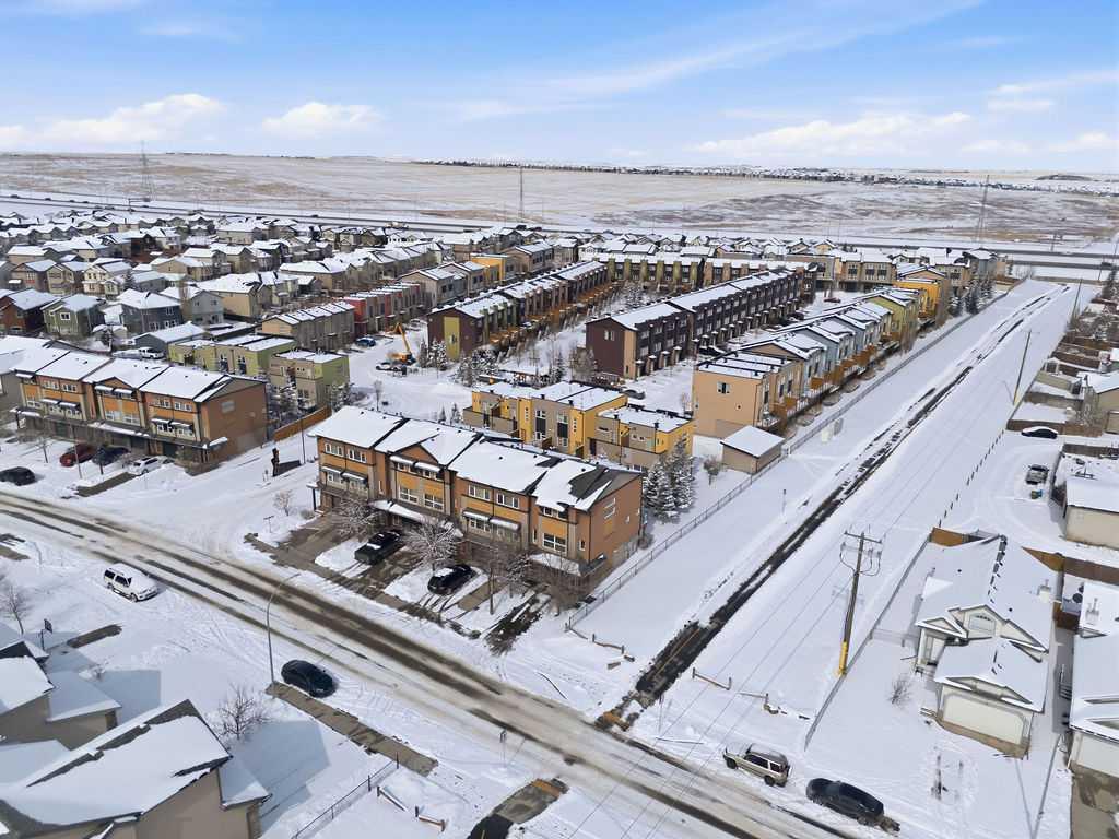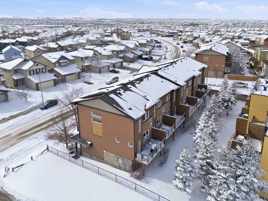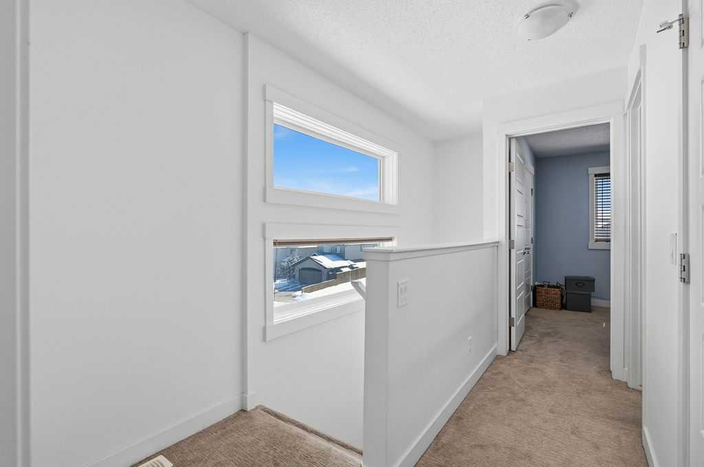 Welcome to this beautifully custom-designed end-unit townhouse in the highly sought-after community of Coventry Hills. Meticulously maintained and in immaculate condition, this home offers both style and functionality throughout. The main floor features a bright, open-concept layout highlighted by sleek engineered hardwood flooring and expansive modern windows that flood the space with natural light. The chef-inspired kitchen is equipped with high-end stainless steel appliances, granite countertops, rich maple cabinetry, and a spacious island with ample storage and convenient bar seating—perfect for entertaining. Step outside to your private deck, complete with a natural gas hook-up, glass railing, and serene views of open green space—ideal for summer evenings. Upstairs, you’ll find a spacious primary bedroom with a walk-in closet and a 4-piece ensuite, along with a generously sized second bedroom, an additional 4-piece bathroom, and a conveniently located front-loading washer and dryer. The oversized attached garage is fully finished and insulated, featuring a cleverly hidden storage room for added practicality. Ideally located close to shopping, restaurants, schools, and offering quick access to Deerfoot Trail and Stoney Trail. This is a must-see home you don’t want to miss!