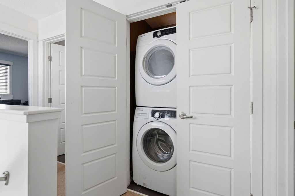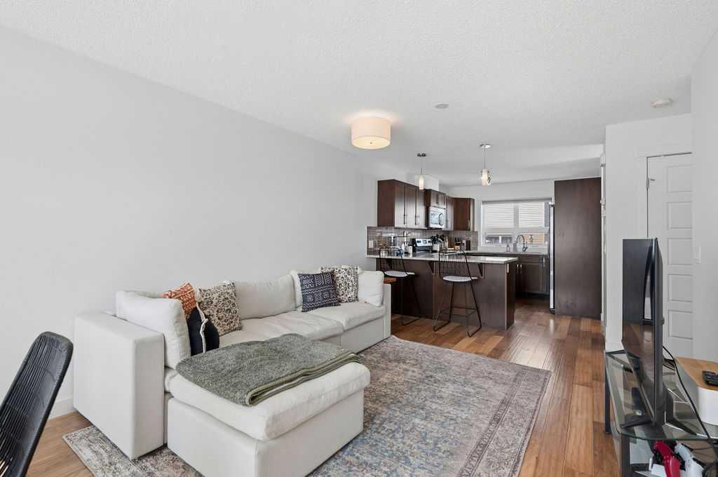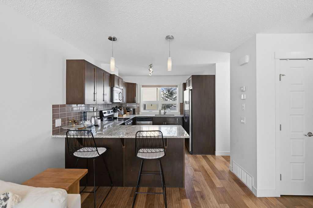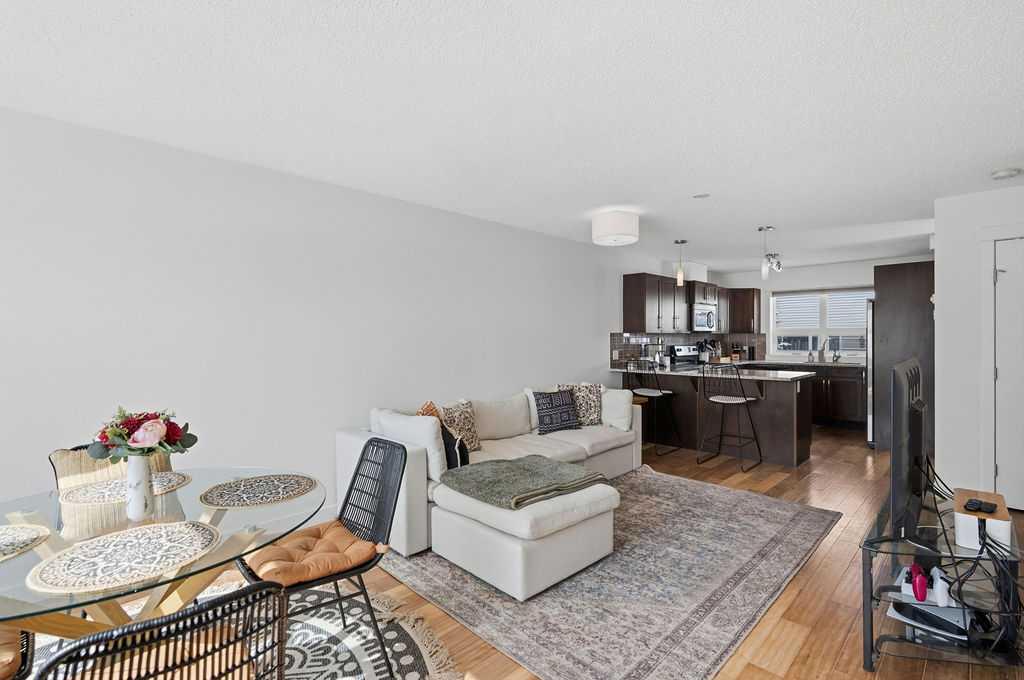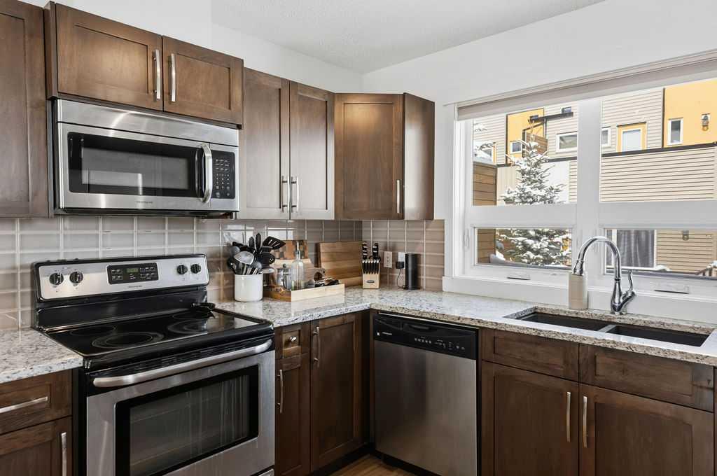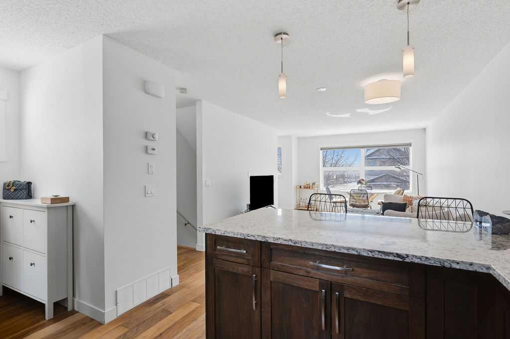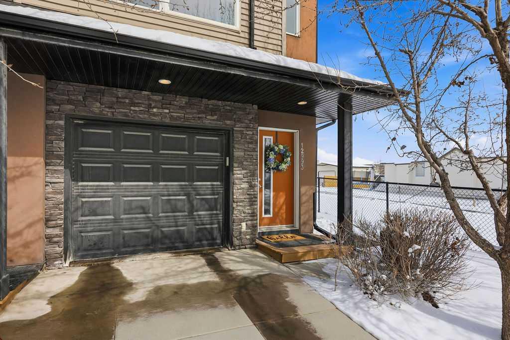 Welcome to this beautifully custom-designed end-unit townhouse in the highly sought-after community of Coventry Hills. Meticulously maintained and in immaculate condition, this home offers both style and functionality throughout. The main floor features a bright, open-concept layout highlighted by sleek engineered hardwood flooring and expansive modern windows that flood the space with natural light. The chef-inspired kitchen is equipped with high-end stainless steel appliances, granite countertops, rich maple cabinetry, and a spacious island with ample storage and convenient bar seating—perfect for entertaining. Step outside to your private deck, complete with a natural gas hook-up, glass railing, and serene views of open green space—ideal for summer evenings. Upstairs, you’ll find a spacious primary bedroom with a walk-in closet and a 4-piece ensuite, along with a generously sized second bedroom, an additional 4-piece bathroom, and a conveniently located front-loading washer and dryer. The oversized attached garage is fully finished and insulated, featuring a cleverly hidden storage room for added practicality. Ideally located close to shopping, restaurants, schools, and offering quick access to Deerfoot Trail and Stoney Trail. This is a must-see home you don’t want to miss!