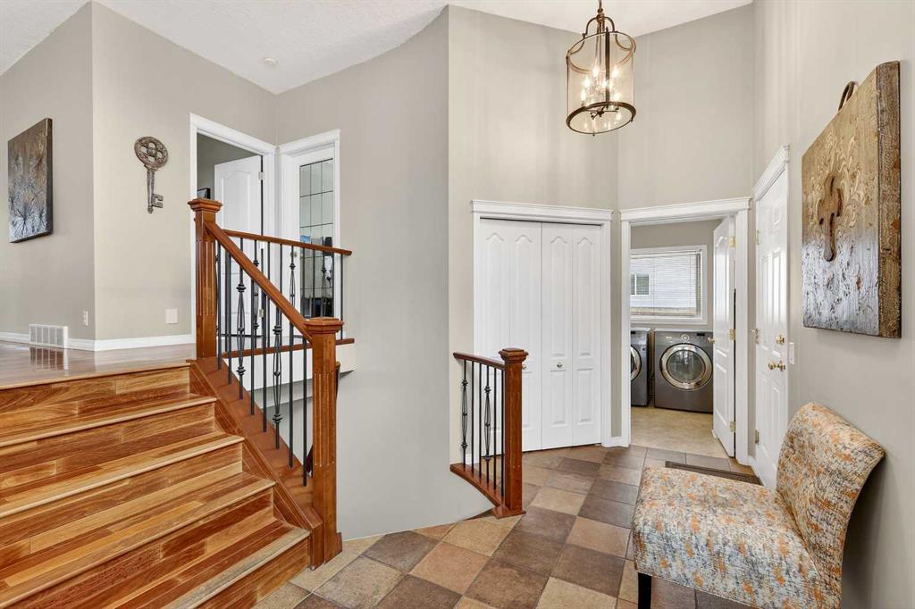 The primary bedroom suite offers ample space for a king-sized bed, with a large walk-in closet, and a spacious recently-renovated 5-piece ensuite complete with a dual vanity and jetted tub A second bedroom on the main floor provides the perfect layout for a dedicated home office or den. Practicality is found in the tiled main landing, which includes a 2-piece powder room and a large laundry room, entering from the attached double garage featuring a new garage door.