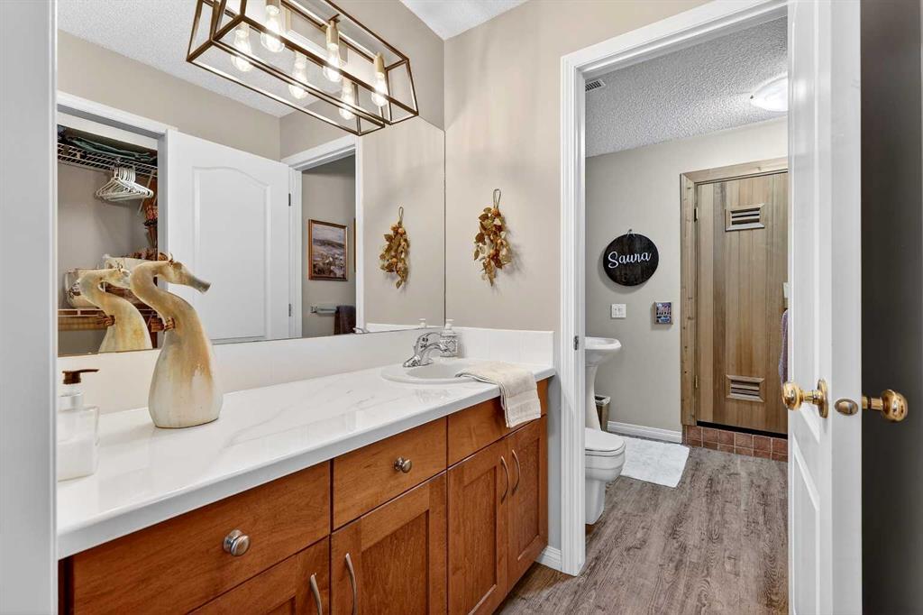 The fully developed lower level adds another 1266 sqft of developed living space, starting with a massive recreation room, highlighted by new marble floor to ceiling fireplace and a convenient wet bar for entertaining or peaceful relaxation. This level includes a sunny large third bedroom that shares a convenient 4-piece Jack and Jill bathroom, with a functional 4th bedroom space. The bathroom features a custom Finnish cedar wet sauna, providing a full spa experience.
