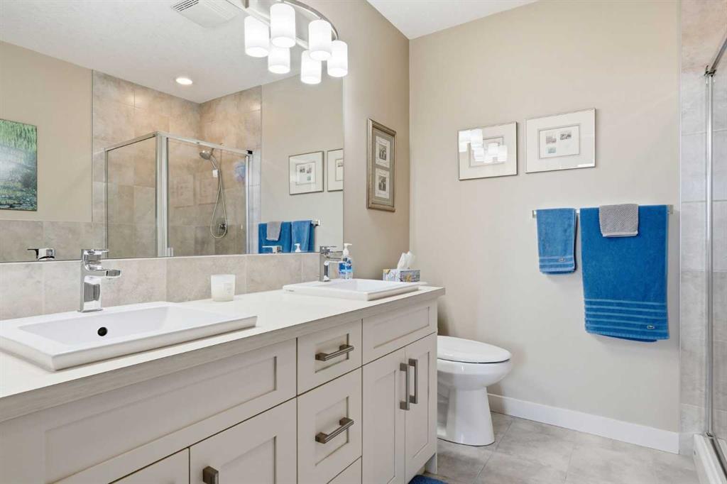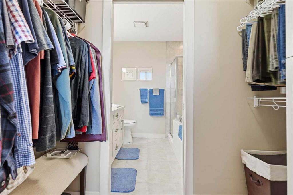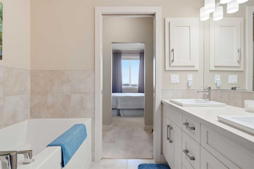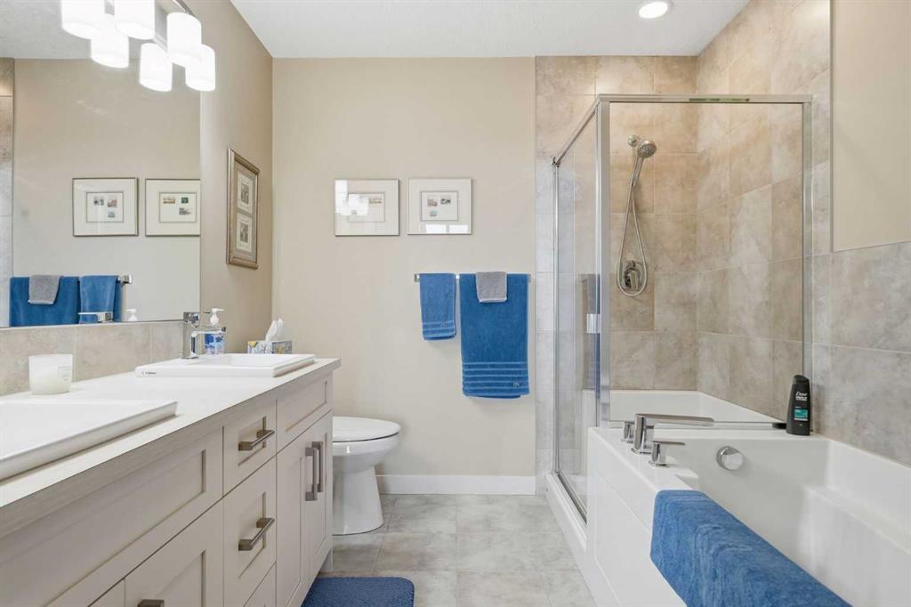 The primary bedroom includes a walk-through closet and a spacious ensuite complete with a double vanity, deep soaker tub, and separate stand-up shower. The second bathroom features a convenient tub/shower combination.
