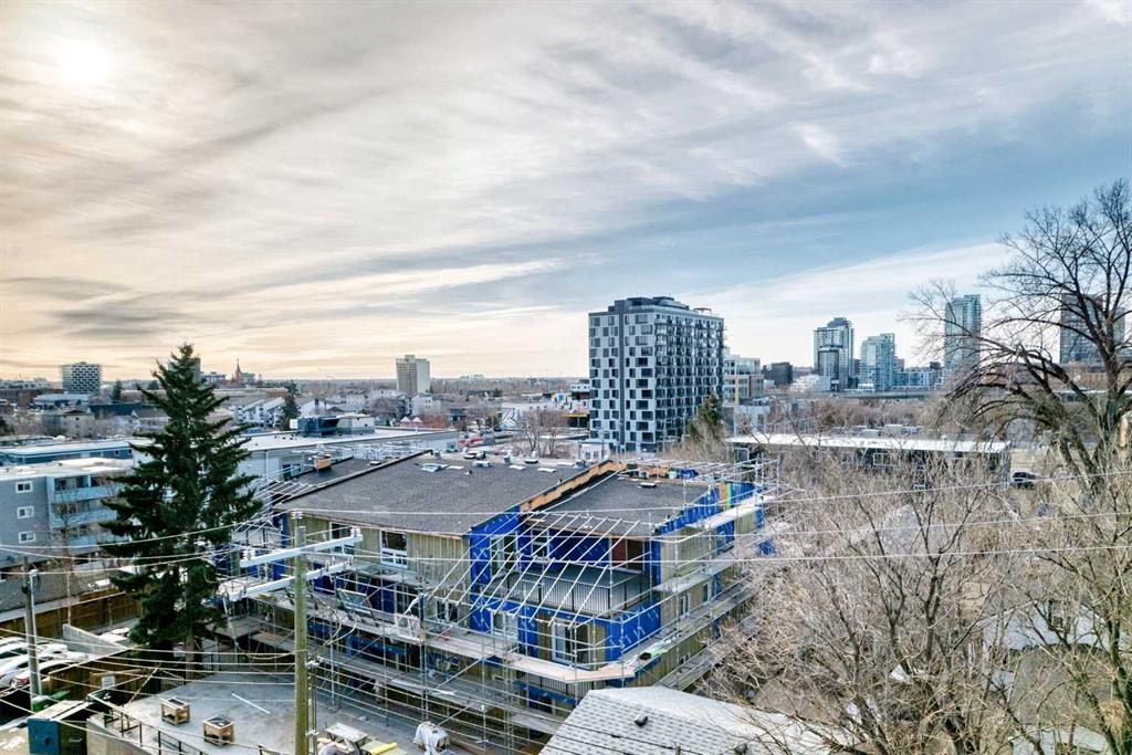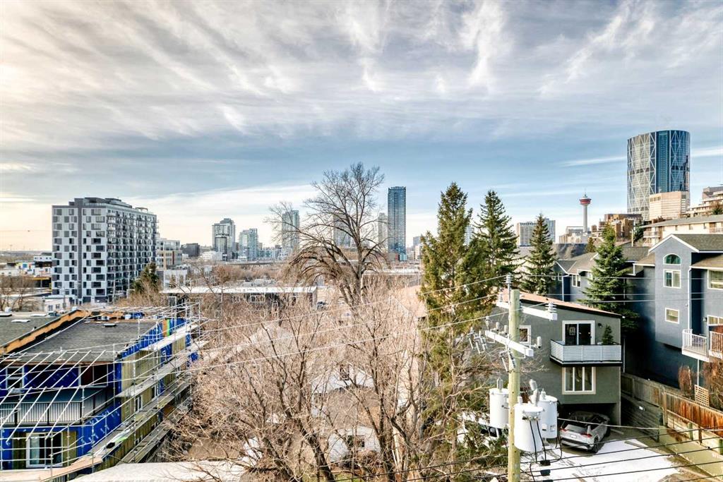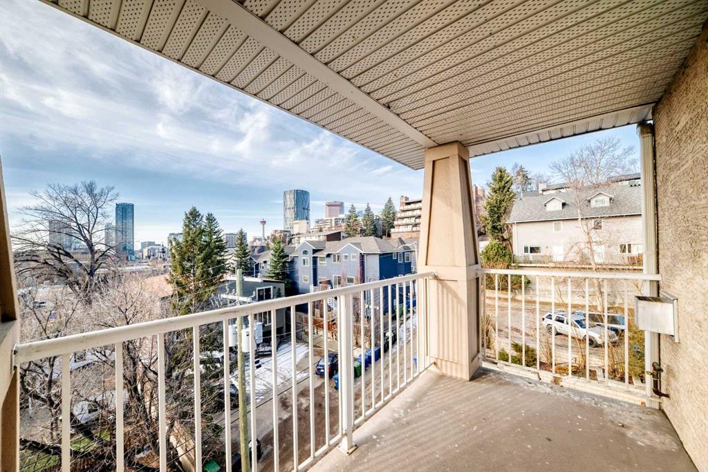 Corner unit inner city living with south views in sought after Crescent Heights with this spacious 2 bedroom, 2 full bathroom condo plus a large den, offering over 1,000 sq. ft. of corner unit space and titled underground parking. Perched on a quiet cul-de-sac, this bright unit showcases stunning, unobstructed views of downtown Calgary and the Bow River Valley, creating the perfect backdrop for everyday living. The open concept layout is ideal for both relaxing and entertaining, featuring a functional kitchen with a raised breakfast bar, ample cabinetry, and seamless flow into the generous dining area and cozy living room complete with a corner gas fireplace. Step outside to your south facing covered balcony perfect for year round enjoyment. The primary bedroom easily accommodates a king sized bed and includes a walk-through closet with built in shelving and a private 4 piece ensuite. The second bedroom, positioned on the opposite side of the unit for added privacy, is ideal for guests, roommates, or family. A second full 4 piece bathroom and in suite laundry add everyday convenience. A standout feature is the large den, perfect for a home office, gym, or additional storage adding versatility to the space.