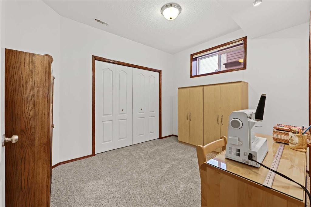 The spacious primary suite offers vaulted ceilings, a walk-in closet, and a spa-inspired ensuite with a jetted tub and dual vanities. The fully developed walkout lower level features in-floor heating, two additional bedrooms, a recreation room with wet bar, a dedicated office, a full bath, and an oversized utility/storage room—perfect for family living and entertaining.