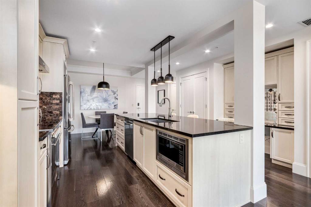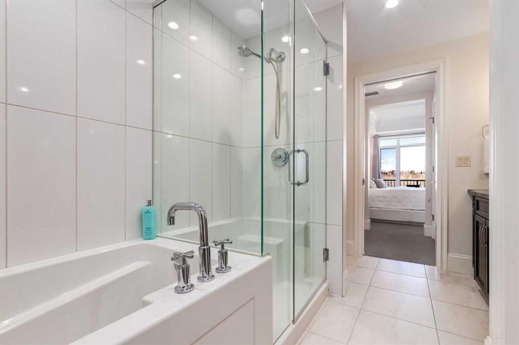 ** Open House Saturday, March 28, 1-3 PM ** Framed by sweeping 180 Degree Bow River VIEWS, this elevated, luxury condo at Champagne delivers a lifestyle defined by views, light, and timeless sophistication. Blending architectural elegance and elevated urban living with an unbeatable location, you’ll love all this spacious air conditioned, 1 bedroom suite has to offer – 9 ft ceilings, hardwood and tile flooring, open concept layout offering a lovely dining space, a gorgeous kitchen with stainless steel appliances, granite countertops and an island to seat four. The gracious living room features large windows and patio door leading to the river-facing balcony – perfect to sit back, relax and watch the river go by. The large primary bedroom easily accommodates king-sized furniture and offers more gorgeous views of the Bow River, walk-thru closet to a spa like ensuite with deep soaker tub and stand-alone shower. In-suite laundry completes the floor plan, and the suite includes TWO titled underground parking stalls and title storage locker. Quality & craftsmanship are evident throughout this quiet Concrete building that features lots of visitor parking, bike storage and 2 car wash bays. Pet Friendly Complex, up to Two Pets Allowed per suite. You’ll fall in love with this incredible location on the Bow River Path System and with what Quarry Park has to offer residents - walk to fantastic restaurants, shops, services and amenities & the YMCA. It’s only a five minute drive to the Douglasdale Golf Course, all the shopping at the South Trail Crossing Shopping Centre on 130th Avenue and easy access to major traffic arteries. Be sure to book your viewing today!