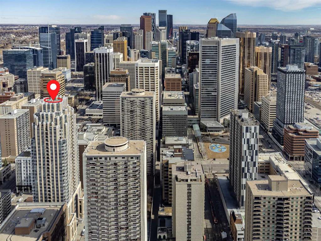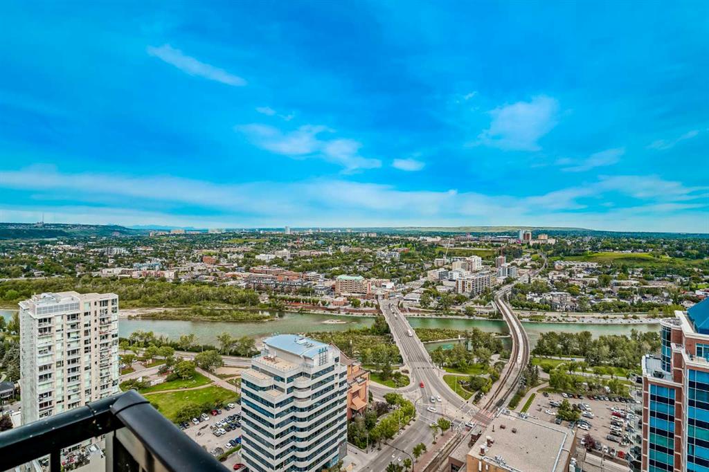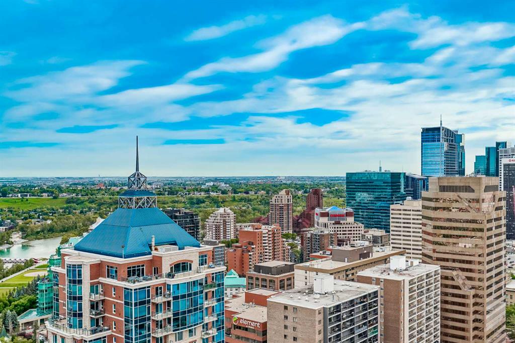 Welcome to this stunning, 1 bedroom, 1 bathroom home on the 33rd floor of one of Calgary's most sought after buildings, Vogue! If you have ever wondered what the downtown skyline and Bow River look like from 33 stories above the ground, this is the unit for you! As you walk in you are greeted with gorgeous dark wood floors, starting with a flex area that is great for an office space or additional storage. The open floor plan features a large kitchen with quartz counter tops, stainless steel appliances, a ton of cabinets and drawers and allows for an eat in kitchen experience. The dining area flows into your living room with floor to ceiling windows giving you UNOBSTRUCTED VIEWS OF THE BOW RIVER as well as MOUNTAIN VIEWS from the balcony. The balcony is a good size and offers great outdoor space. The bedroom is large enough for all of your bedroom furniture and features a walk through closet with in unit laundry and direct access to your full bathroom. The Drake is truly one of Calgary's gems of a building giving luxury hotel vibes, bicycle storage, fitness centre, recreation room, roof deck, and secured parking. This unit has a titled underground parking stall and assigned storage locker. This building is in a great location with being steps from the riverwalk, shops, cafe's, restaurants, parks, pathways and transit. Do not miss out on this opportunity to own one of the highest units with river views in the entire city.