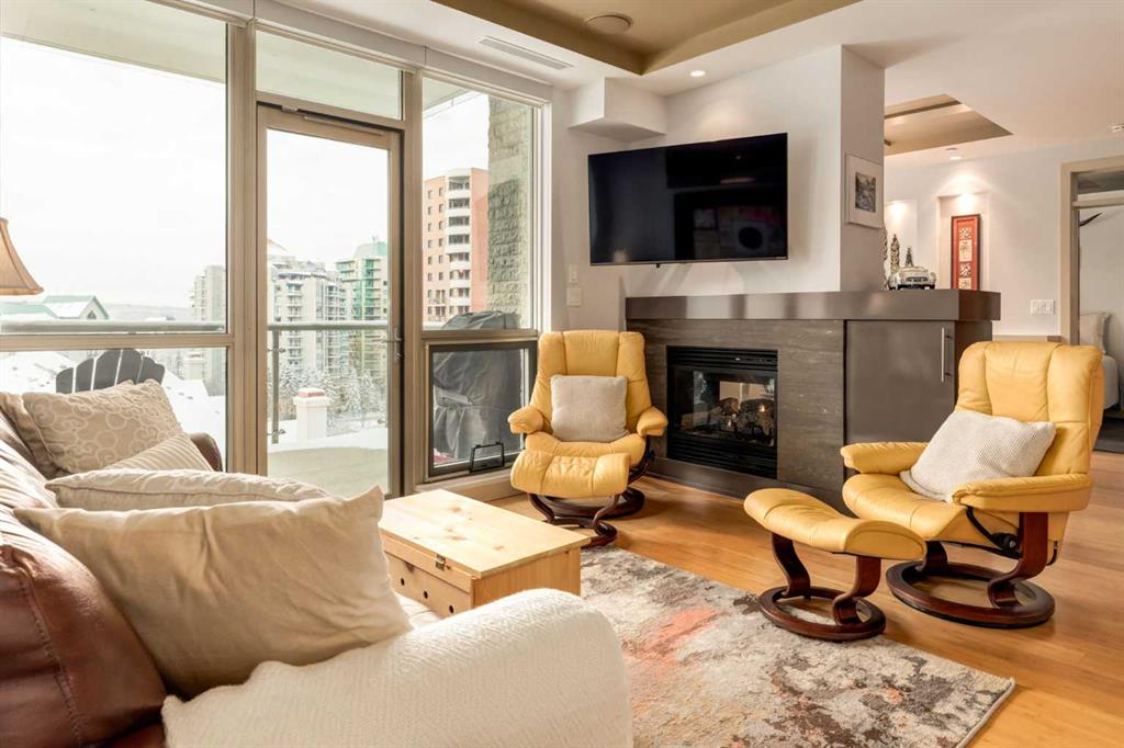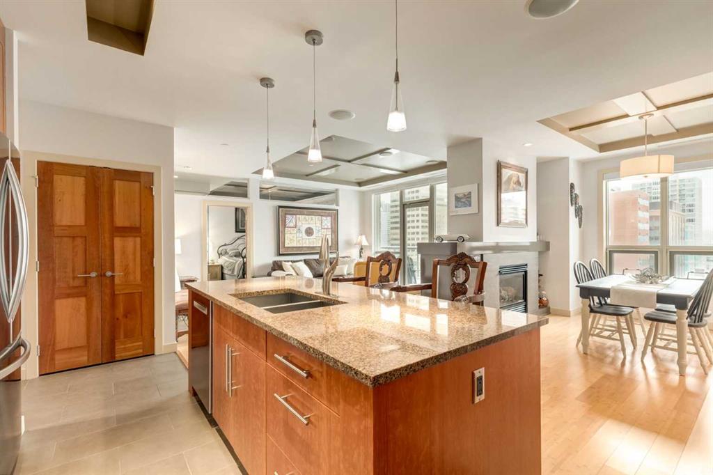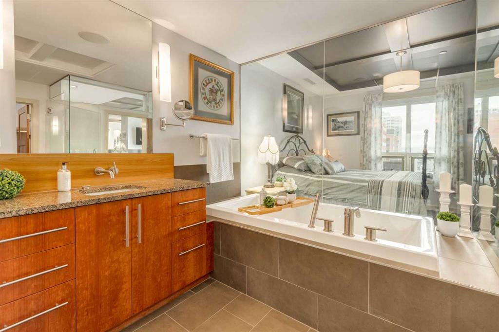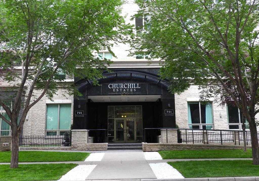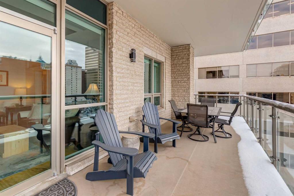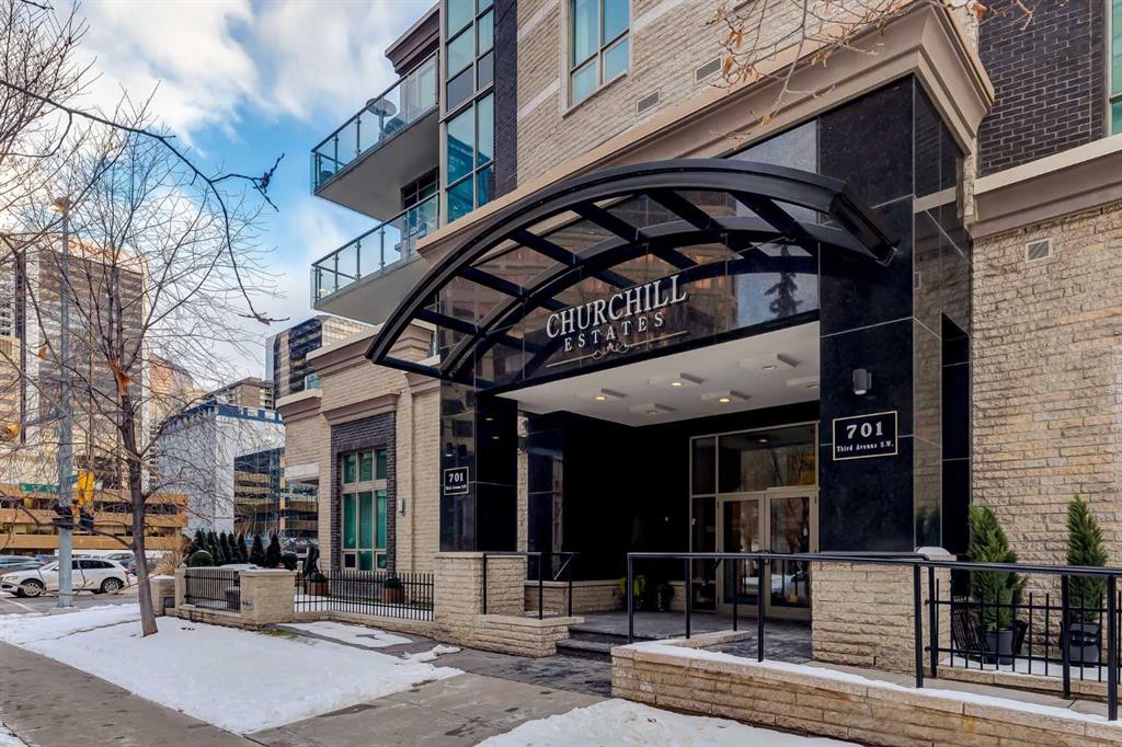 Welcome to Churchill Estates - a timeless brick and sandstone building home to just 40 luxury-class residences, conveniently located in the highly sought-after Eau Claire area of Downtown Calgary. Situated just steps from some of the city’s finest restaurants, a short stroll to the Bow River, pathways, Prince’s Island park, downtown core, and surrounded by upscale amenities to suit all lifestyles; this incredible location is sure to impress. This prime, WEST facing suite with massive wrap-around balcony offers nearly 1350 SF, 9 ‘ ceilings, a desirable 2 primary bedroom floor plan (both with ensuites and walk in closets), home office with custom built-ins and TWO titled parking stalls. You’ll fall in love with the luxury features throughout - a contemporary chef’s kitchen complete with high-end appliances including gas range, granite counters, large central island with breakfast ledge & plenty of built-in storage including pantry. The kitchen overlooks the spacious dining room and living room, with cozy double sided gas fireplace separating the rooms, and floor to ceiling windows and patio door to the huge west facing balcony with gas bbq line. Enter the primary retreat that easily accommodates king-sized furniture, to find a breathtaking spa-like ensuite with heated floors, large steam shower, relaxing soaker tub, dual sinks and spacious walk-in closet. The secondary bedroom at the opposite end of the suite is a haven thanks to a 3 pc ensuite with it's own walk in closet. Enoy the comfort of central A/C and dual zone climate control, bamboo flooring & tile in the main living areas, solid core doors throughout, 2 pc powder room off the entrance, laundry room, extra titled storage locker and 2 spacious side by side titled parking stalls. This sophisticated, secure and well-managed and impeccably maintained building is pet friendly, and offers a car wash bay, secure bike storage, visitor parking and of course, a friendly greeting from the on-site concierge. The solid concrete construction adds to the building’s quiet atmosphere. Condo fees include all utilities INCLUDING unit electricity. Perfect for the discerning buyer that wants luxury living and an option for a true lock and go lifestyle. Be sure to check out the multi-media tour, and book your viewing today!