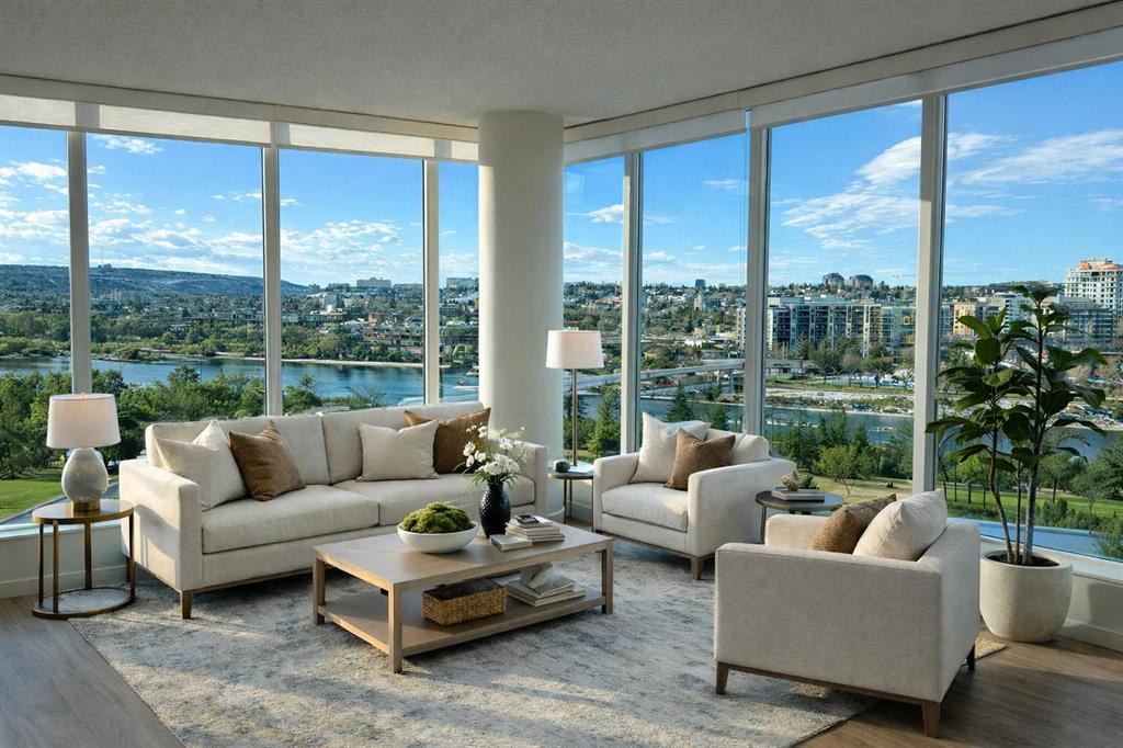 **Open house Saturday March 21 2026** Completely renovated and move-in ready, this executive 2-bedroom condo offers breathtaking Bow River and Rocky Mountain views in one of downtown Calgary’s most desirable locations. Situated just steps from Eau Claire, Prince’s Island Park, the Bow River Pathway, and the vibrant downtown core, you’ll enjoy unmatched walkability to premier restaurants, shopping, and green space.