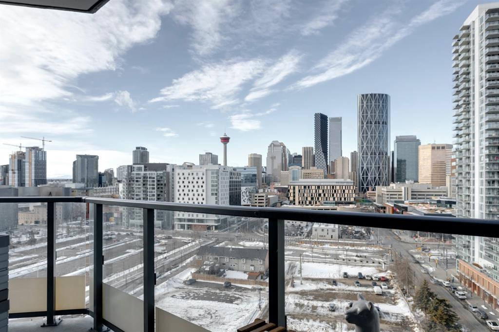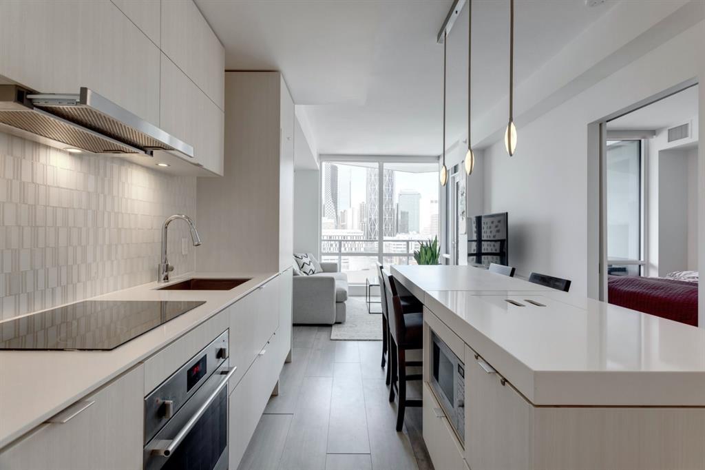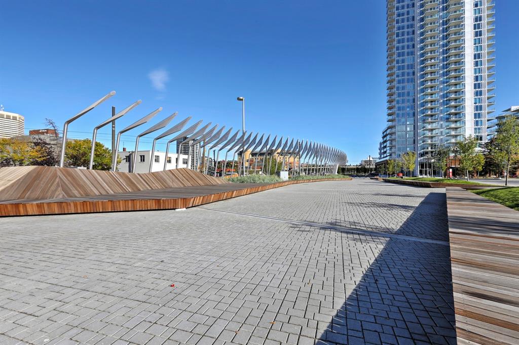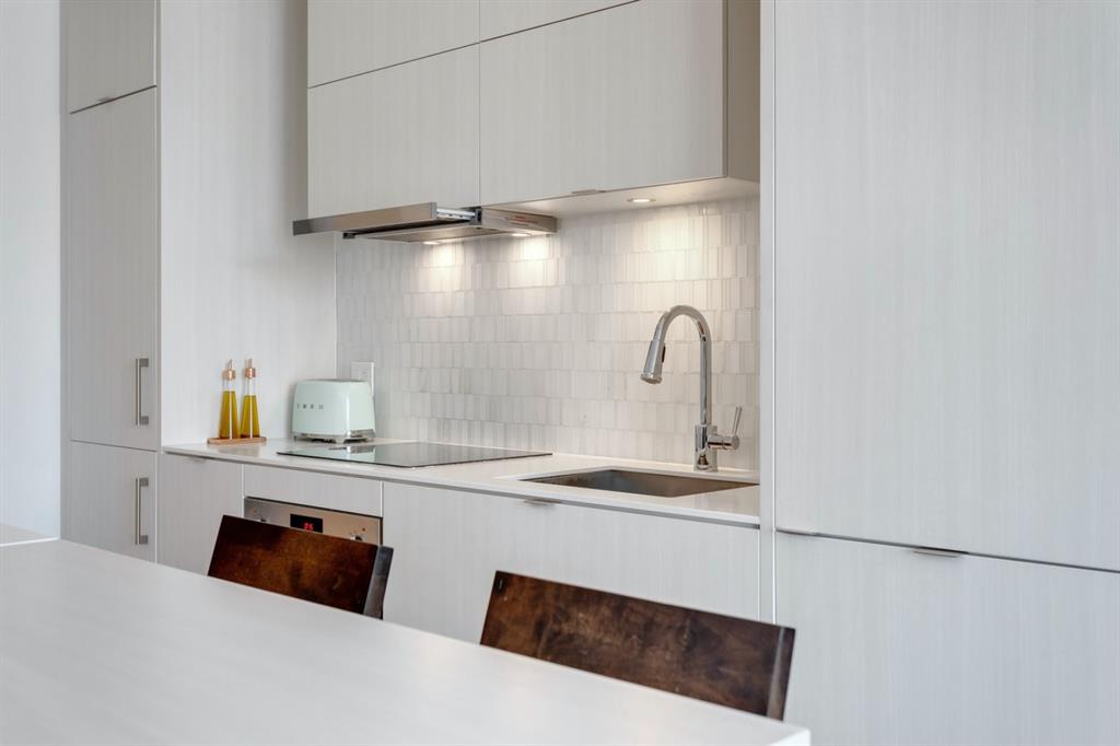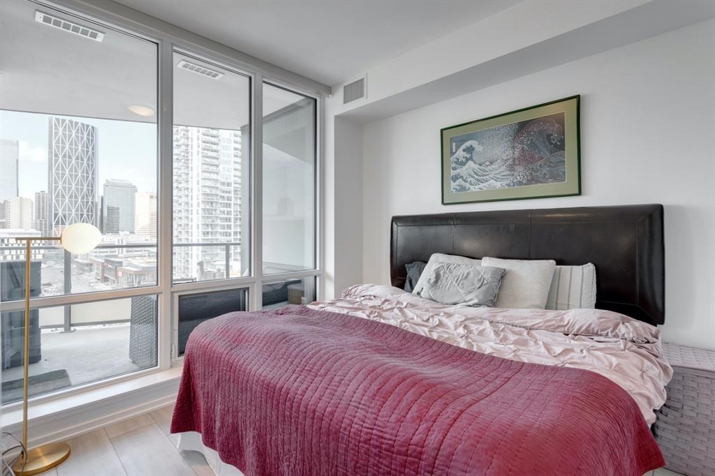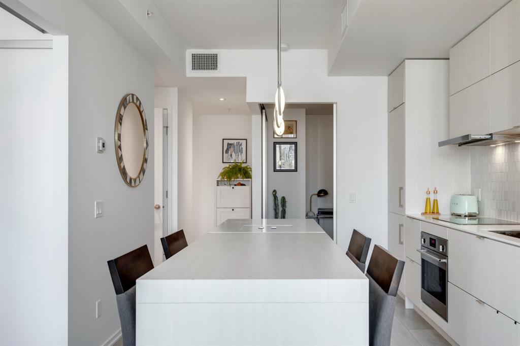City lights, mountain views, and world-class dining and entertainment await at the ultra-modern Verve in Downtown East Village. This one-bedroom plus massive den showcases contemporary design by Cecconi Simone, with thoughtful finishes throughout. The Euro-inspired kitchen features stainless steel built-in appliances and quartz countertops, while the sleek bathroom is finished with oversized floor-to-ceiling tile. Expansive windows flood the home with natural light and frame sweeping city and mountain views. Pets are allowed at the Verve but none have lived in this space. The striking exterior combines fritted glass, colourful vertical accents, and geometric balconies, creating one of East Village’s most recognizable towers. Inside, residents and guests are welcomed by a sculptural fireplace and in-house WiFi in the lobby. Amenities are designed for both relaxation and entertaining. Work out in the fitness studio, unwind in a cabana beside the Zen garden, or gather around the outdoor fire pit after an evening walk along the river. The party room kitchen and resident lounge provide the perfect setting to host friends and celebrate special occasions. Step outside and discover everything East Village has to offer, all within walking distance. The world-renowned Central Library and Studio Bell, home of the National Music Centre, are just moments away, along with groceries, acclaimed restaurants, and scenic bike paths that follow the Bow River. One of Calgary’s most dynamic and evolving neighbourhoods, East Village is colourful, sophisticated, vibrant, and full of energy—an urban community that truly has it all.
