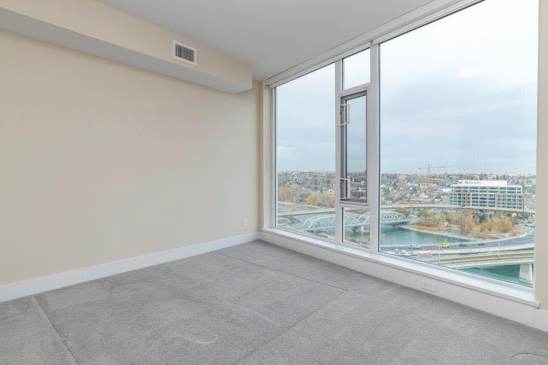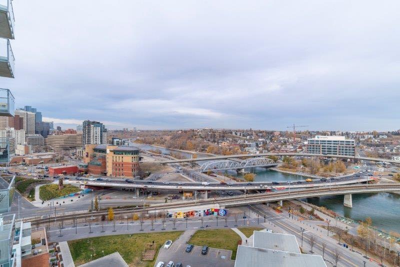 Experience urban living at its finest in the heart of the East Village, nestled within Evolution Fuse! This exquisite, NE corner facing, 2 Bedroom, 2 Bathroom, 15th floor residence exudes contemporary elegance and offers unparalleled living. As you enter this highly maintained property you’re greeted to a den space, perfect for an office. The kitchen, dining, living areas have unobstructed expansive river views and surrounding area. The sleek and modern kitchen is equipped with stainless steel appliances, granite countertops, tiled backsplash and ample cabinet space. The living and dining area seamlessly flows onto the large patio (121 Sqf) through sliding glass doors creating a beautiful indoor-outdoor experience complete with gas BBQ hookup and power outlet. The primary bedroom has decent sized closets and walks directly into ensuite bathroom, which has in-floor heating, large soaker tub, walk in shower and dual vanity with granite counter top. The second bedroom has ample space and mirrored doored closet. Additionally a full-size washer/dryer, central air-conditioning, secured storage locker and 1 x tandem parking stall (two cars back to back), just steps away from elevator. Enjoy an array of amenities at Evolution, including an elevated 2nd floor outdoor garden common area, entertaining lounge, two fitness centre’s complete with steam room and sauna, and personalized Conciege services + 24/7 security. Embrace the vibrant riverfront lifestyle with easy access to scenic walking / biking paths along the river or directly to the downtown core, dining, numerous shops / services and the convenience of the C-Train. Don’t forget the new Scotia Place coming in 2027 which will only enhance the desirably of The East Village. This unit must be seen - it shows beautifully!