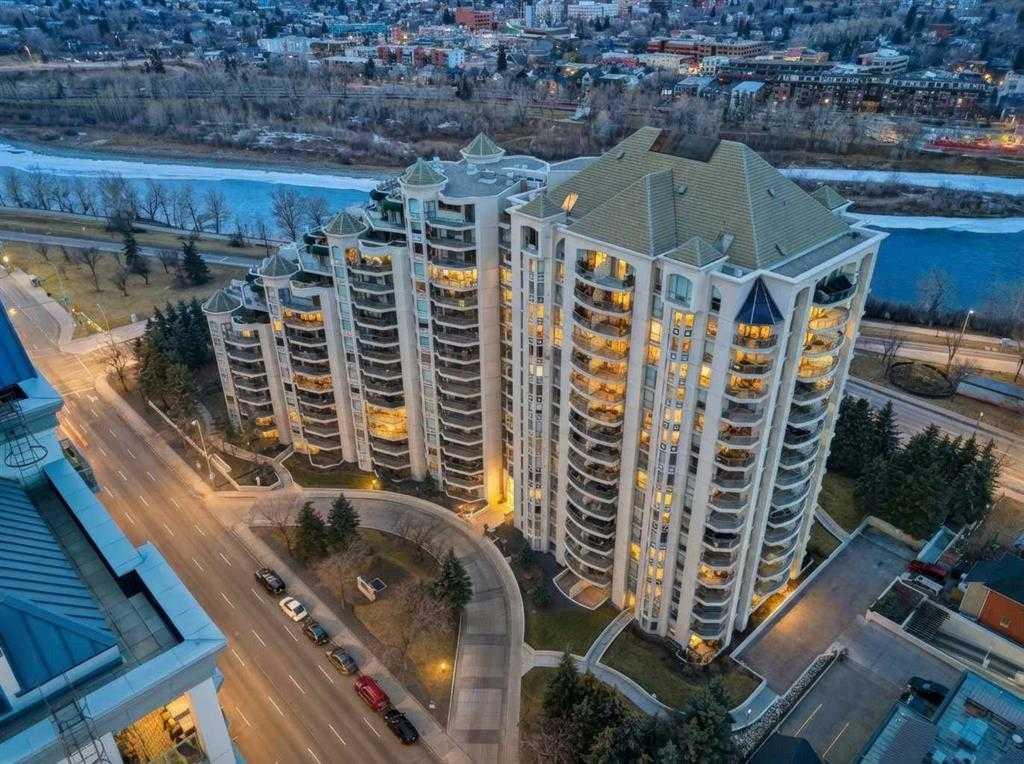 Penthouse at The Marquis - This is what you have been waiting for and it shares only one wall with a neighbour! Updated top floor suite, spacious 1274 SF Riverside suite with oversized windows and extra height ceilings to take in the amazing North and West facing RIVER & MOUNTAIN VIEWS overlooking the Bow River. Freshly painted and showcasing a split bedroom design floor plan, this 2 bedroom PLUS DEN suite includes parking for 2 vehicles (tandem) plus additional storage locker. Entering the suite you are drawn to the open and spacious living and dining rooms – the view beckons! Cozy gas fireplace with marble tile front and mantle anchors the living room and oversized windows capture the views – sunset sky’s from here are stunning! The updated (in 2019), bright white kitchen overlooks the living area and offers ample granite counter space, breakfast ledge & stainless steel appliances. The primary bedroom is roomy and spacious and accommodates king sized furniture & features walk-through closets, 4 piece ensuite bath with soaker tub, separate shower and ample granite counter vanity space. Second bedroom easily fits queen-sized furniture, offers an extra closet as well and the 3 piece renovated bath (granite counters here, too!) is adjacent – perfect for a room mate or for when guests stay over. Don’t forget the den – it’s a great size and features floor to ceiling window on to the living room. Laundry room (new washer & dryer in 2024) with lots of storage space & extra shelving. Easy upkeep tile and laminate flooring are throughout the suite. The Marquis offers FULL concrete construction, including between suites, and all common areas have recently been renovated and are meticulously maintained. The gracious front lobby welcomes your guests and building amenities include 24 indoor visitor parking stalls, exercise facilities with his/her change rooms, yoga studio, a party room for gatherings and bike storage. With a walkability score of 95, this West Downtown location is amazing – super close to the Bow River pathways, Prince’s Island park, coffee shops, boutiques and great restaurants to explore, 1 block to the LRT (downtown free zone), & the fun and excitement of Kensington is just across the river. This is a pet friendly building (dogs under 20 lbs, with Board approval) – Start living the lifestyle you’ve dreamed of and call to view today!