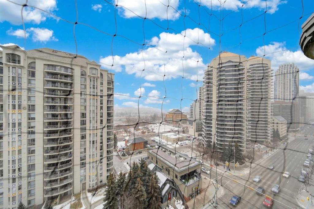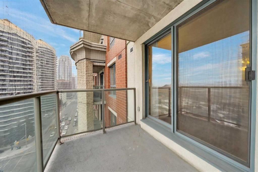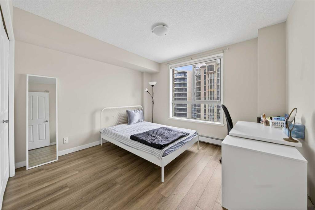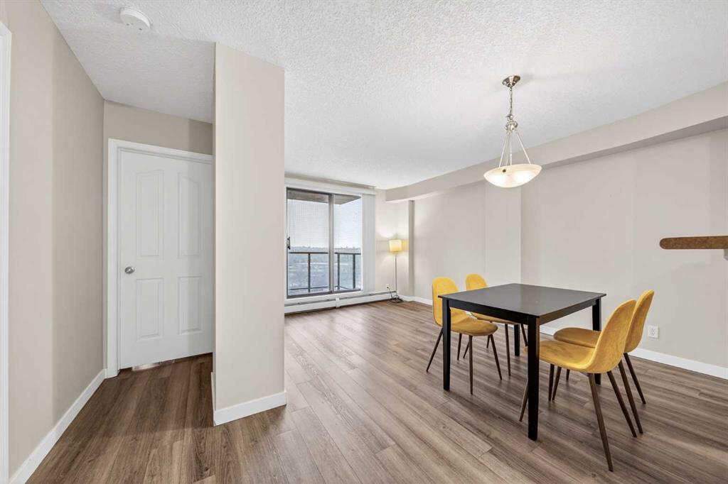 This 11th-floor 1 bedroom + den unit offers a bright, open layout with newer laminate flooring and large windows that bring in plenty of natural light. The living room opens onto a covered balcony where you can take in city and mountain views—perfect for unwinding after a long day.