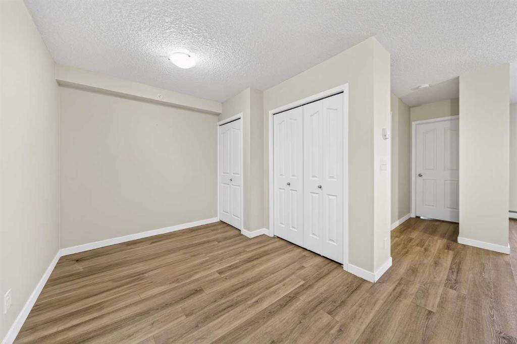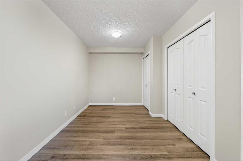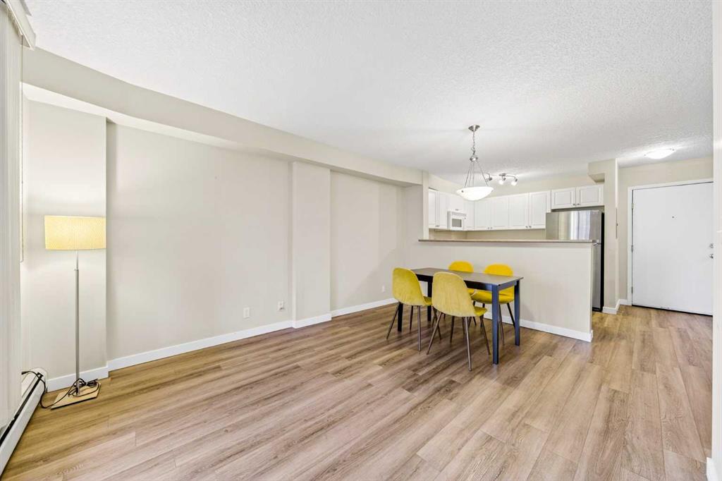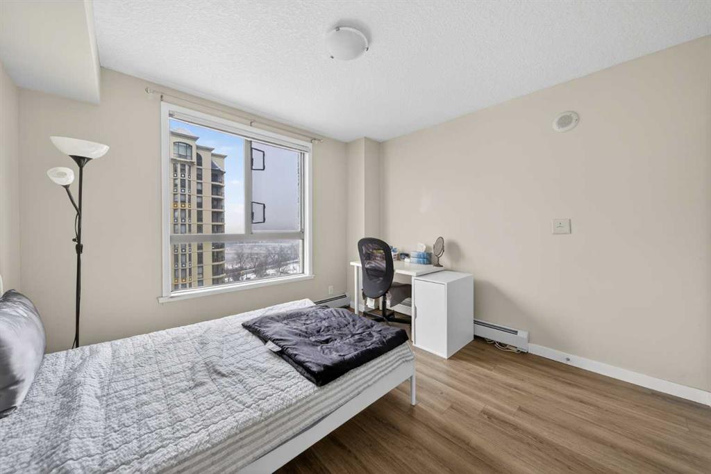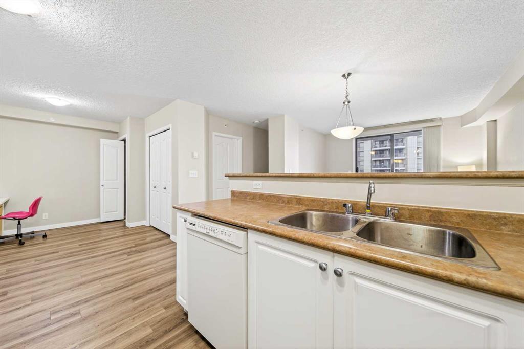 This 11th-floor 1 bedroom + den unit offers a bright, open layout with newer laminate flooring and large windows that bring in plenty of natural light. The living room opens onto a covered balcony where you can take in city and mountain views—perfect for unwinding after a long day.