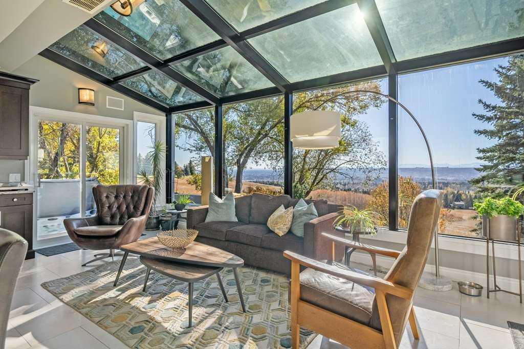 **Open House: Sun, Oct 19th 2 – 4PM** Commanding attention with breathtaking mountain, city & foothill views, this exquisitely renovated executive residence delivers nearly 5,000 sq ft of developed living space designed for comfort, sophistication & seamless technology. Meticulously upgraded with over $500,000 in premium enhancements, this luxury home combines modern innovation with timeless craftsmanship. A $140K Elan Smart Home Automation system with CAT 5 wiring, integrated sound & full control from any device sets the stage for effortless living. The impressive open-to-above foyer introduces elegant flow through the vaulted living room, where a sleek gas fireplace sets a sophisticated tone. Oversized windows in the adjoining dining area frame endless west-facing vistas, while designer lighting creates a refined backdrop for entertaining. The chef’s kitchen is a true centerpiece, blending luxury & function with granite countertops, high-end cabinetry, Sub-Zero & Wolf appliances, Miele built-in coffee maker, Asko dishwasher & an expansive island ideal for entertaining. A sunroom encased in glass brings the outdoors in, capturing panoramic ridge views year-round. This newly renovated space features heated floors & modern windows for year-round comfort, while patio doors extend living to the upper BBQ deck with glass railings & natural gas hookup for effortless entertaining. A stylish den with its own gas fireplace creates a serene home office. Completing the main level are a custom mudroom with storage lockers, laundry with ample storage & a sink & a handy powder room. Upstairs, a skylit hallway leads to the serene primary retreat where corner windows showcase sweeping views. A custom California Closet & spa-inspired 5-piece ensuite with in-floor heat, deep soaker tub, dual vanities & oversized rain shower enhance daily indulgence. A second bedroom enjoys its own private 3-piece ensuite, while two additional bedrooms share access to another full bathroom. Gather in the rec room in the walkout basement & enjoy family movies & games nights. A luxurious guest suite features in-floor heating, a gas fireplace, 3-piece ensuite, walk-in closet & direct patio access creating a spa-like retreat. A dedicated gym & an additional full bathroom add flexibility, while a second laundry area & abundant storage enhance everyday convenience. Outdoor living shines with multiple spaces for relaxation & entertaining, including a hot tub deck for rejuvenating evenings, a covered patio from the walkout level & an expansive yard with a custom-built treehouse surrounded by unforgettable views. Additional highlights include a heated triple car garage with epoxy floors, built-in speakers on all three levels, upgraded Hunter Douglas blinds & a durable clay tile roof. Ideally positioned on the Edgemont ridge with quick access to Nose Hill Park, top-rated schools, shopping & transit, this home balances timeless design with modern luxury in one of northwest Calgary’s most coveted locations!