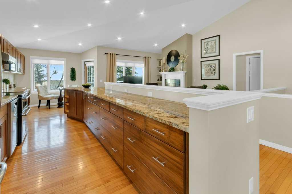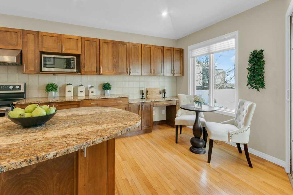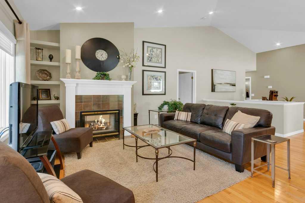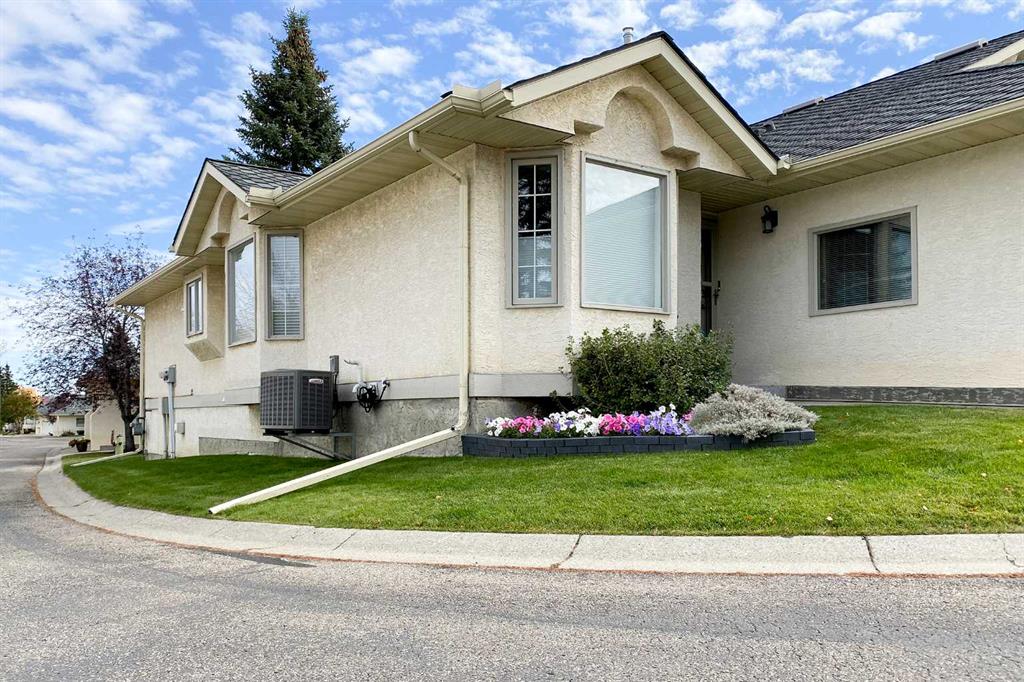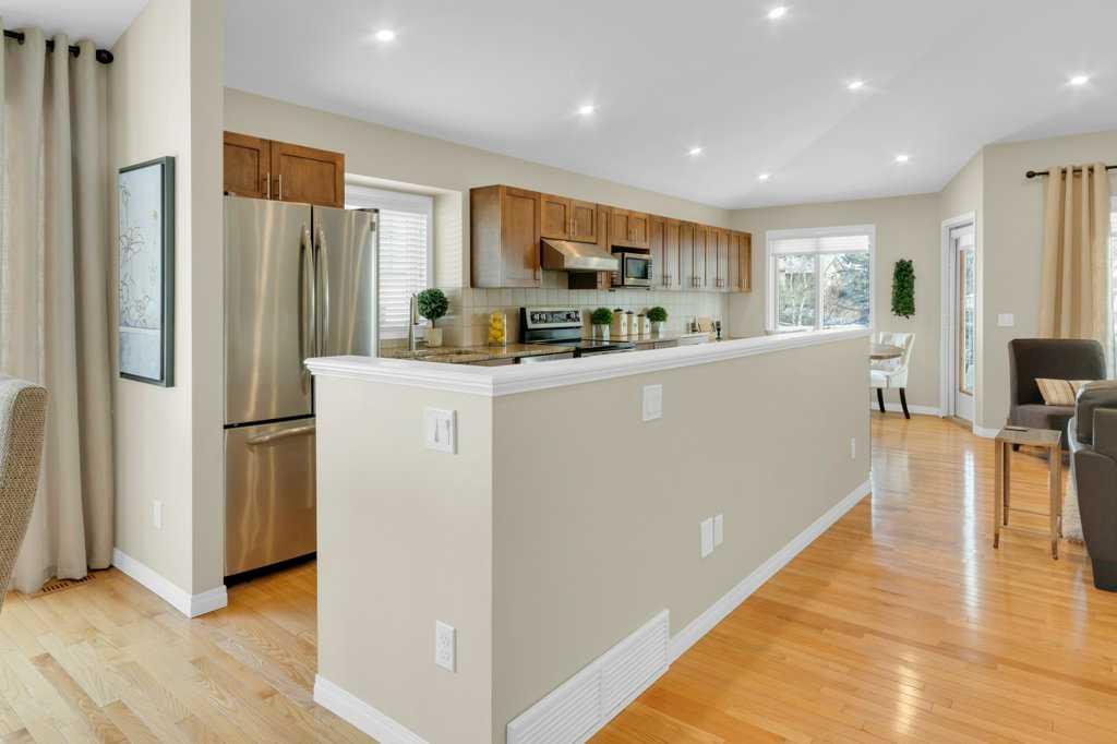 Welcome to this exceptional luxury walkout villa with an attached double garage, perfectly positioned on a premium corner lot within a beautifully maintained and highly sought-after complex. Thoughtfully designed and extensively upgraded, this home offers an ideal blend of elegance, comfort, and low-maintenance living. The open-concept main floor is highlighted by rich hardwood flooring and soaring vaulted ceilings, creating an inviting space ideal for both everyday living and entertaining. The chef’s kitchen is the heart of the home, featuring a striking 16-foot granite island and abundant cabinetry, seamlessly flowing to the deck with a gas line for barbecuing. A formal dining room and separate nook provide flexible gathering spaces, while the living room showcases a stunning double-sided fireplace shared with the spacious main-floor primary suite. The primary retreat includes a walk-in closet and a luxurious five-piece ensuite. A den/home office, powder room, main-floor laundry, and quality Hunter Douglas blinds to complete the level. The lower level walkout expands the living space with a large family room featuring an electric fireplace, offering a warm and versatile area ideal for relaxing, entertaining, or incorporating a home office. This level also offers a generous bedroom, a four-piece bathroom, an impressive full-width storage room, and direct access to a private patio, perfect for quiet mornings or relaxed evenings outdoors. Additional highlights include central air conditioning, a high-efficiency furnace, poly-B plumbing fully replaced, Luxury Vinyl Plank in lower level, flat painted ceilings, and numerous LED pot lights for a modern, polished finish. Beyond the home, residents enjoy a warm and welcoming community with optional summer gatherings at the central gazebo and an annual Stampede barbecue, creating relaxed opportunities to connect and build lasting friendships. Conveniently located close to shopping, transit, and Stoney Trail, this beautifully upgraded villa offers an exceptional lifestyle in a truly special setting. A rare opportunity to enjoy luxury villa living in a friendly, community-focused environment.