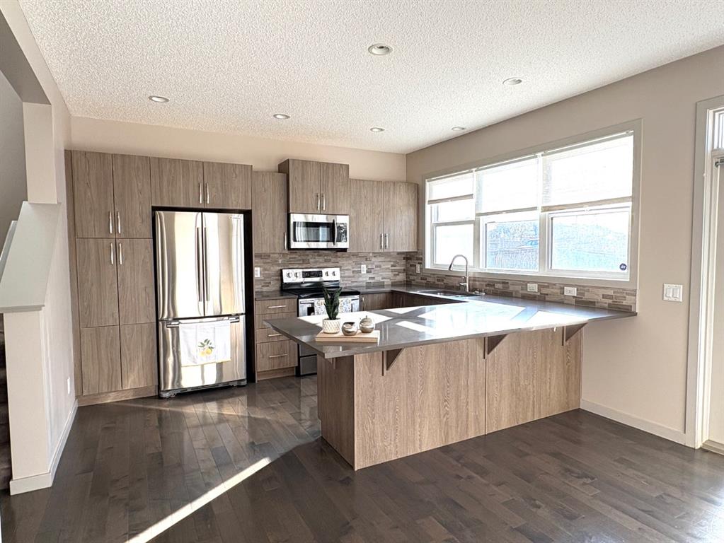 The open-concept main floor features a welcoming front entry and spacious great room with beautiful antique-grey laminate flooring throughout. A designated dining area adjoins the functional kitchen, which offers a large flush-height eating bar, quartz countertops, pantry, and upgraded stainless-steel appliances including a refrigerator, smooth-top stove, built-in dishwasher, and over-the-range microwave.