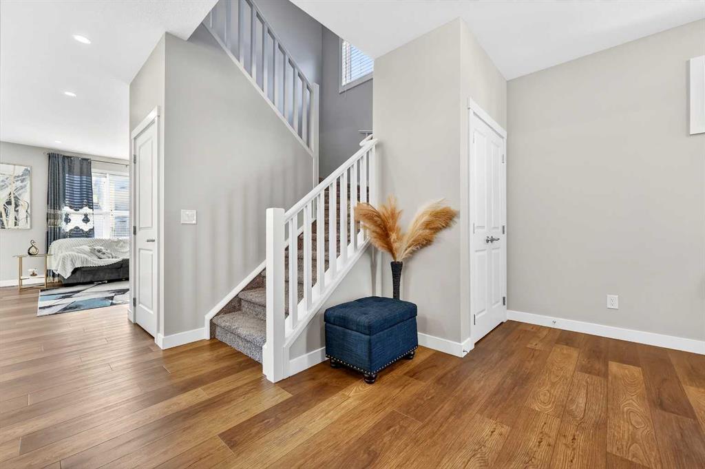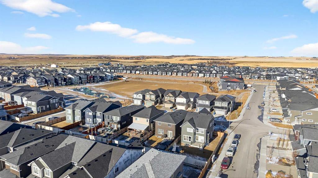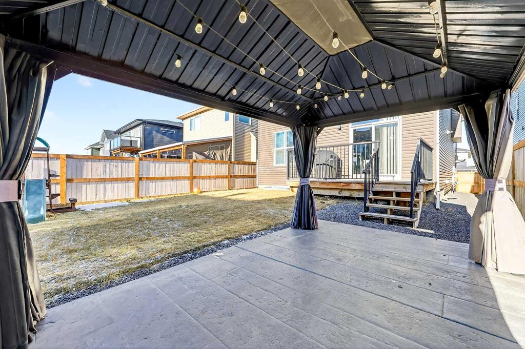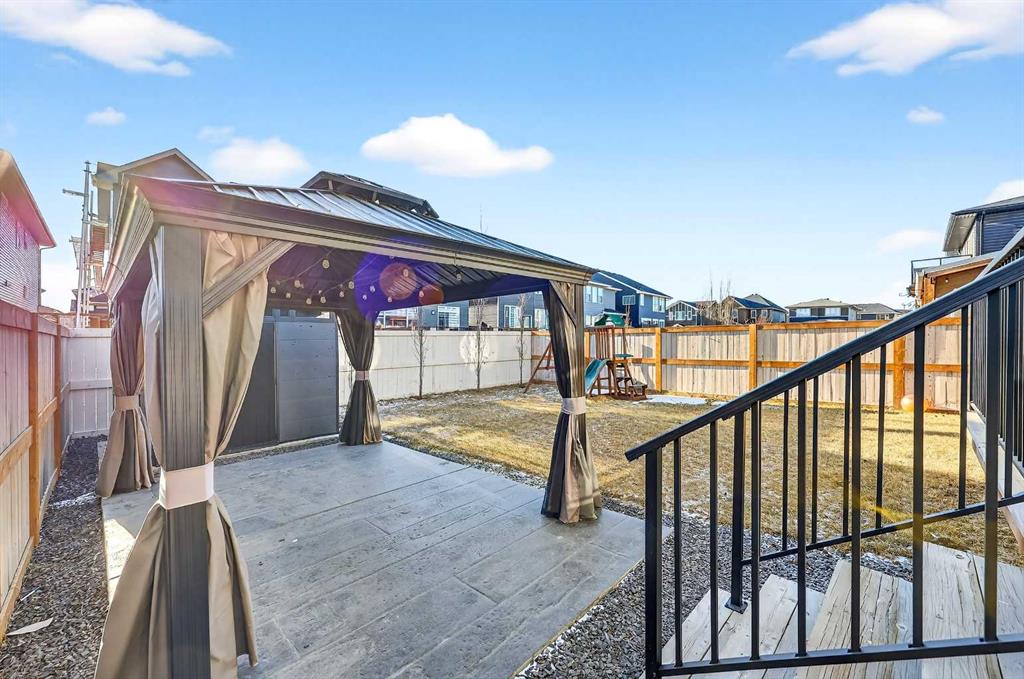 Welcome to this beautifully maintained Trico-built home (2020), offering over 3,400 sq. ft. of fully developed living space, ideally located steps away from a park in the desirable community of Evanston. With 5 bedrooms, 3.5 bathrooms, a sunny south-facing backyard, and a double attached garage, this home shows true pride of ownership throughout. The main level is thoughtfully designed for both everyday living and entertaining. At the heart of the home is the chef’s kitchen, featuring quartz countertops, stainless steel appliances, a large breakfast bar, under the counter led lighting and a walk-through pantry for added convenience. The kitchen flows seamlessly into the spacious dining area and bright living room, highlighted by a cozy gas fireplace and abundant natural light. Sliding doors off the dining room lead to the back deck, extending your living space outdoors. A private den, perfect for a home office, along with a 2-piece powder room and a functional mudroom with garage access, complete this level. Durable luxury vinyl plank (upgraded within the last 3 months), tile, and carpet flooring run throughout the home, complemented by modern lighting with auto sensors. Upstairs, you’ll find a generous bonus room ideal for family gatherings, media space, or guests. The primary suite is a true retreat, offering his and hers walk-in closets and a spa-inspired 5-piece ensuite with dual vanities, a soaker tub, and a walk-in shower. Two additional well-sized bedrooms are thoughtfully positioned on this level, along with a 4-piece bathroom. A convenient upper-floor laundry room with shelving and storage adds everyday practicality. The recently developed and fully finished basement (with permits pulled) expands the living space even further. Designed with modern halo lighting, this level features a large family room, two spacious bedrooms, and a stylish 3-piece bathroom with a walk-in shower. A high-efficiency furnace ensures comfort and energy efficiency year-round. Enjoy the sunny south-facing backyard, complete with a deck, a gas bbq line, gazebo set on a concrete pad, shed, and playset—all included. This outdoor space is perfect for relaxing, entertaining, or family enjoyment, while the north-facing front ensures balanced natural light throughout the day. Some noteworthy mentions include, all cabinet doors and toilets are soft close, and the house is located within a 30 km school zone. Recent upgrades include a new roof and siding, adding peace of mind for years to come.