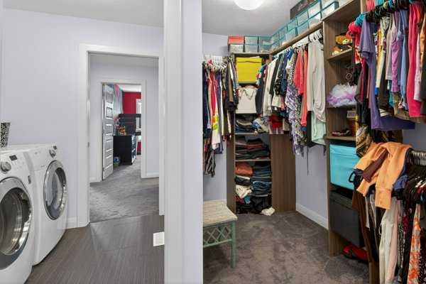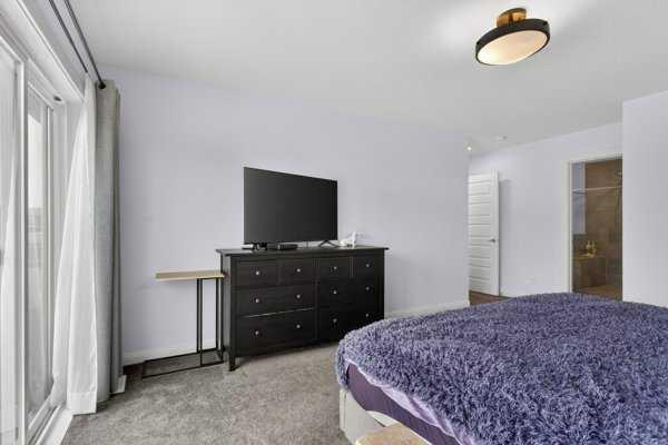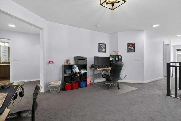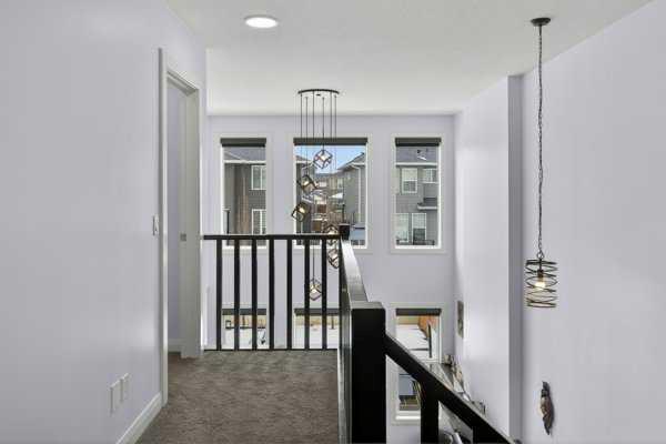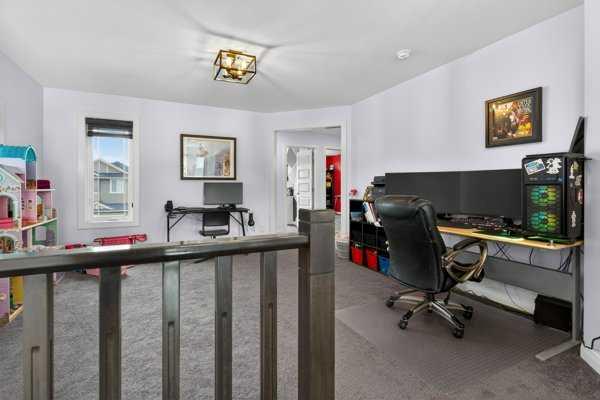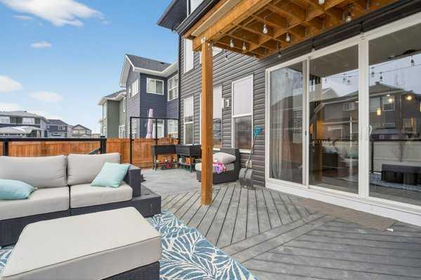 Perfectly positioned across from North Evanston Field and Park, this exceptional family home offers the space, light, and layout today’s families are looking for. The main floor is anchored by a stunning two-storey living room with a full wall of windows stretching both levels—flooding the home with natural south-facing light and creating an open, airy feel you notice the moment you walk in. The dining area connects seamlessly to the sunny deck, making indoor-outdoor living easy for everyday life and entertaining. The kitchen is both practical and well-finished, featuring maple cabinetry, granite countertops, upgraded appliances, a large central island, and an oversized walkthrough pantry. A main floor office adds flexibility for working from home or managing a busy household. Upstairs, the primary suite is designed as a comfortable retreat with a 5-piece ensuite including a curbless tiled shower, soaker tub, and double vanities. The walk-in closet connects directly to the laundry room for added convenience, and a private upper Dec-Tek deck off the primary bedroom offers a quiet space to step away and unwind. Two additional bedrooms complete the upper level. The basement remains undeveloped, offering future potential, while currently set up as a fun and creative kids’ space with play features including tunnels, climbing elements, and open recreation areas. Outside, the backyard is a standout. A high-quality upper deck is paired with a custom lower composite deck in a herringbone pattern with glass railing, centered around a hot tub—creating a rare and functional outdoor living space. Additional features include air conditioning, basement bathroom R/I, basement R/I in-ground sprinkler system, and 220V power in the garage for EV charging. Located in a highly sought-after, family-friendly community close to parks, pathways, schools, and shopping, this home offers a great balance of comfort, function, and location.