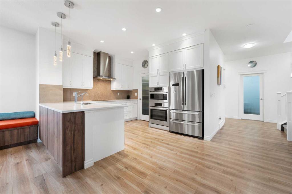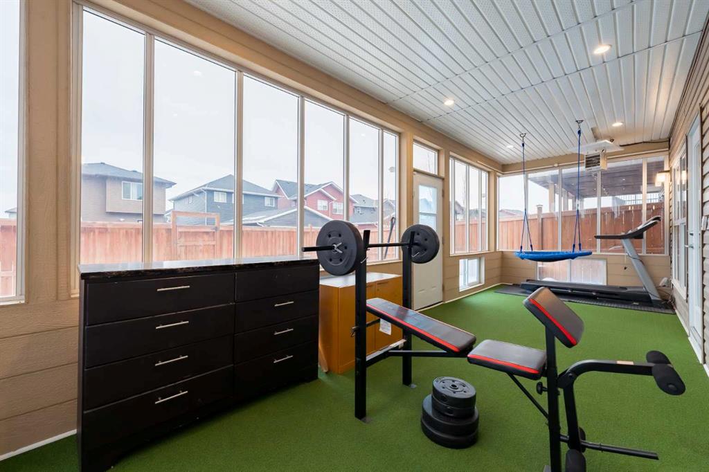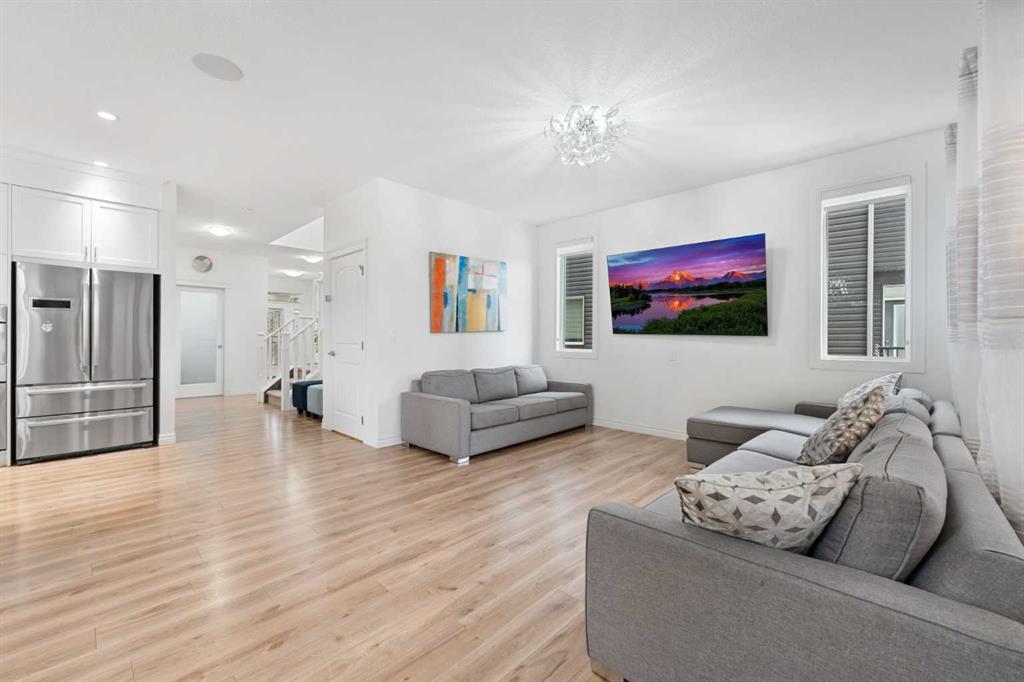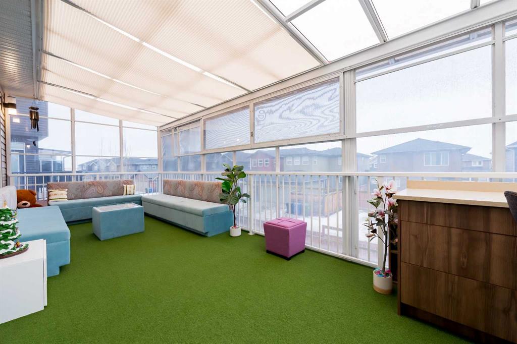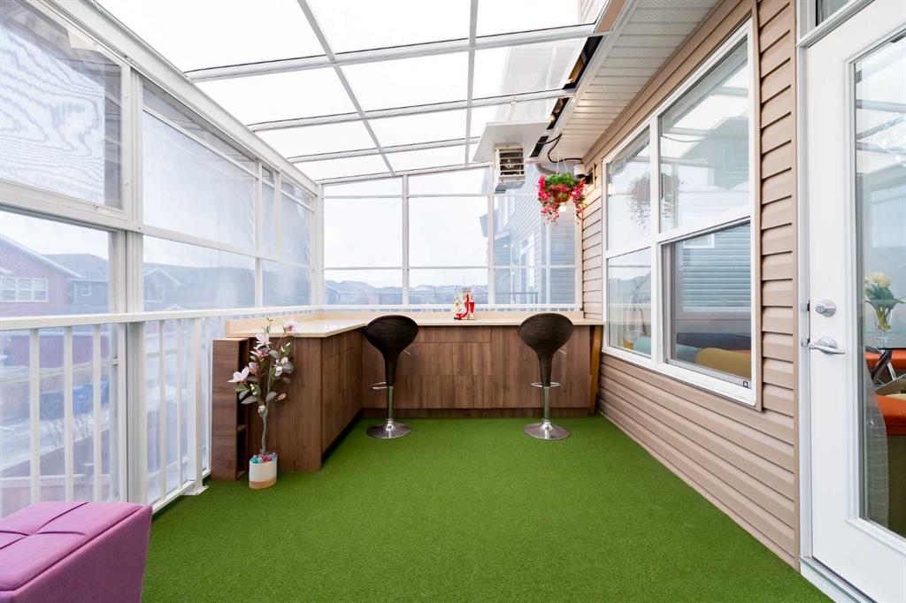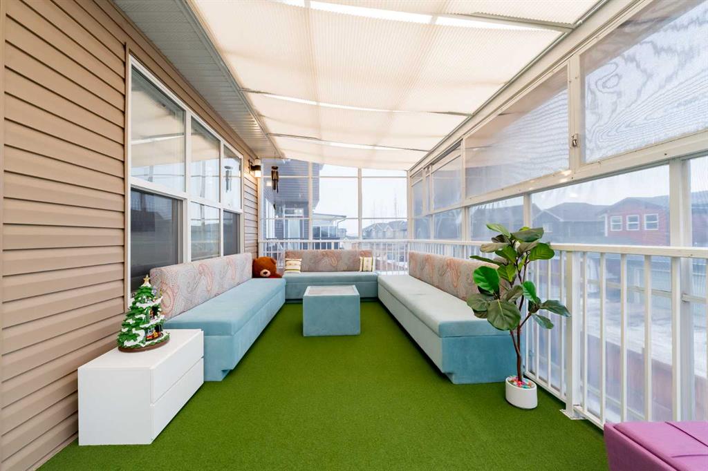 *** Watch the Virtual Video Tour***. Fully developed with a walkout basement, approximately 3,300 sq. ft. of total developed living space, two three-season sunrooms (approx. 450 sq. ft.), a 6.4 kW solar panel system (16 panels), a 200-amp electrical panel, epoxy flooring in the garage, and low-maintenance artificial turf in the backyard—features like these are rarely found at this price point**. Welcome to this beautifully upgraded home in the highly sought-after community of Evanston, situated on a traditional 35-ft-wide lot and offering approximately 3,300 sq. ft. of fully developed living space. The main floor features a private office/den, a spacious, sun-filled living area with large windows, a dining area with custom seating, and elegant high-end laminate flooring, complemented by 9-foot ceilings. The chef’s kitchen is designed to impress, featuring quartz countertops, under-cabinet lighting, ceiling-height cabinetry, and premium stainless-steel appliances, including a Bosch built-in oven and microwave. A walk-through pantry with durable titanium wire shelving adds everyday convenience. A convenient half bath (with potential to convert to a full bath) and a three-season sunroom just off the living room complete the main level. Upstairs, a large bonus room sits centrally, thoughtfully separating the primary bedroom from the two additional bedrooms. This bonus space includes custom seating—perfect for movie nights or family gatherings. The primary bedroom offers a walk-in closet, a luxurious 5-piece ensuite with dual sinks, a custom standing shower, and a soaker tub. Two additional well-sized bedrooms, an upper-floor laundry room, and a second full bathroom featuring dual sinks and a standing shower with a custom tile base complete the upper level. The fully developed walkout basement offers a wet bar, a four-piece bathroom, and a spacious recreation area ideal for a home theatre, gym, or playroom. A SONOS 7.1 home theatre speaker system and an electric fireplace add comfort and entertainment value. The walkout layout also provides excellent potential to convert the basement into a legal suite (subject to City approval). Located in the vibrant, family-friendly community of Evanston, this home offers easy access to Stoney Trail, top-rated public and Catholic schools (including a new middle school opening soon), parks, walking paths, and nearby shopping centres. Recent updates include: roof and siding (2024), new carpet (2025), and fresh interior paint (2025). A water purifier, water softener, and home theatre system are included in the sale. This home stands out not only for its luxury finishes but also for its energy-efficient upgrades. The 6.4 kW solar panel system (16 panels) significantly reduces electricity costs, offering long-term savings and protection against rising energy prices—an increasingly valuable feature for today’s discerning buyers. Don’t miss this exceptional opportunity—book your private showing today!