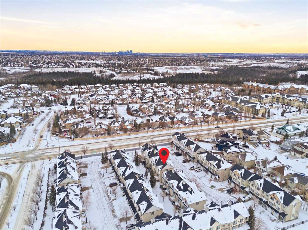 Beautiful sunny end-unit townhome located steps from Fish Creek Park. This low-maintenance townhouse backs onto a green space and features a private deck. The oversized living room offers 14-ft ceilings and tall windows for excellent natural light. Spacious kitchen with maple cabinets, upgraded laminate flooring, black appliances, and a bright breakfast nook.