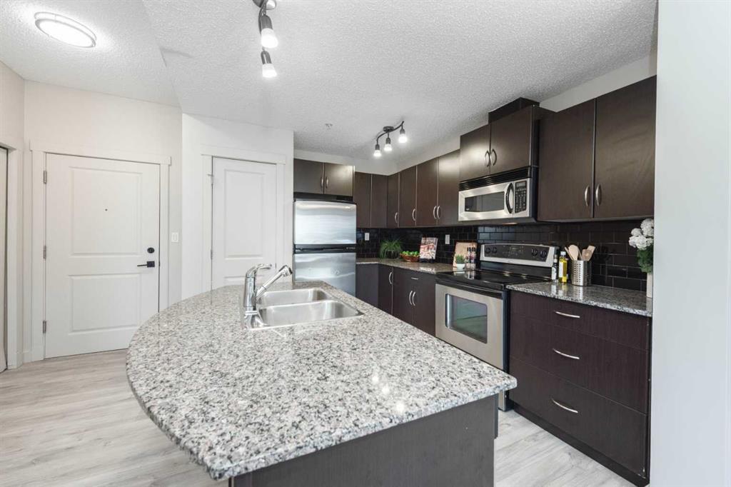 Welcome to Gateway Garrison Green, a beautifully designed, pet friendly, QUIET, CONCRETE-BUILT building, walking distance to Mount Royal University, lush parks and Lincoln Park Shopping Centre, offering a great array of convenient coffee shops, services and restaurants! This is low-maintenance, high-style living in a great community—exactly what you’ve been looking for - perfectly suited for a first-time buyer or savvy investor. This move-in ready suite features freshly painted neutral walls, new luxury vinyl flooring throughout, high 9’ ceilings and a bright, inviting, open-concept layout. The spacious floor plan is perfect for working or studying from home and the large kitchen and dining area make it easy to host family and friends on weekends. The modern kitchen has stylish details including GRANITE countertops, quality cabinetry, pantry and STAINLESS-STEEL appliances. Step outside to the quiet & PRIVATE BALCONY (including gas BBQ hook-up), surrounded by tranquil views of the inner courtyard with its mature trees – a wonderful space to enjoy your peaceful morning coffee or evening wind-down! 4 piece main bath with soaker tub, IN-SUITE LAUNDRY plus a TITLED UNDERGROUND PARKING stall with extra storage completes the package. The condo fees include HEAT, WATER, and ELECTRICITY, making this a worry-free living experience! The building features outstanding resident amenities including a massive gym conveniently located near the unit, a book exchange, on-site management, a guest suite—an incredible bonus that means you can host friends and family without sacrificing your own space, spacious lounge that can be rented for private functions, bike storage and visitor parking. The location can’t be beat – easy access to major transit corridors & public transit options. Call now to book a private showing!