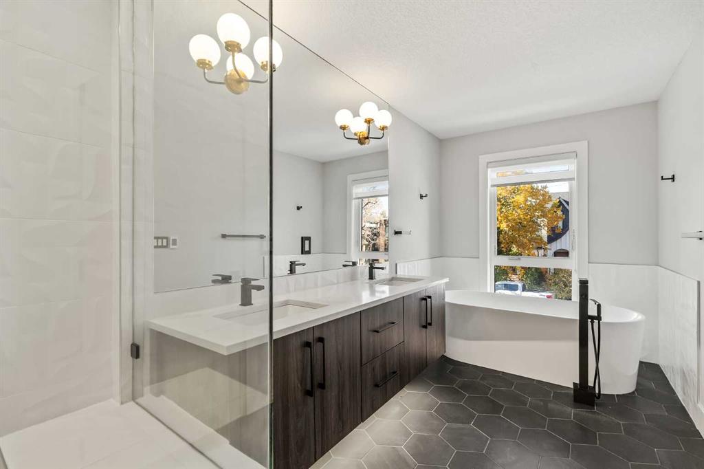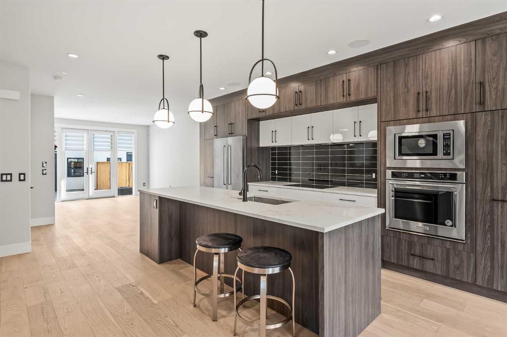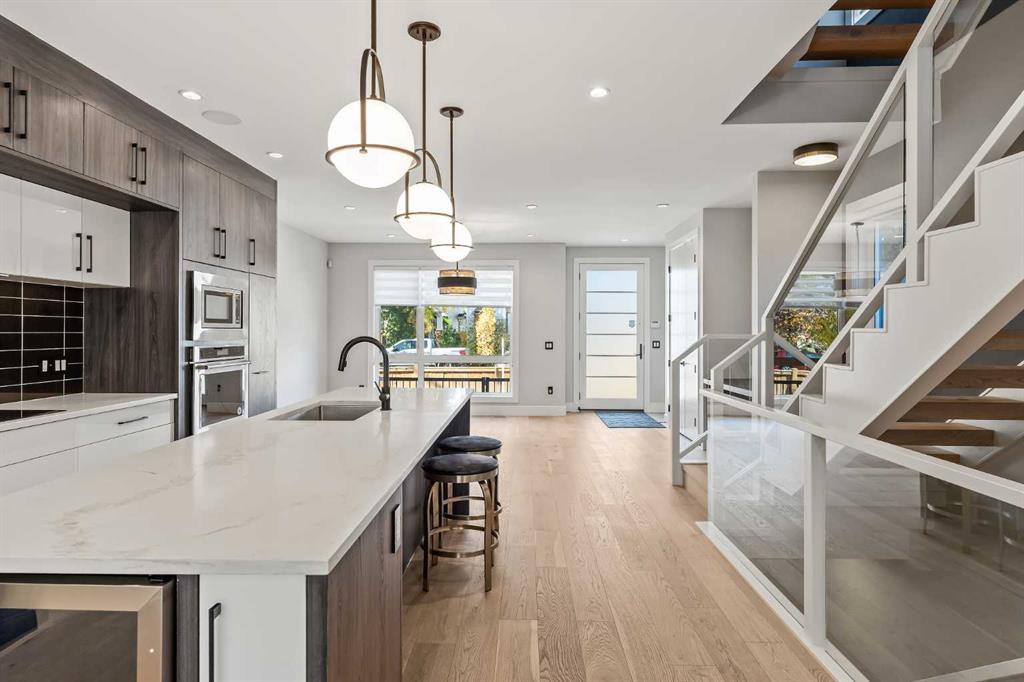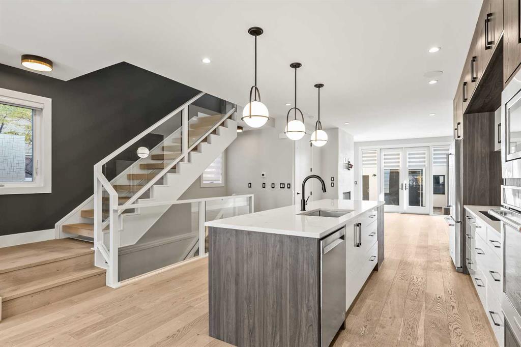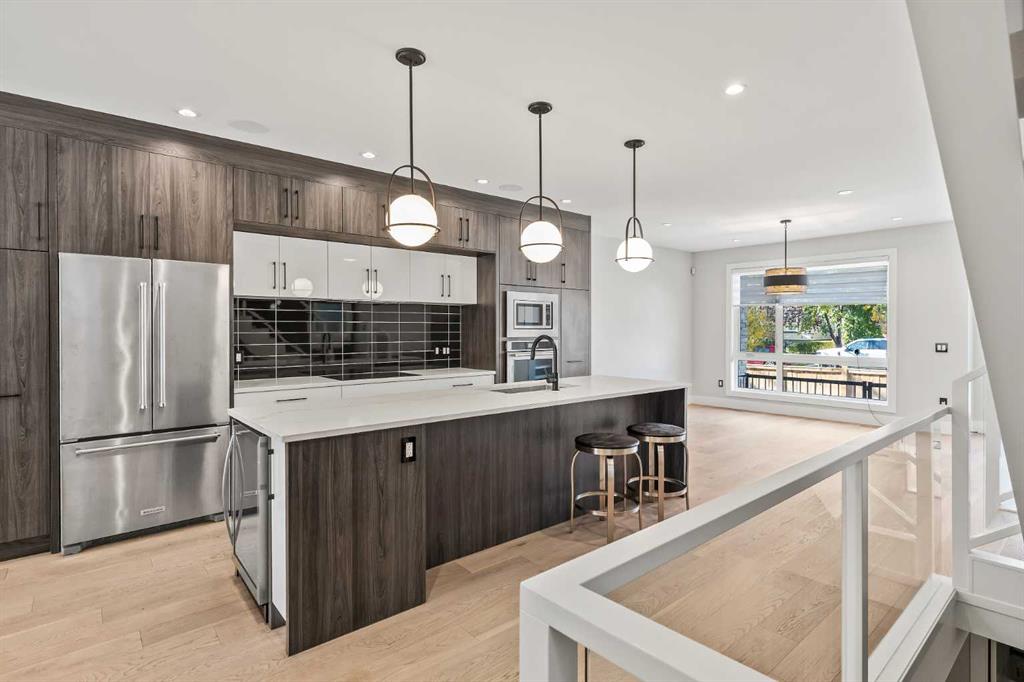 Proudly presenting 720 -15 St. NW. Wonderfully situated in the coveted community of Hillhurst, this 3,800 plus SF custom home presents like new while delivering an impressive list of upscale features including 5 bedrooms (2 primary bedrooms with ensuites), 5 bathrooms (2 steam showers), 2 laundry rooms, 2 fireplaces, a stunning open staircase & ELEVATOR! The bright main floor boasts a designer kitchen with extended cabinetry & pull-out pantry, stainless steel appliances with induction cooktop, beverage fridge, quartz countertops & a vast island with seating for 4. An oversized dining area easily accommodates large gatherings while the stylish living room with fireplace and glass doors opens seamlessly to the backyard. A chic powder room & practical mudroom with built-in storage complete this level. Upstairs, the striking open-riser staircase with glass panels leads to two full floors of hardwood-accented luxury living. The 2nd level is ideal for families offering two spacious secondary bedrooms with closet organizers & a beautifully upgraded 4-piece bath with heated floors. The 1st primary suite shares this level & is an excellent option for parents with young children. Featuring oversized windows, a custom walk-in closet & a spa-inspired ensuite with dual sink quartz vanity, freestanding tub, steam shower, & heated floors. A well-equipped laundry room with sink, quartz folding counter, & cabinetry adds convenience to this level. The 3rd floor is dedicated to refined living, highlighting a 2nd primary retreat with walk-in closet, lavish ensuite (dual quartz vanity, freestanding tub, steam shower, heated floors) & access to a sun-drenched private balcony overlooking the treetops. A spacious owner’s lounge with wet bar provides the perfect setting to relax, work from home, or enjoy quiet evenings. Completing this floor is a 2nd laundry room. The lower level brings family & friends together in a cozy family room with fireplace & a full wet bar with beverage fridge. A large 5th bedroom & 5th bathroom with heated floors round off this comfortable space. Other notable upgrades in this executive residence include a double insulated & drywalled garage with unique front & back doors allowing for additional parking, air conditioning, in-floor heating in ALL bathrooms, an elevator to age-in-place or accommodate multi-generational living, custom built-ins in ALL closet, a 75-gallon hot water tank, 200-amp electrical panel, built-in ceiling speakers & security system. Nestled just steps to parks, trendy restaurants, & the vibrant Kensington district, this luxury property offers a perfect balance of tranquillity & urban convenience. Its proximity to the Bow River, downtown, University of Calgary, SAIT & Foothills Hospital provides a remarkable location for work & play. With easy access to Memorial Drive & Crowchild Trail, this is a rare opportunity to own a magnificent property in one of Calgary’s most desirable neighbourhoods.