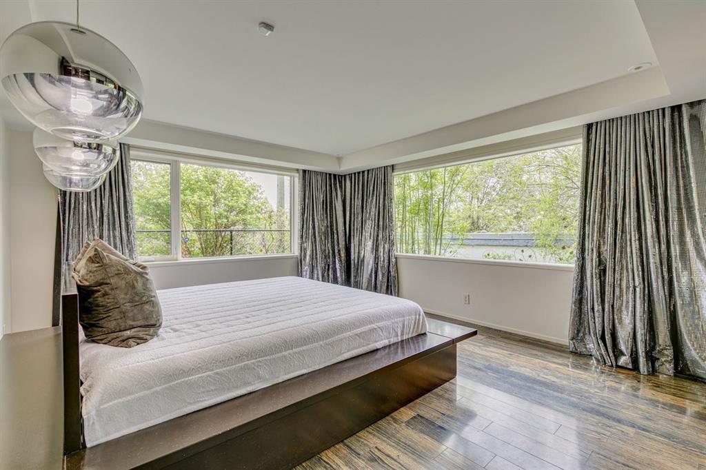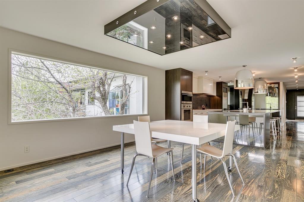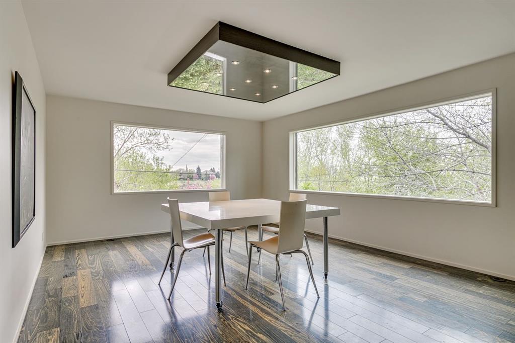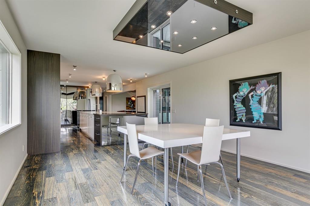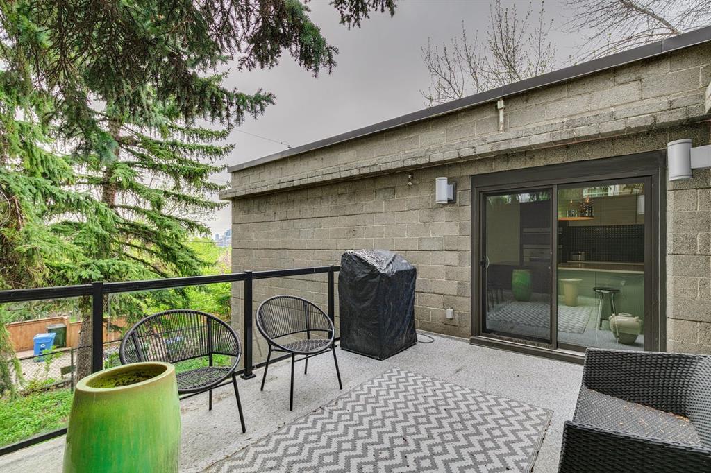 A masterful modern renovation infused with the timeless elegance of 1950s design. Perched on a coveted ridge lot in prestigious Briar Hill, this exceptional hillside walk-out captivates from the moment you arrive. A lush canopy of mature trees and sculpted landscaping welcomes you, setting the tone for what lies beyond. Step into an expansive sunroom bathed in natural light, with soaring skylights and walls of glass that blur the line between indoors and nature. It's the perfect sanctuary to unwind—whether you're sipping a fine wine or indulging in a favourite novel, enveloped in serene beauty. Step into a grand foyer featuring sculptural concrete wall elements and a sleek glass-railed staircase that set the tone for sophisticated living. The front den offers a quiet retreat, while the expansive living room seamlessly flows toward the rear deck, perfectly framed by mature evergreens that provide unparalleled privacy. Crafted for both style and function, the kitchen and dining areas are an entertainer’s dream. The kitchen exudes contemporary glamour with pristine white cabinetry, a mirrored pantry and backsplash, and mid-century lighting. An oversized eat-up island anchors the space, offering abundant storage, while a suite of top-tier appliances, including a Viking wall oven, Miele microwave and dishwasher, a Sub-Zero refrigerator, and a Gaggenau cooktop complete the look. The adjoining dining room is truly impressive in scale and design, offering sweeping views of the Downtown skyline, a stunning backdrop for unforgettable gatherings. Descending to the lower level, you're greeted by rich hardwood floors and subtle stair lighting that create an inviting ambiance. This level is thoughtfully designed as a private retreat, with dedicated spaces for work and rest. The sophisticated home office is enclosed with smoked glass doors and enhanced by custom built-in cabinetry, while a striking feature wall conceals cleverly integrated storage. Three generously sized bedrooms are tucked away on this level, along with a beautifully appointed full bathroom. The primary suite is set apart for ultimate seclusion, enveloped by expansive windows that frame the surrounding landscape. Indulge in a lavish ensuite featuring a deep soaker tub, a sleek glass enclosed shower, and a fully customized walk-in closet—crafted for both luxury and functionality. For the gardening enthusiast, the secluded rear and side yards offer a canvas to create your own private outdoor sanctuary; lush, serene, and tailored to your vision. Thoughtfully integrated into the design, an expansive under deck storage area provides a secure and discreet solution for all your seasonal essentials, ensuring both elegance and practicality are maintained. This Homs is truly in an unbeatable location ideally situated within walking distance to multiple recreational facilities, public transit, the downtown core, Kensington, SAIT, schools, and both the Foothills and The Alberta Children's Hospital.