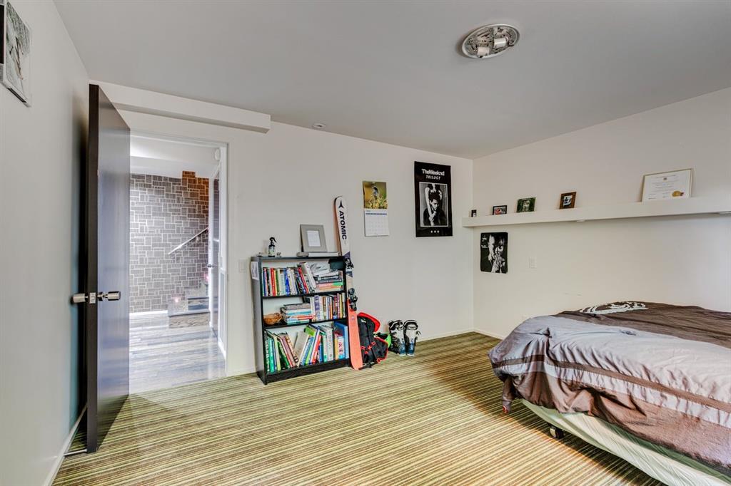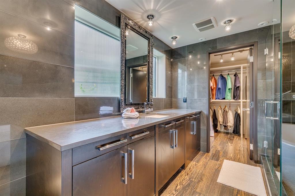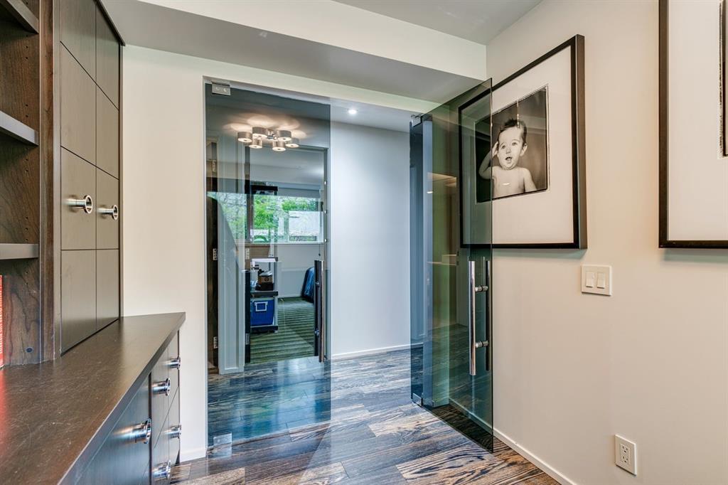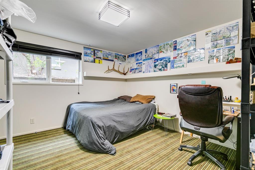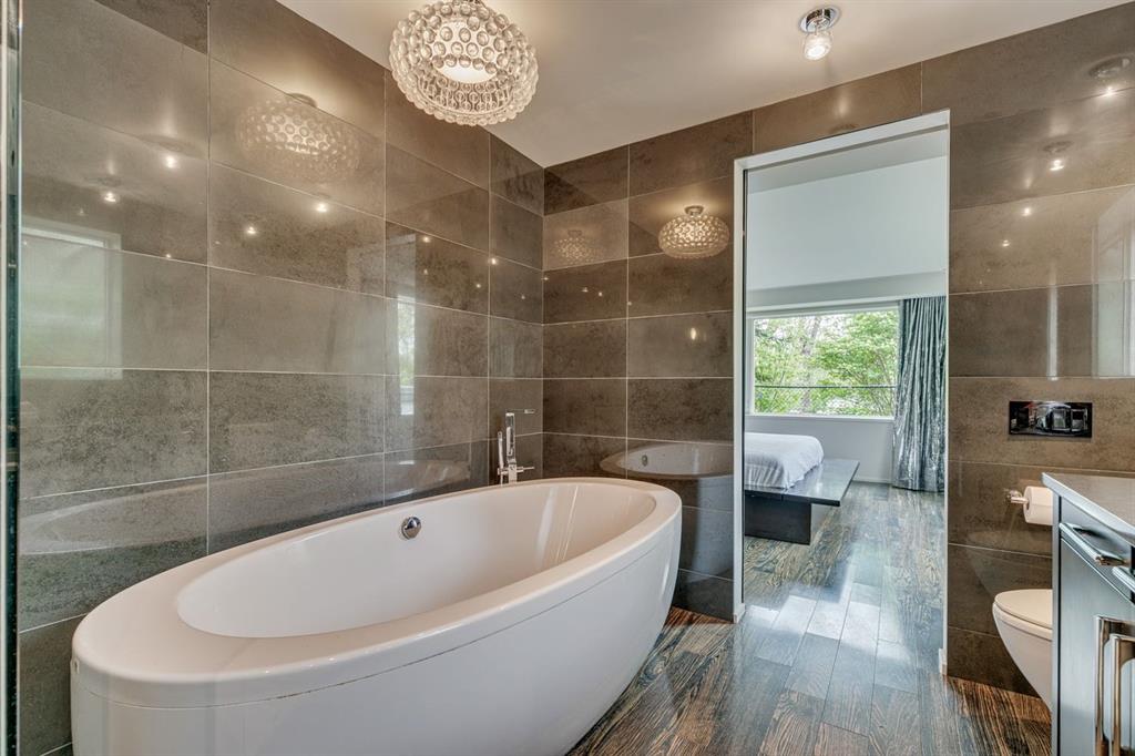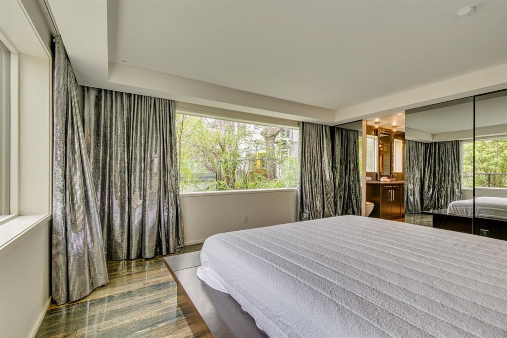 A masterful modern renovation infused with the timeless elegance of 1950s design. Perched on a coveted ridge lot in prestigious Briar Hill, this exceptional hillside walk-out captivates from the moment you arrive. A lush canopy of mature trees and sculpted landscaping welcomes you, setting the tone for what lies beyond. Step into an expansive sunroom bathed in natural light, with soaring skylights and walls of glass that blur the line between indoors and nature. It's the perfect sanctuary to unwind—whether you're sipping a fine wine or indulging in a favourite novel, enveloped in serene beauty. Step into a grand foyer featuring sculptural concrete wall elements and a sleek glass-railed staircase that set the tone for sophisticated living. The front den offers a quiet retreat, while the expansive living room seamlessly flows toward the rear deck, perfectly framed by mature evergreens that provide unparalleled privacy. Crafted for both style and function, the kitchen and dining areas are an entertainer’s dream. The kitchen exudes contemporary glamour with pristine white cabinetry, a mirrored pantry and backsplash, and mid-century lighting. An oversized eat-up island anchors the space, offering abundant storage, while a suite of top-tier appliances, including a Viking wall oven, Miele microwave and dishwasher, a Sub-Zero refrigerator, and a Gaggenau cooktop complete the look. The adjoining dining room is truly impressive in scale and design, offering sweeping views of the Downtown skyline, a stunning backdrop for unforgettable gatherings. Descending to the lower level, you're greeted by rich hardwood floors and subtle stair lighting that create an inviting ambiance. This level is thoughtfully designed as a private retreat, with dedicated spaces for work and rest. The sophisticated home office is enclosed with smoked glass doors and enhanced by custom built-in cabinetry, while a striking feature wall conceals cleverly integrated storage. Three generously sized bedrooms are tucked away on this level, along with a beautifully appointed full bathroom. The primary suite is set apart for ultimate seclusion, enveloped by expansive windows that frame the surrounding landscape. Indulge in a lavish ensuite featuring a deep soaker tub, a sleek glass enclosed shower, and a fully customized walk-in closet—crafted for both luxury and functionality. For the gardening enthusiast, the secluded rear and side yards offer a canvas to create your own private outdoor sanctuary; lush, serene, and tailored to your vision. Thoughtfully integrated into the design, an expansive under deck storage area provides a secure and discreet solution for all your seasonal essentials, ensuring both elegance and practicality are maintained. This Homs is truly in an unbeatable location ideally situated within walking distance to multiple recreational facilities, public transit, the downtown core, Kensington, SAIT, schools, and both the Foothills and The Alberta Children's Hospital.